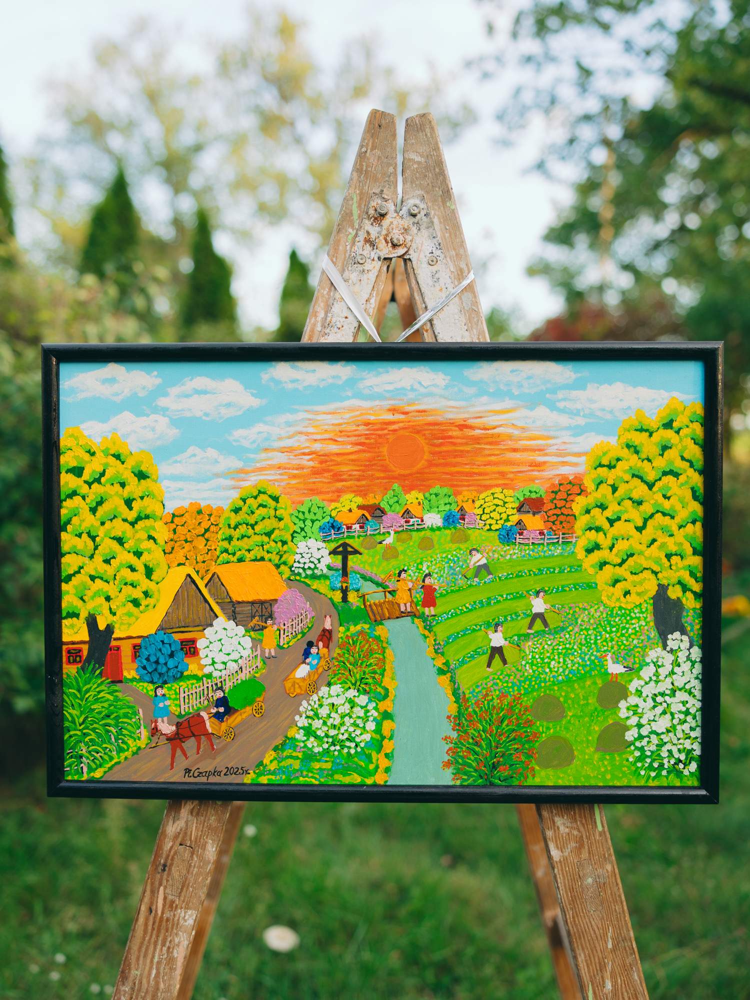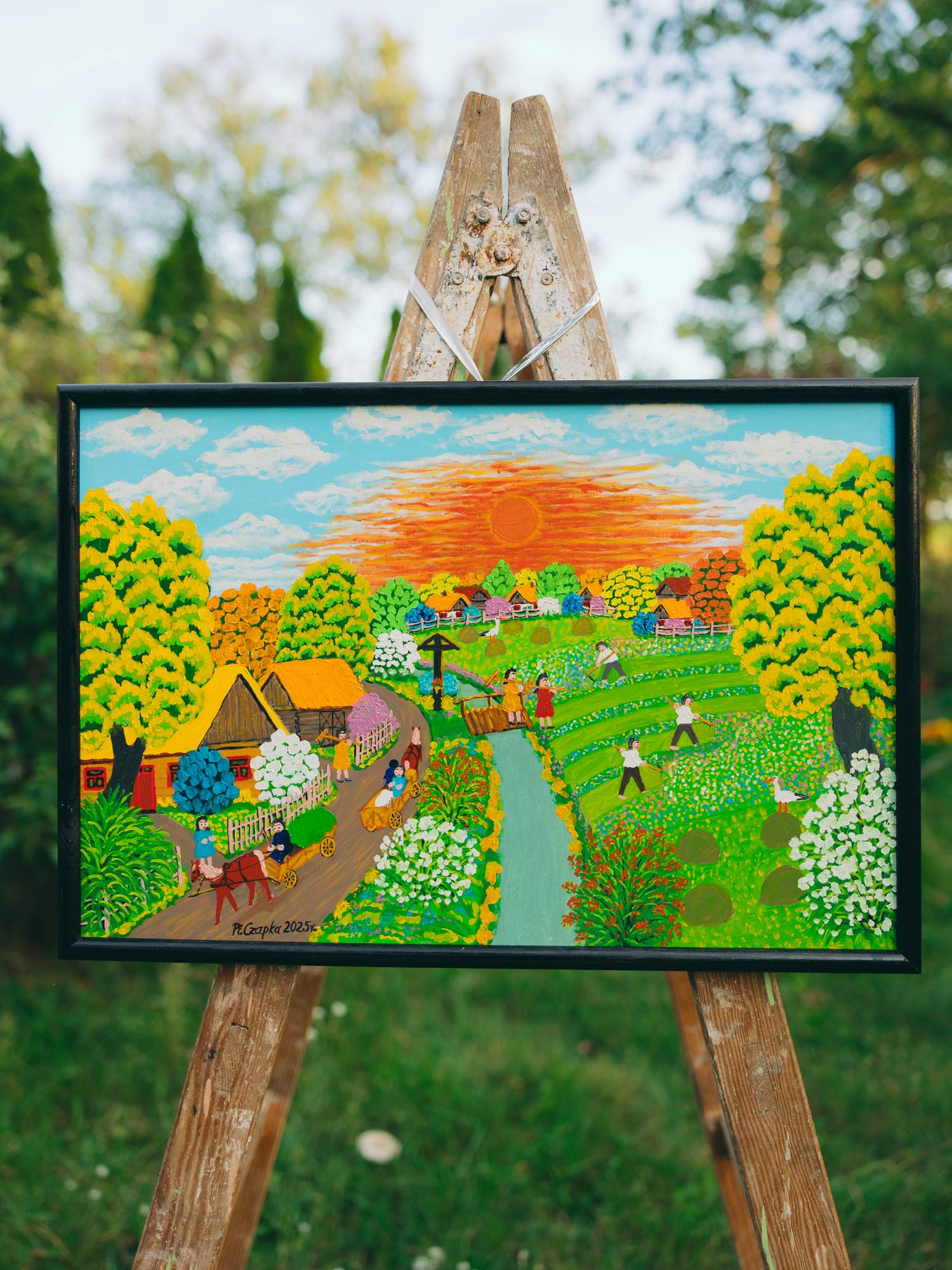 Obraz przedstawia wiejskie życie podczas sianokosów. Na drodze jadą wozy zaprzężone w konie, obok stoją chaty otoczone roślinnymi elementami. Na zielonej łące widać ludzi pracujących, którzy koszą trawę kosami i zbierają siano. W tle znajdują się kolejne domki wśród drzew, ogrodzone białym płotem. Na niebie zachód mocno pomarańczowego słońca. Obraz wykonany farbami olejnymi.