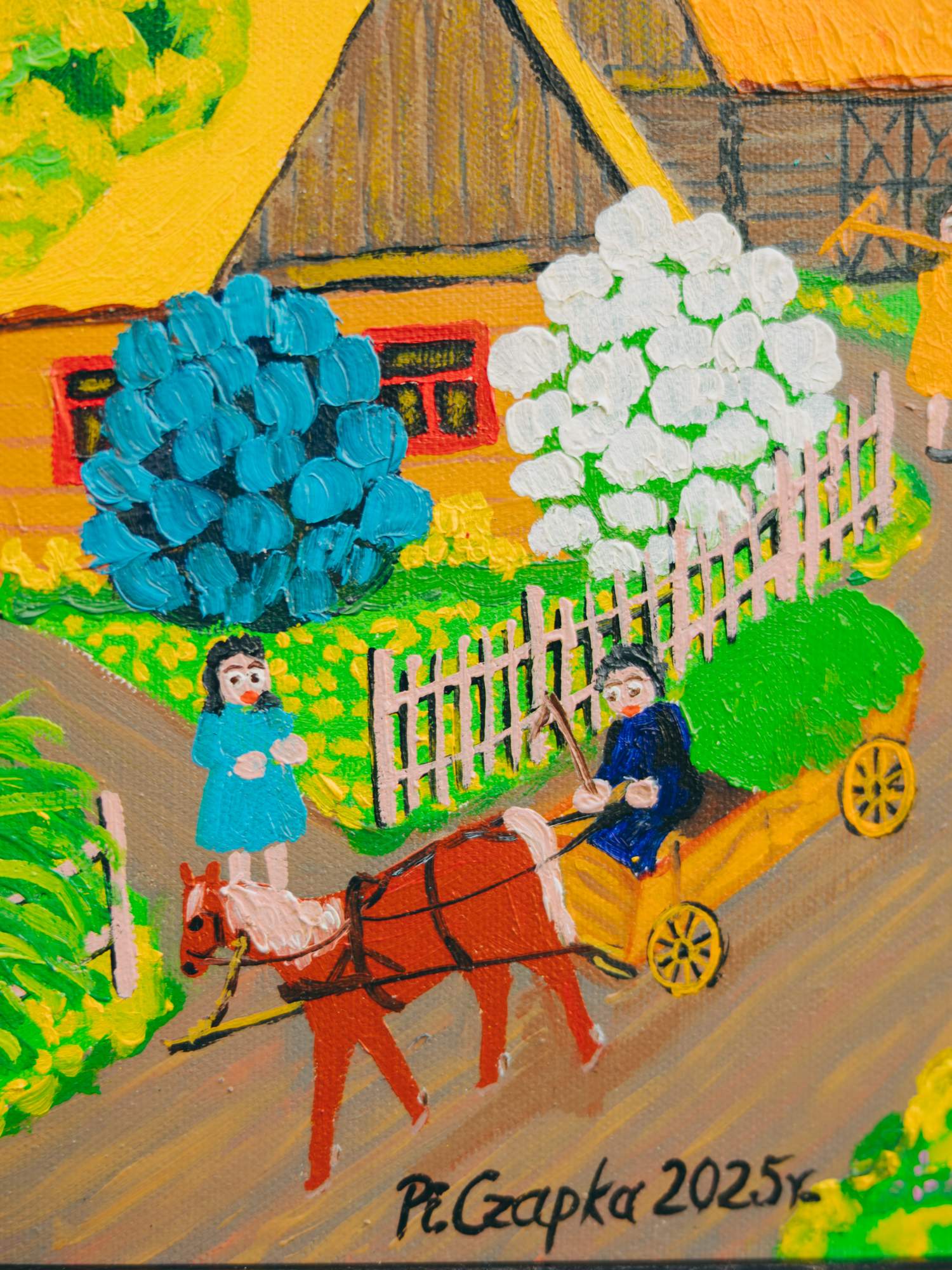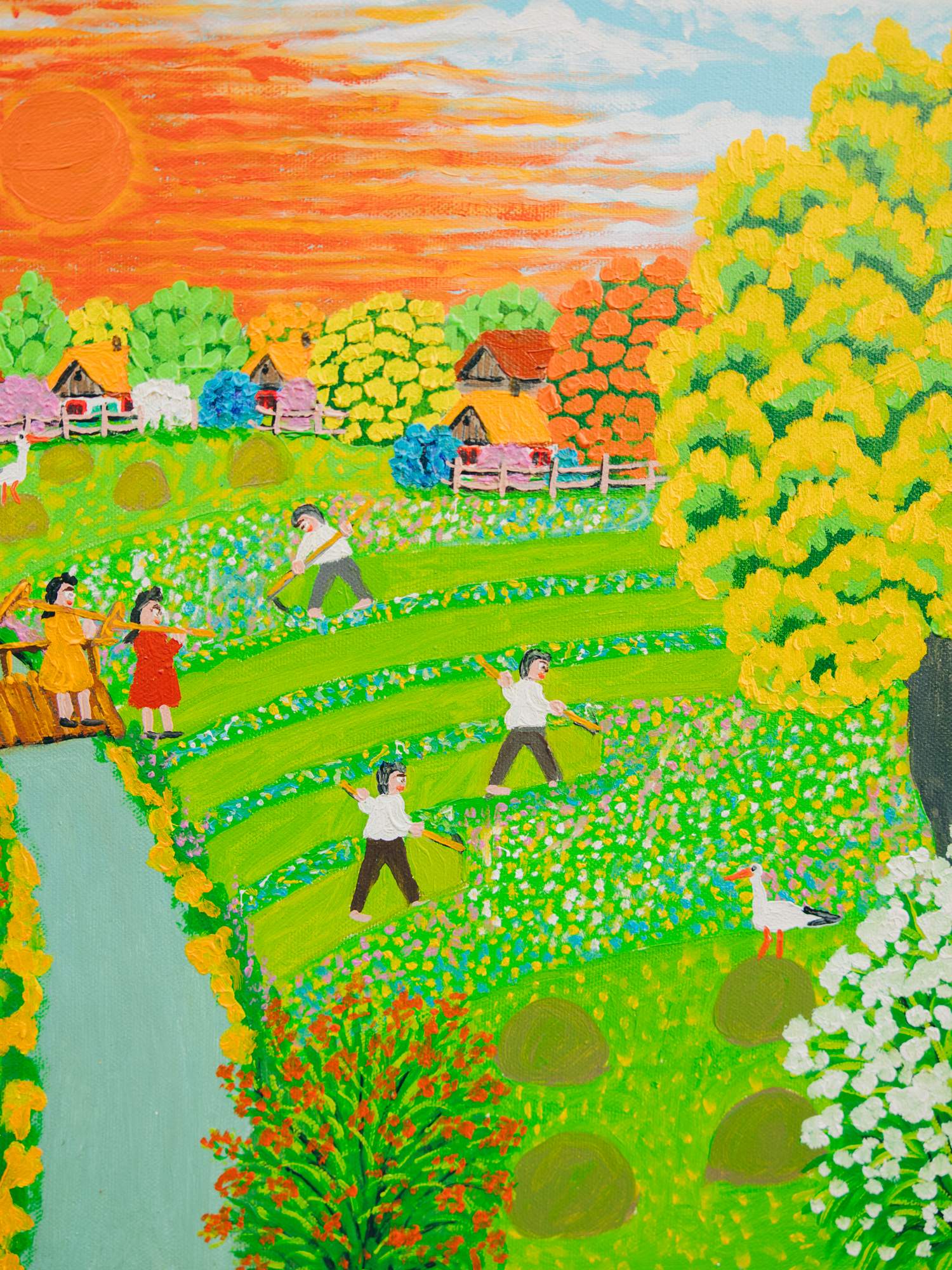 Ręcznie malowany obraz przedstawiający wiejską scenę podczas sianokosów.
