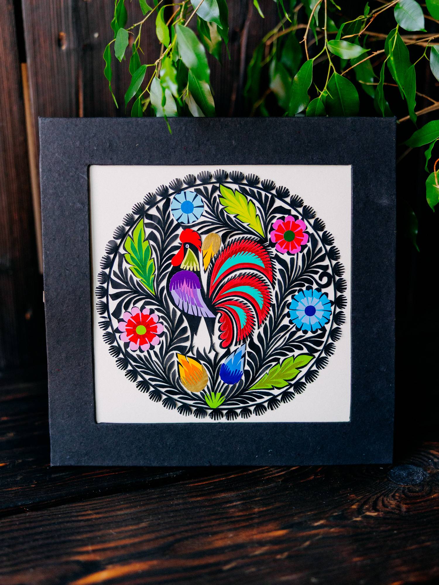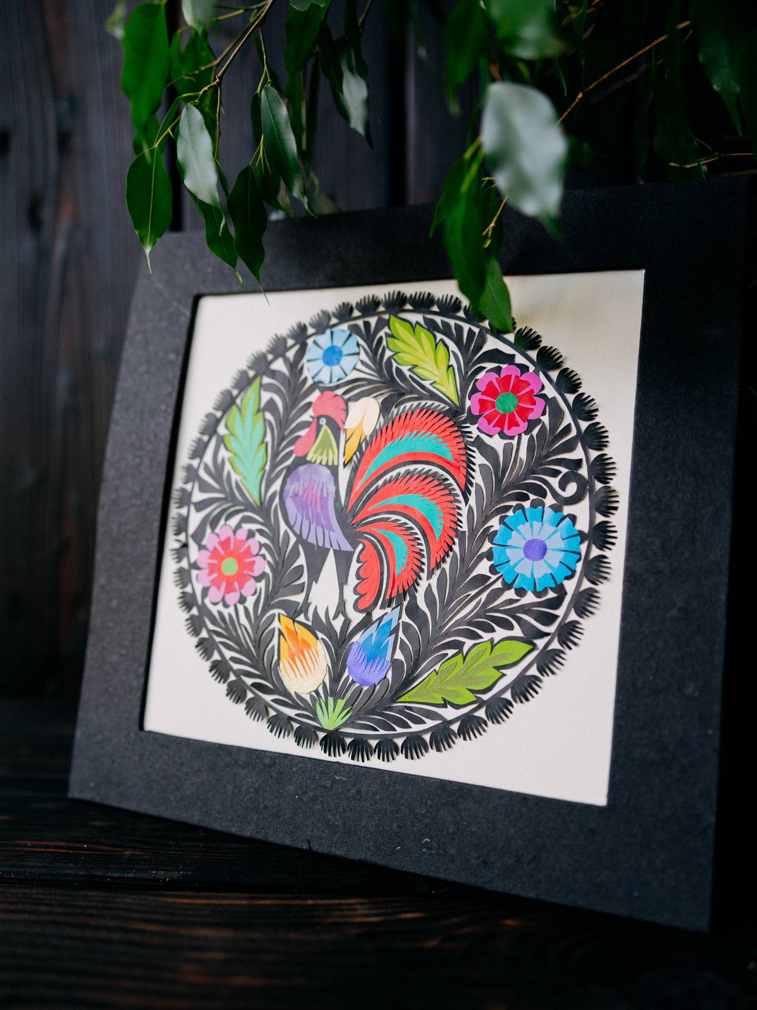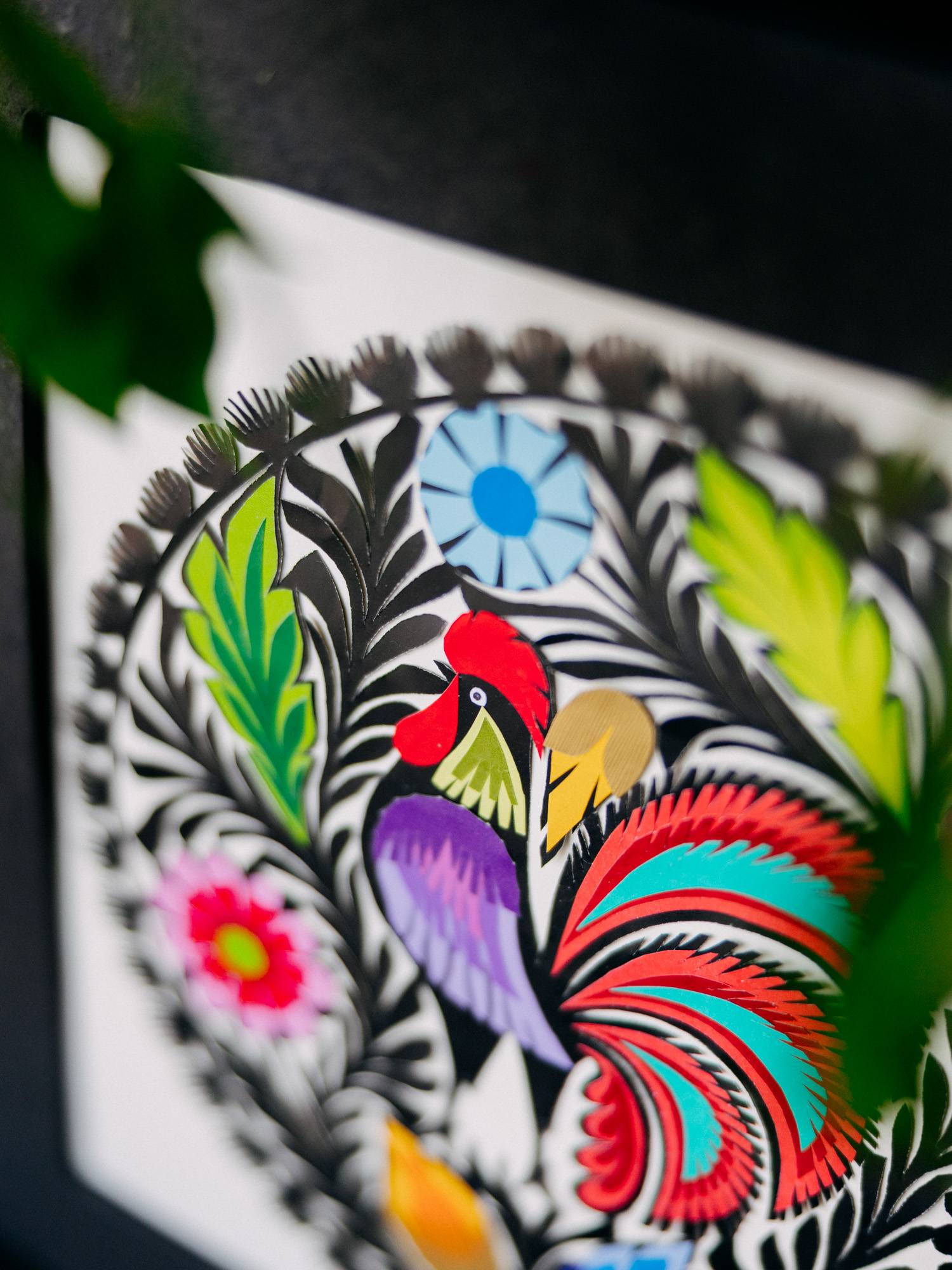 Łowicka wycinanka oprawiona w ramie to idelany pomysł na prezent i nie tylko. Doda uroku i ludowego akcentu dla Twojego domu.