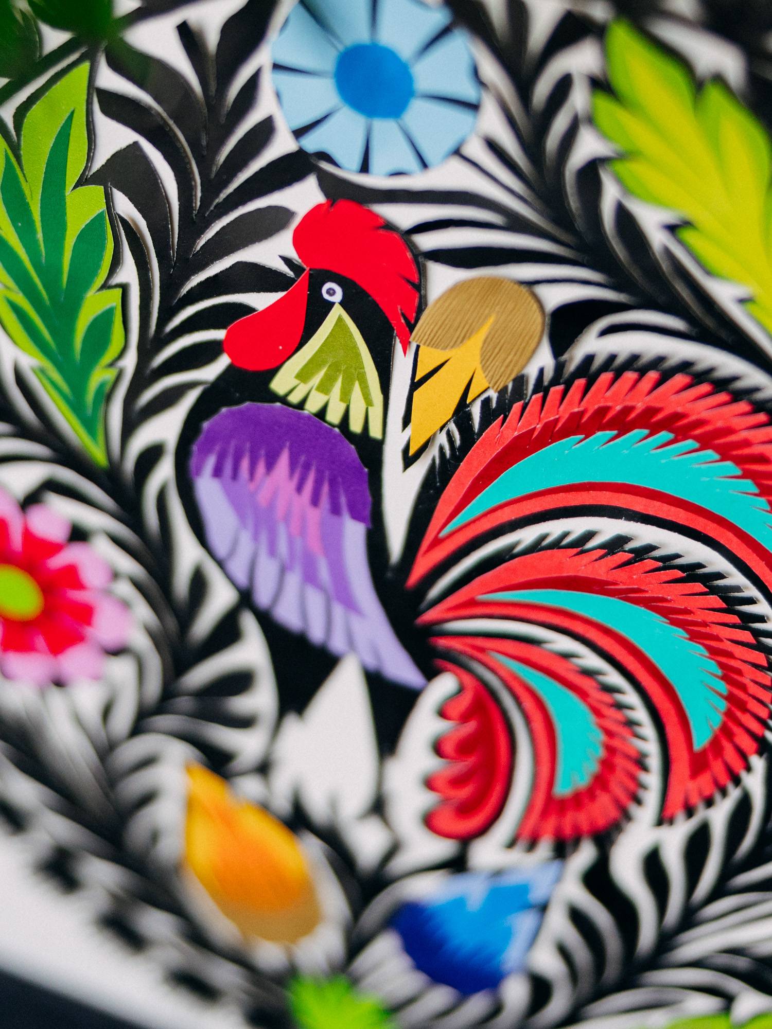 Ludowa wycinanka z fioletowym kogutem oraz z kolorowymi kwiatami, wykonana przez Twórczynie Ludową z Łowicza tradycyjnymi technikami. Wklejona na papier o charakterystycznej barwie, który swoim kolorem sprawia, że wycinanka wygląda jak z lat 70.