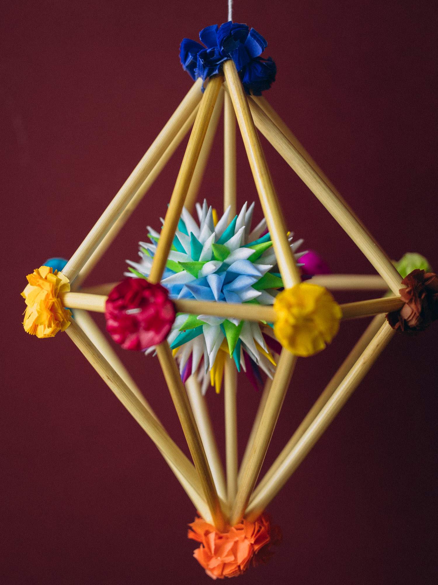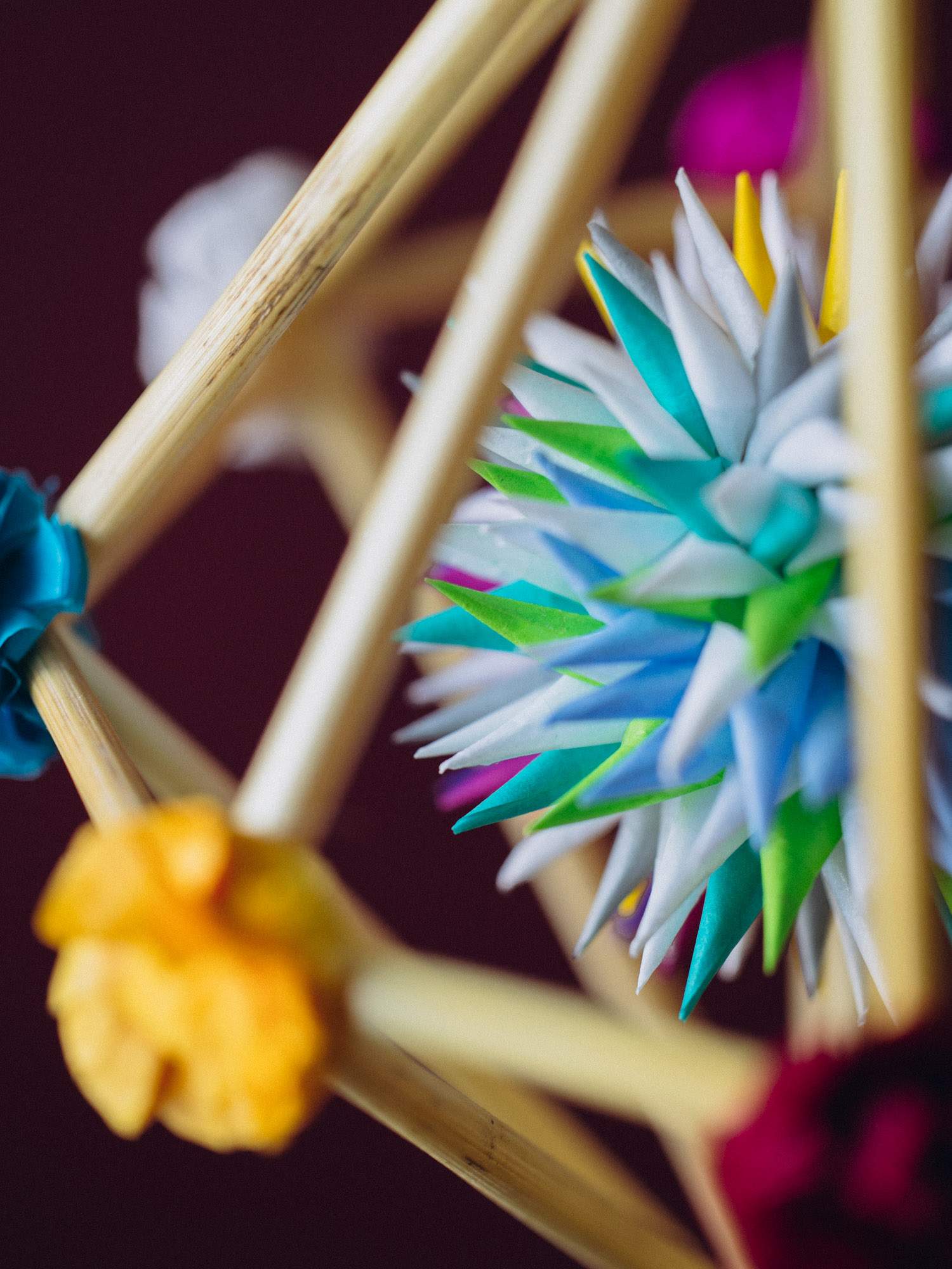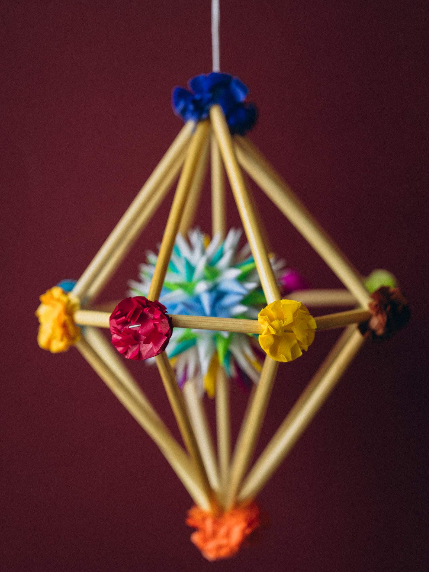 Delikatny mini pająk w kształcie diamentu wykonany z cienkich słomek oraz ozdobiony kolorowymi kwiatkami z bibuły. Dzięki lekkiej konstrukcji pięknie obraca się w powietrzu. Każdy egzemplarz to ręczna praca i jedyny w swoim rodzaju przedmiot.