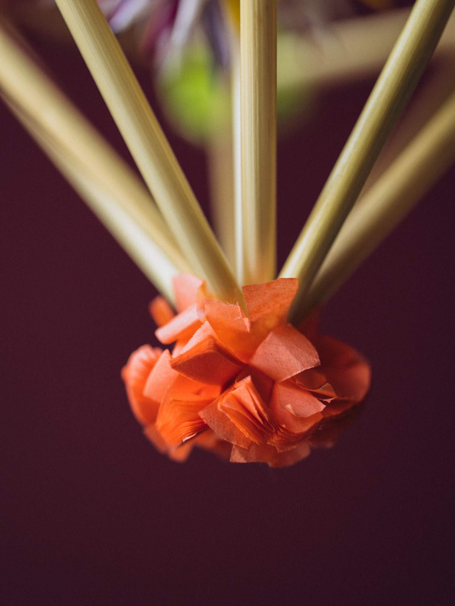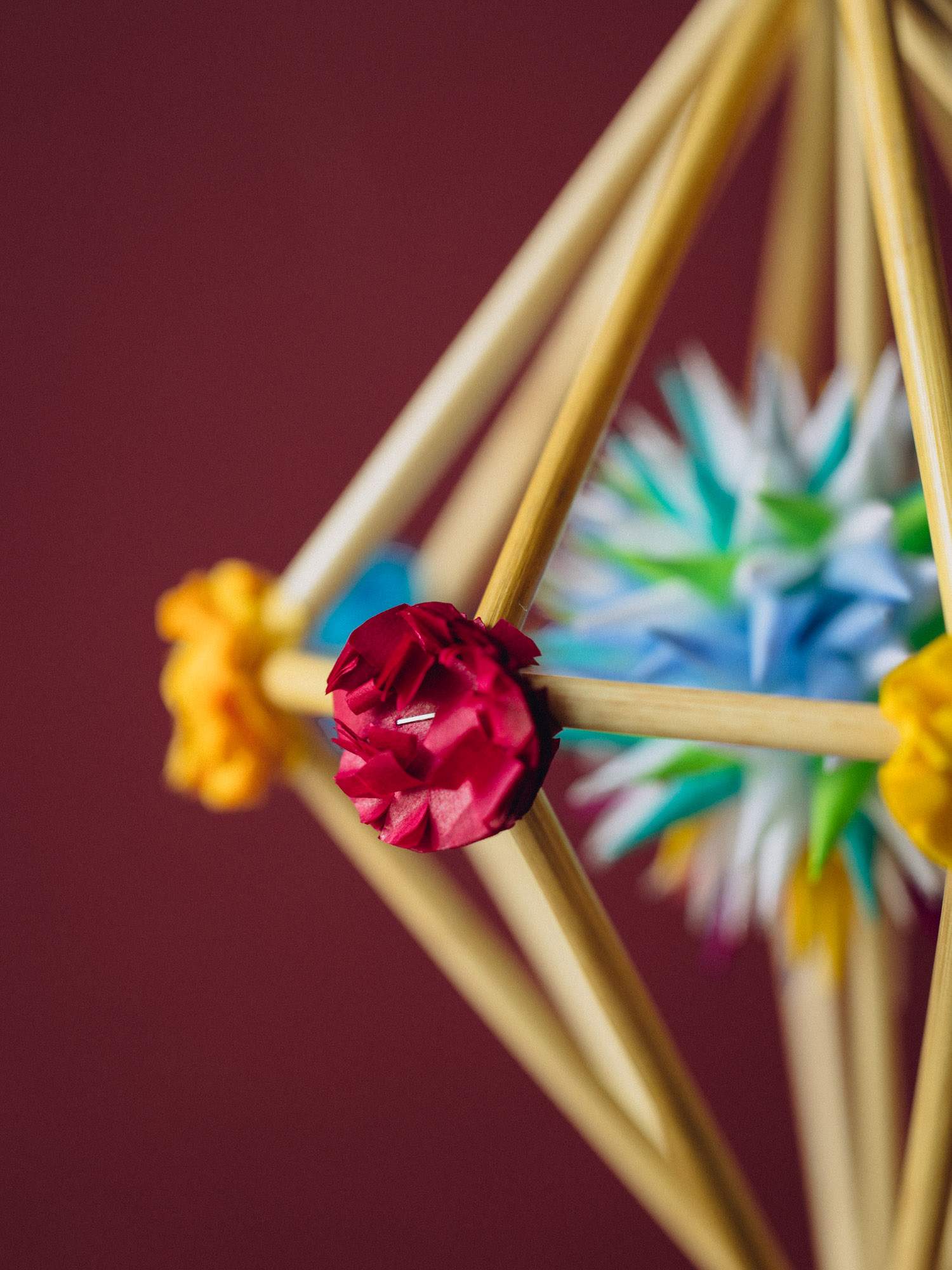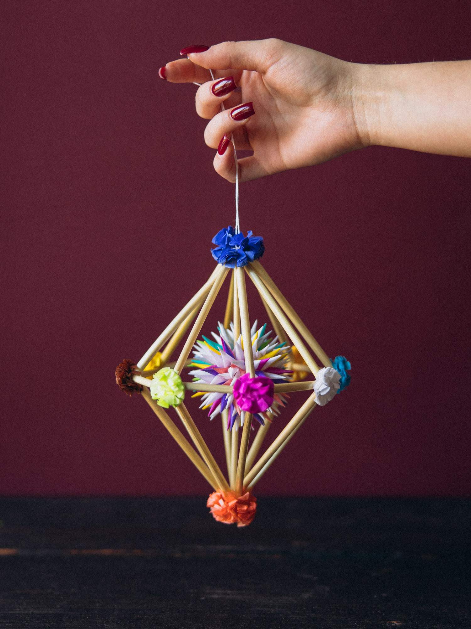 Delikatny mini pająk w kształcie diamentu wykonany z cienkich słomek oraz ozdobiony kolorowymi kwiatkami z bibuły. Dzięki lekkiej konstrukcji pięknie obraca się w powietrzu. Każdy egzemplarz to ręczna praca i jedyny w swoim rodzaju przedmiot.