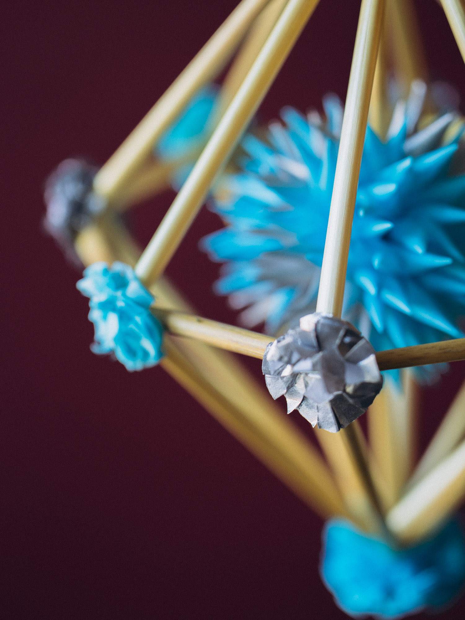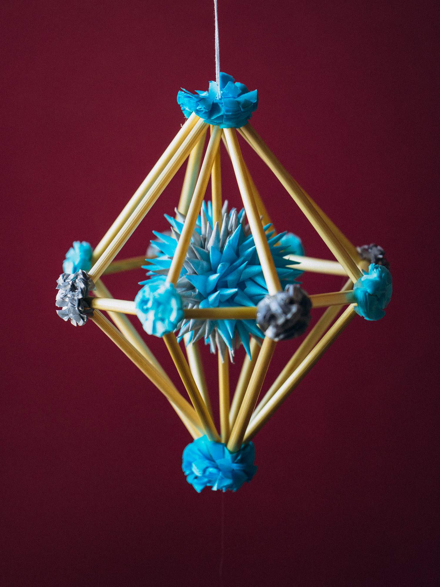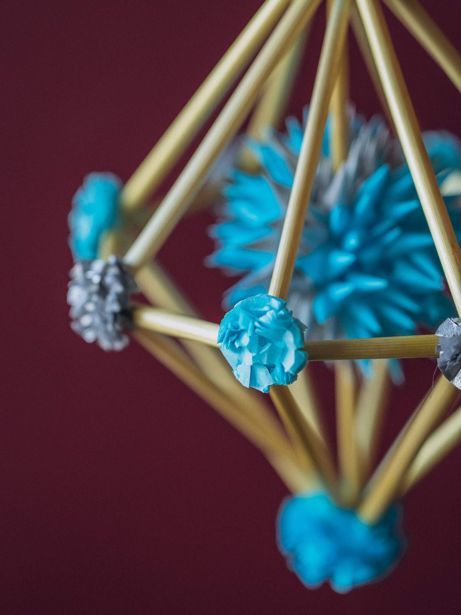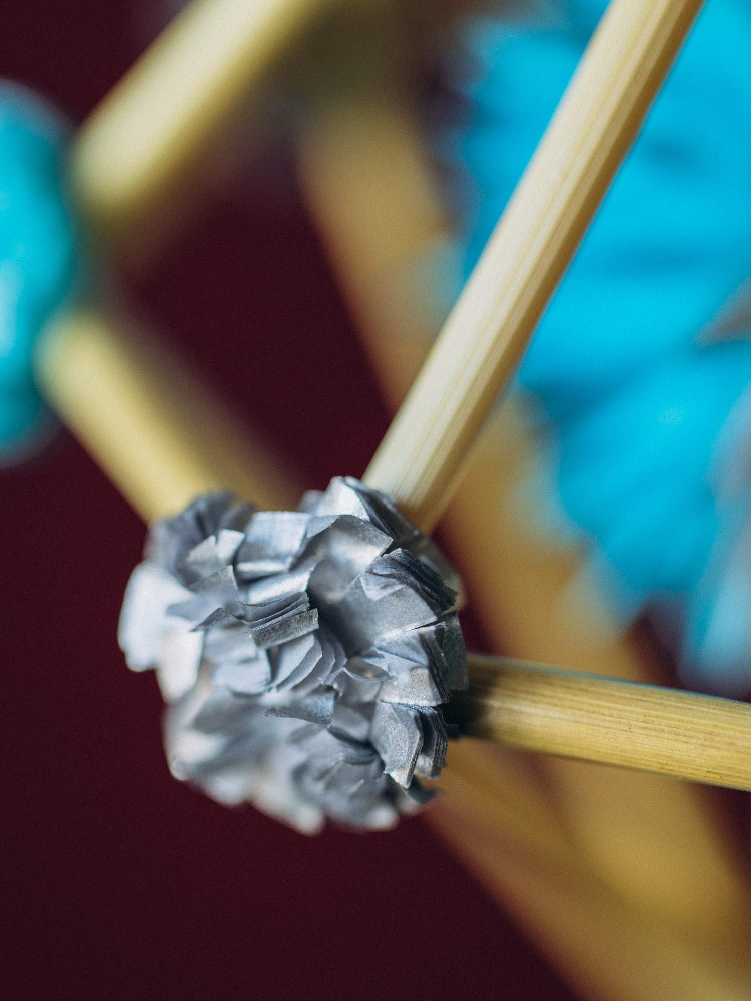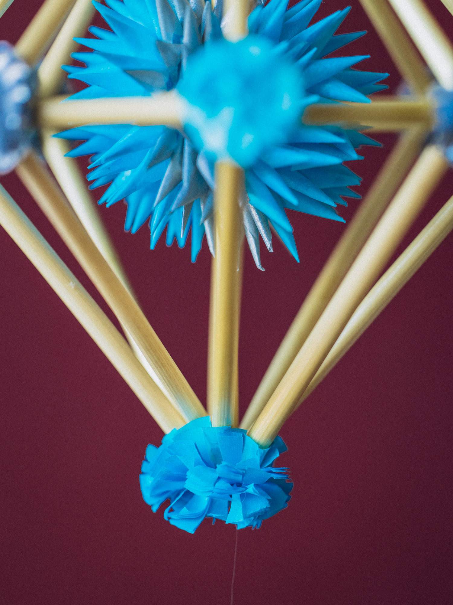Tradycyjny pająk ludowy wykonany ze słomek i bibuły w odcieniach niebieskiego i szarego.