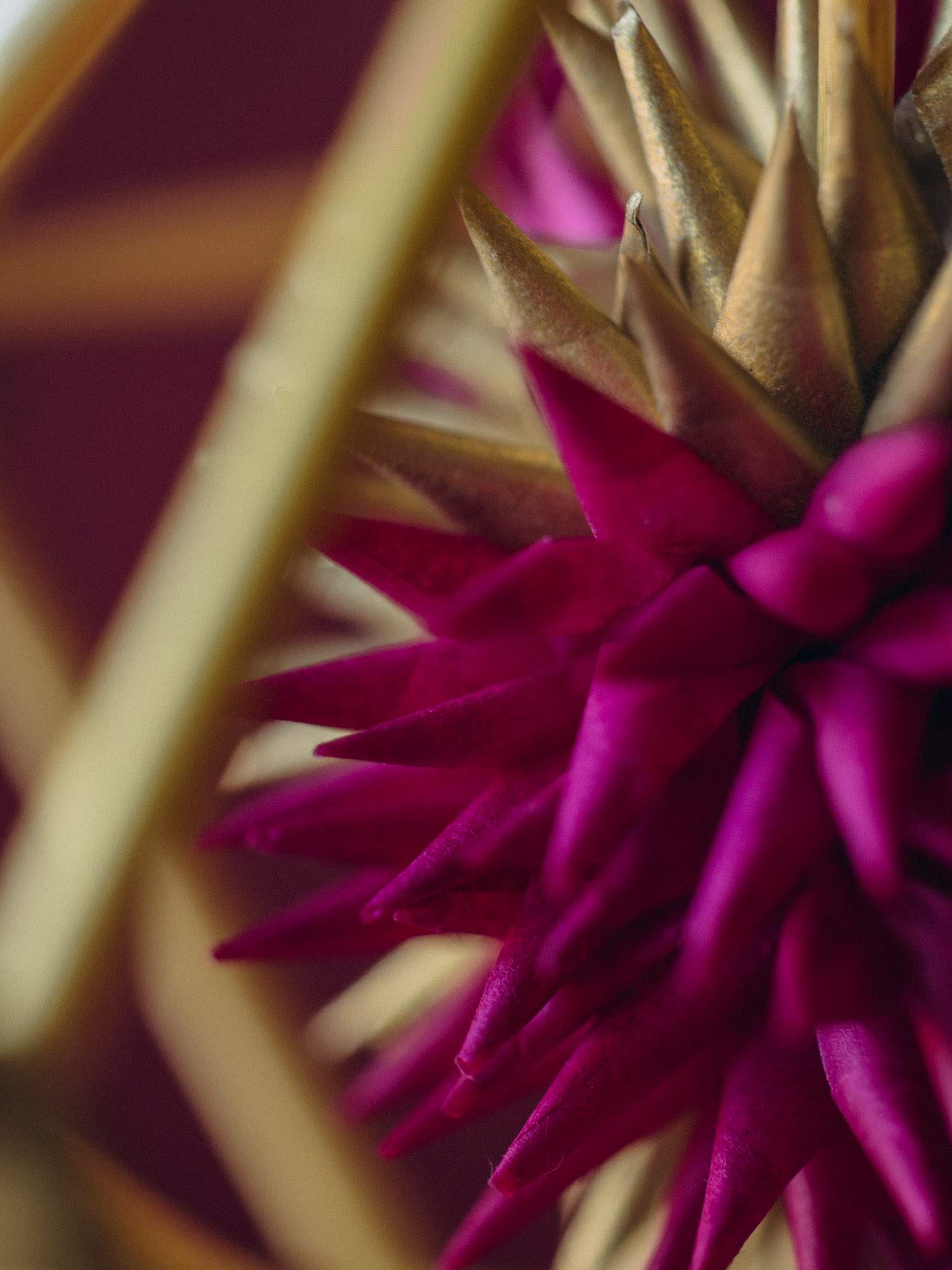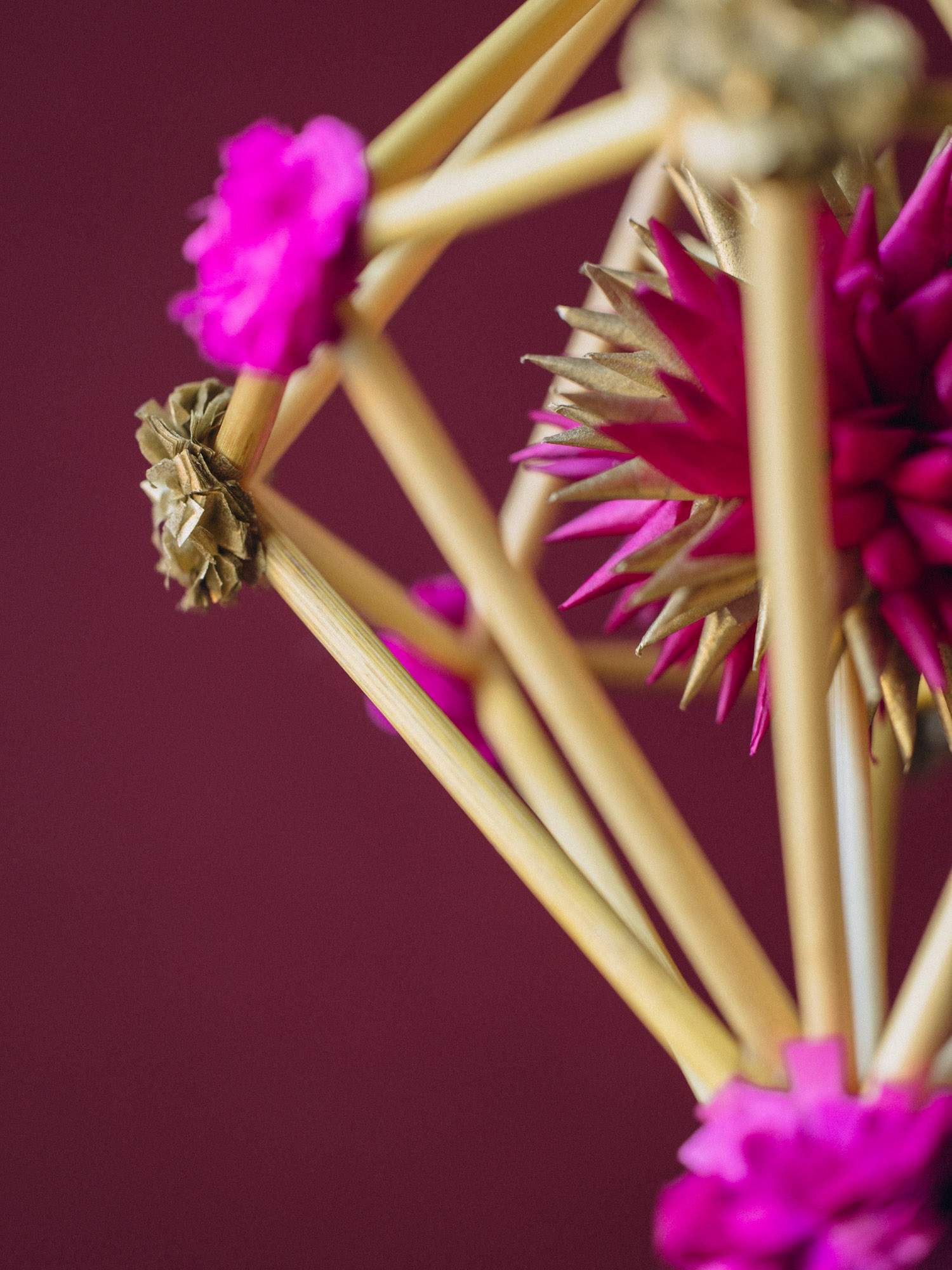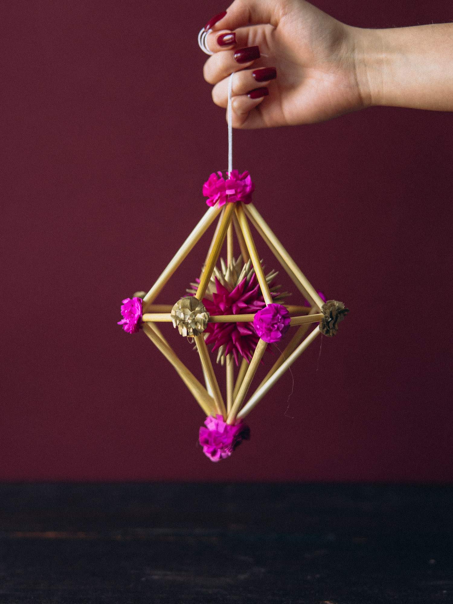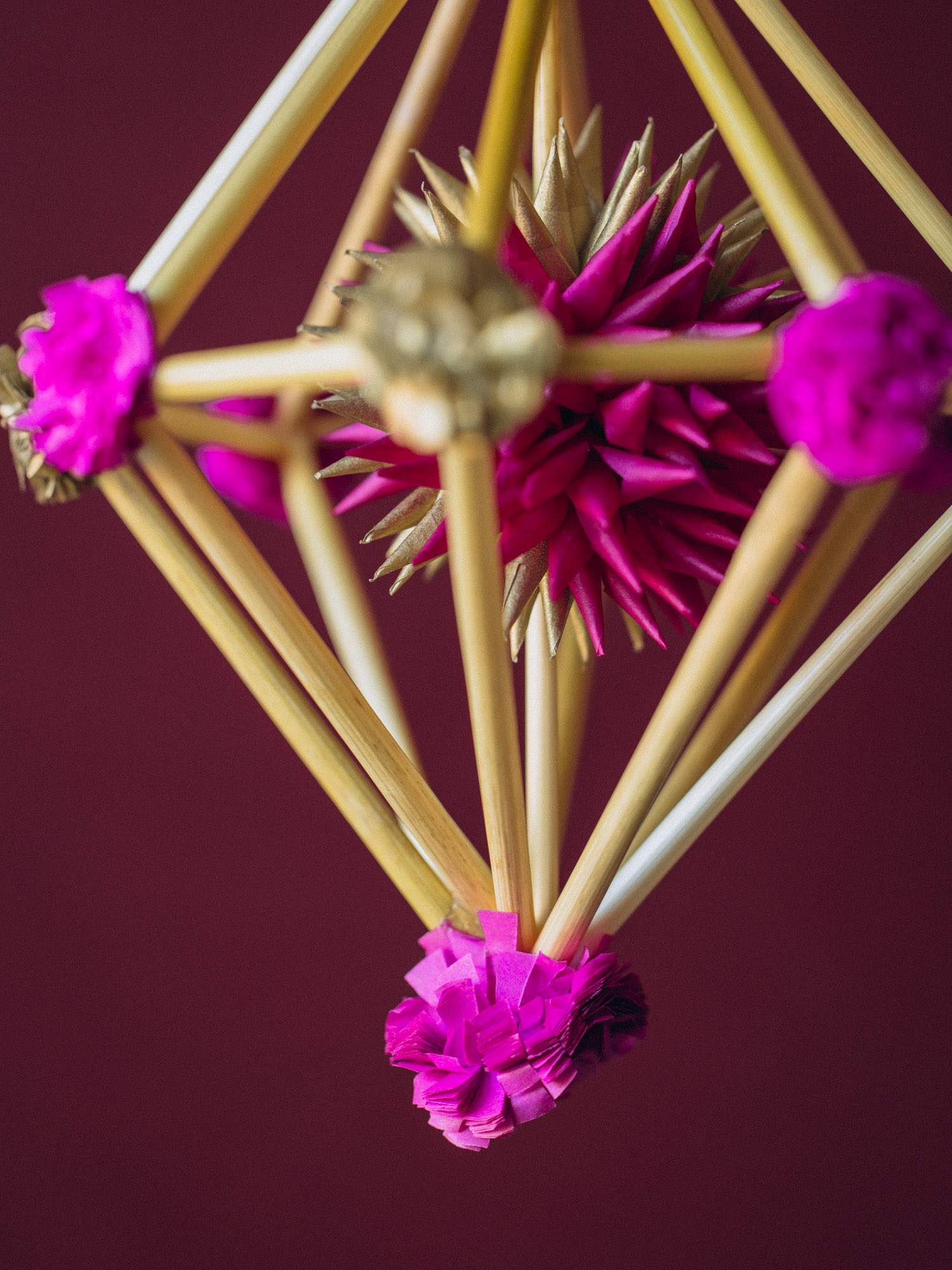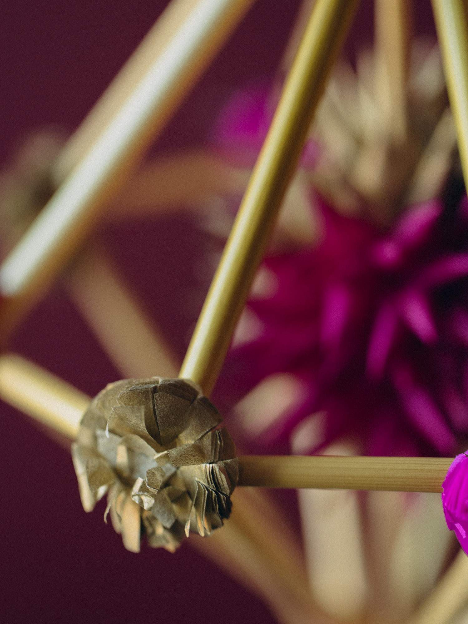 Mini pająk w kształcie diamentu z kwiatuszkami, wykonanymi z bibuły w kolorze różowym i złotym. Doskonały jako dekoracja okienna, świąteczna lub prezent dla miłośników tradycji.