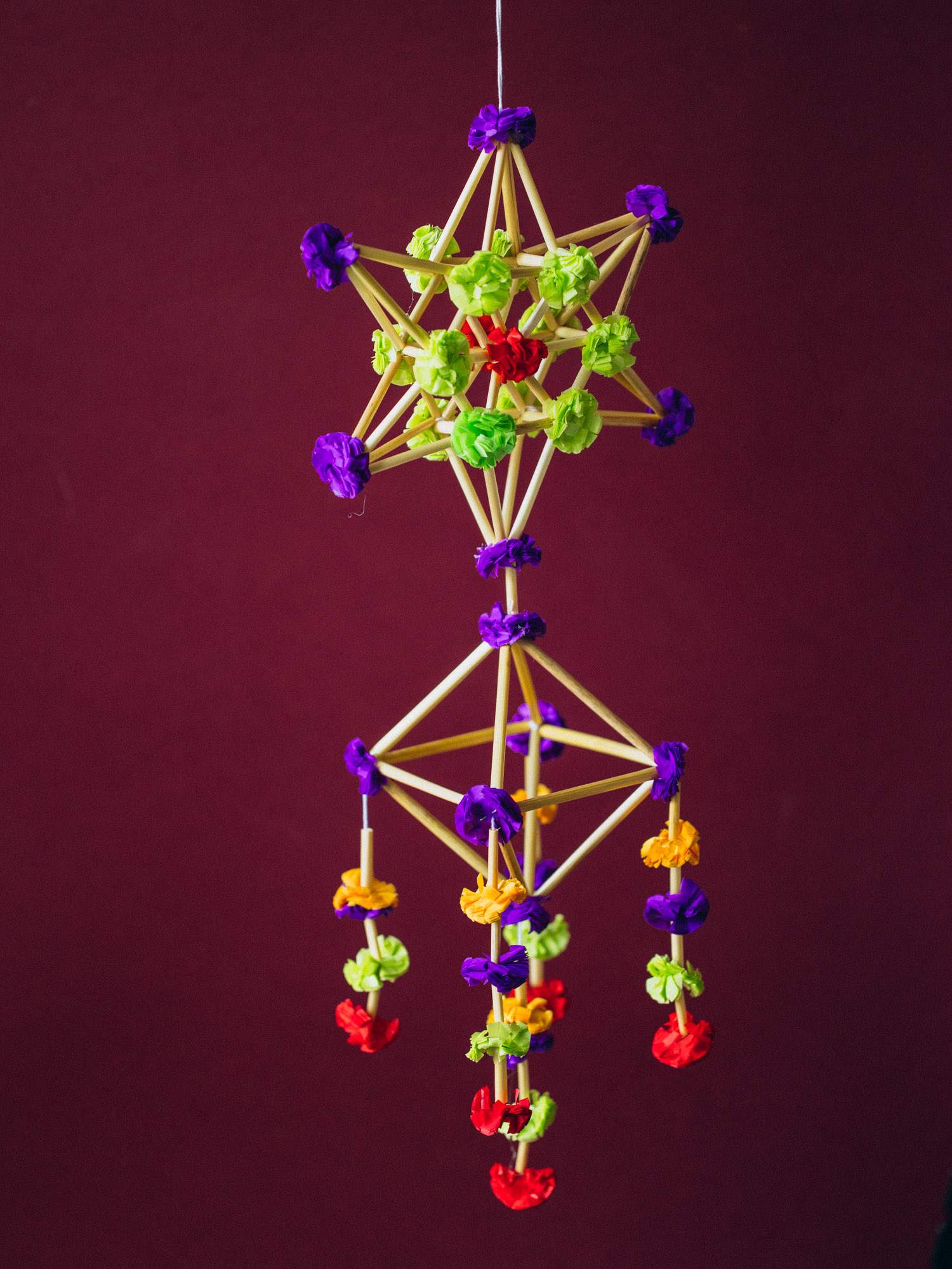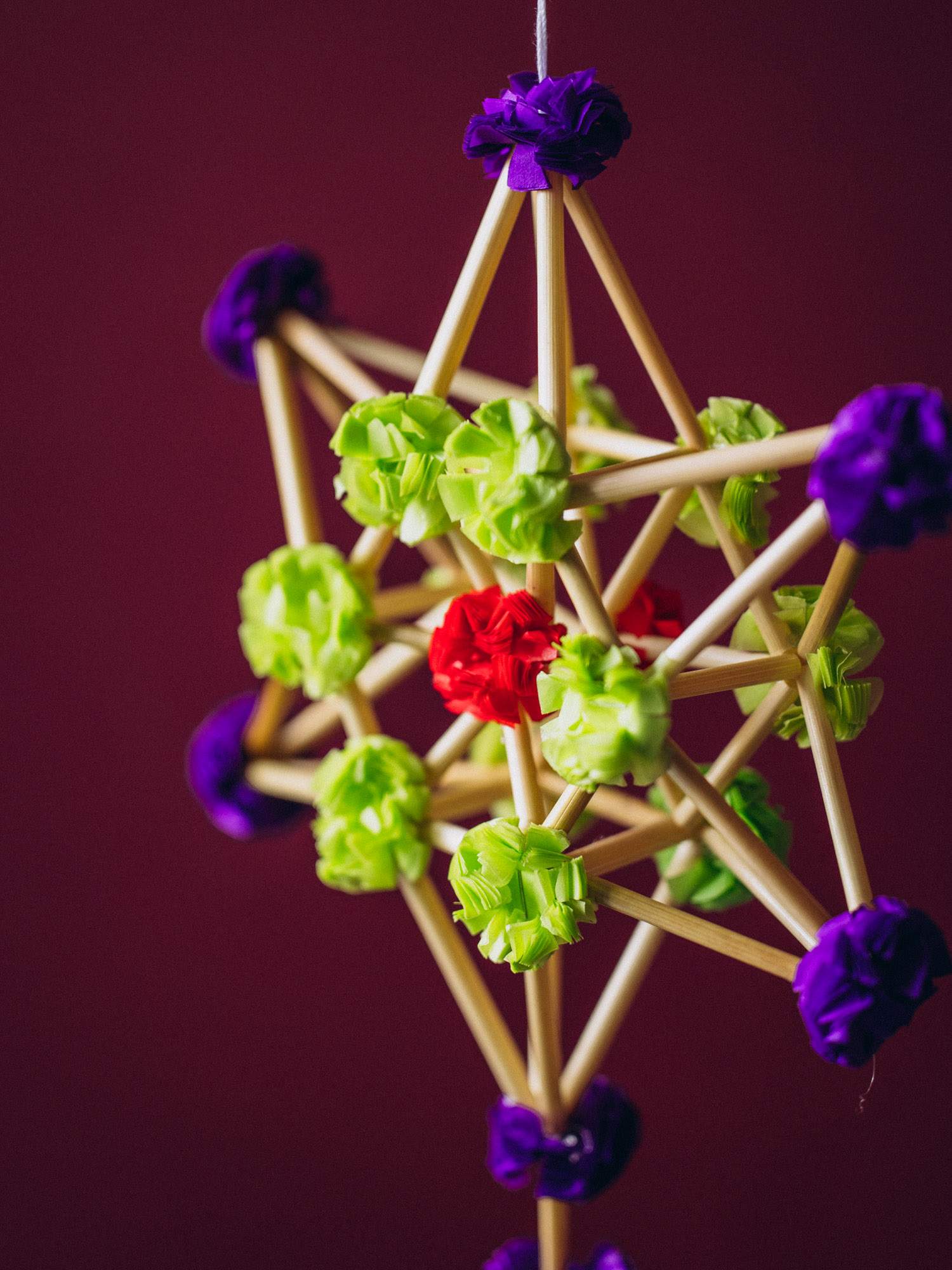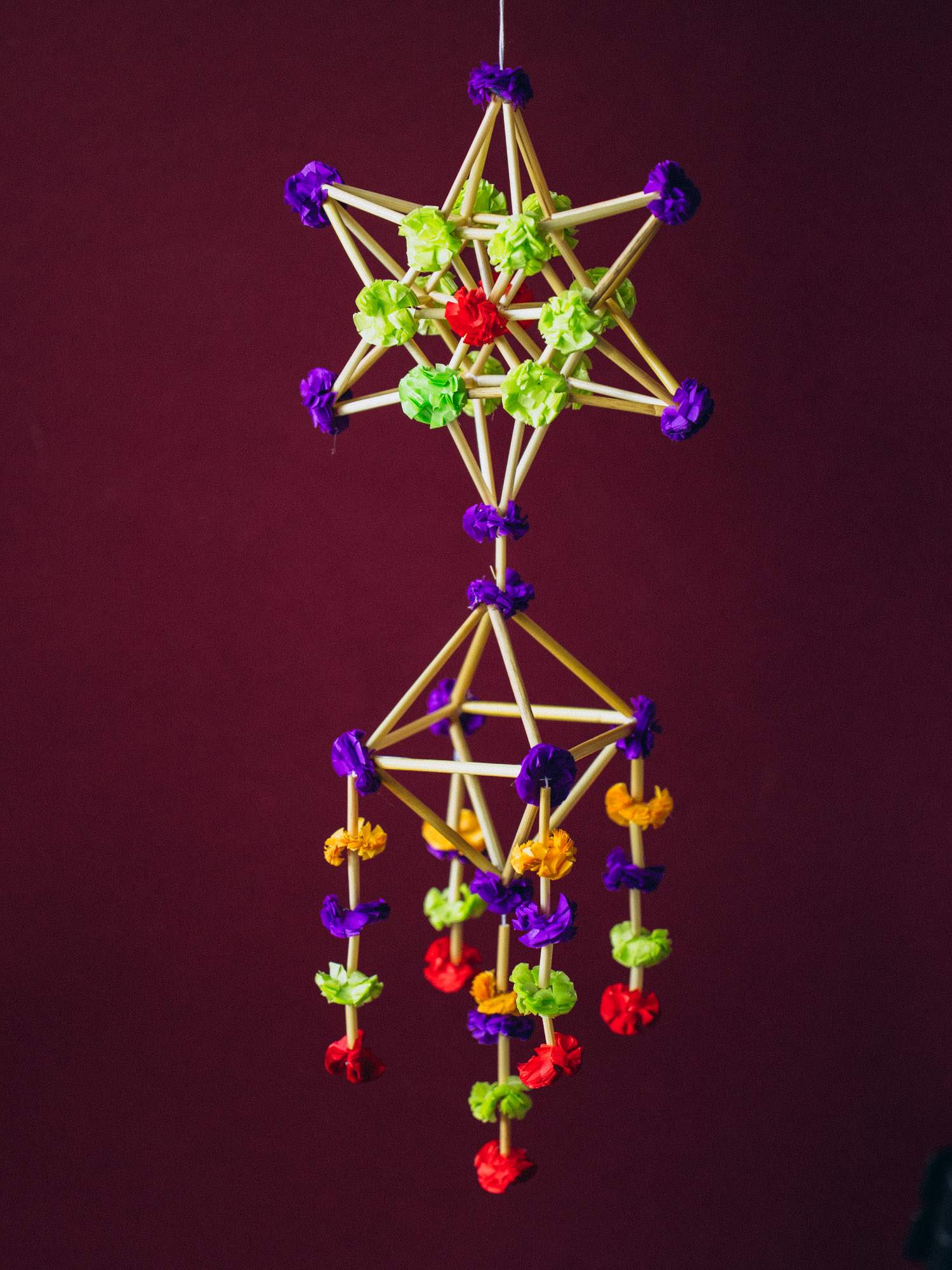 Mini pająk ludowy w formie gwiazdy i diamentu, ozdobiony kwiatkami z bibuły.
