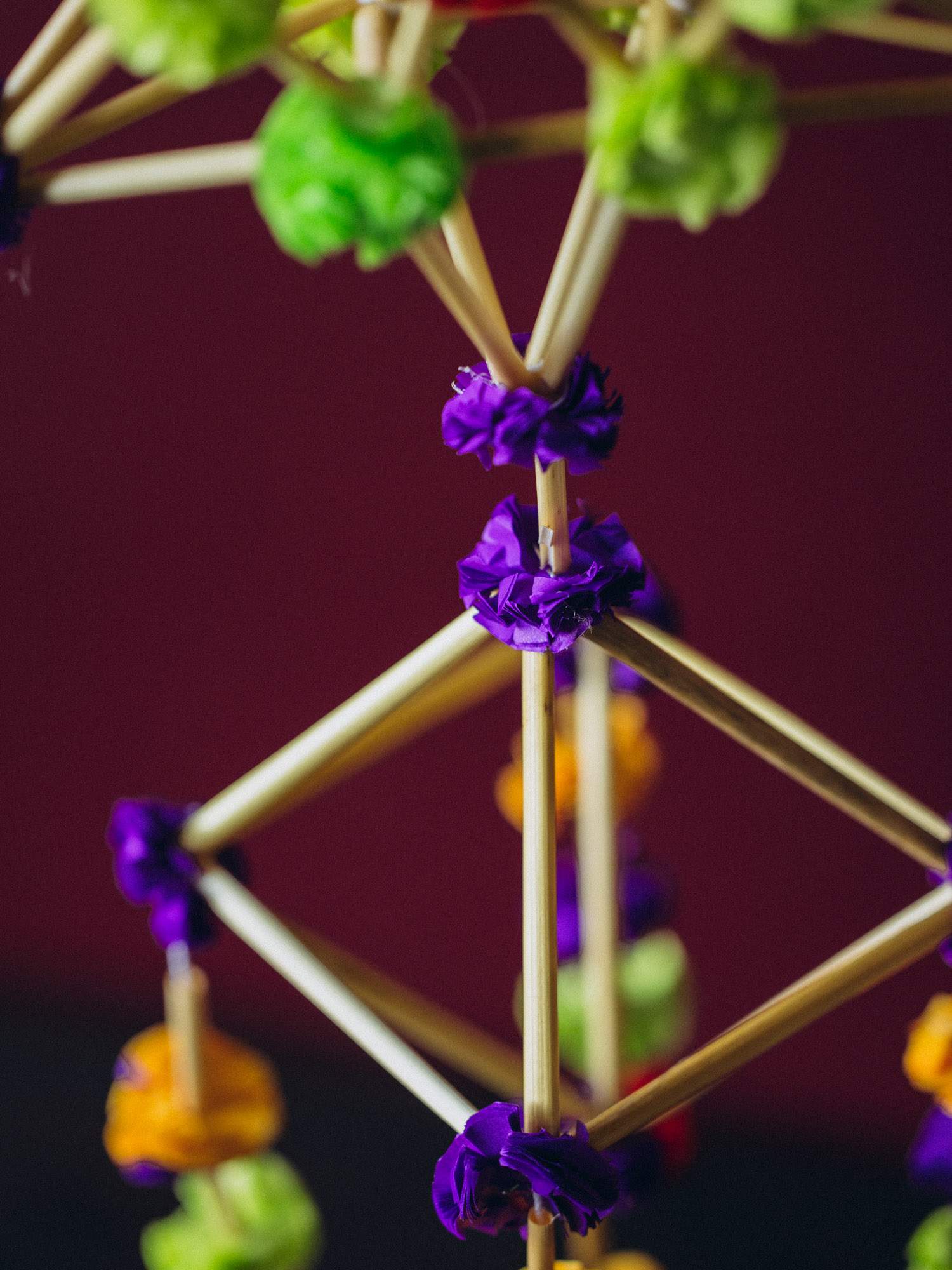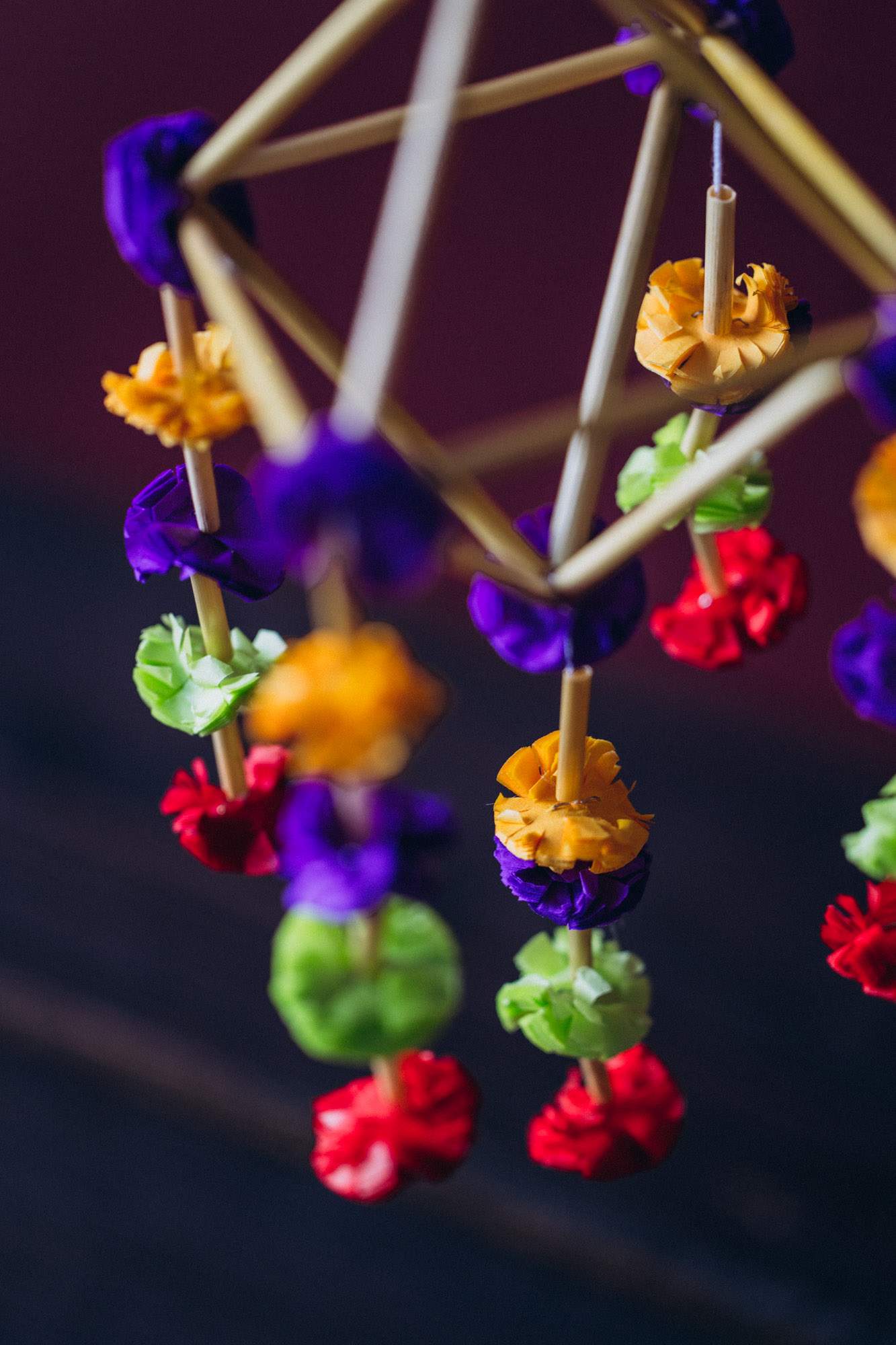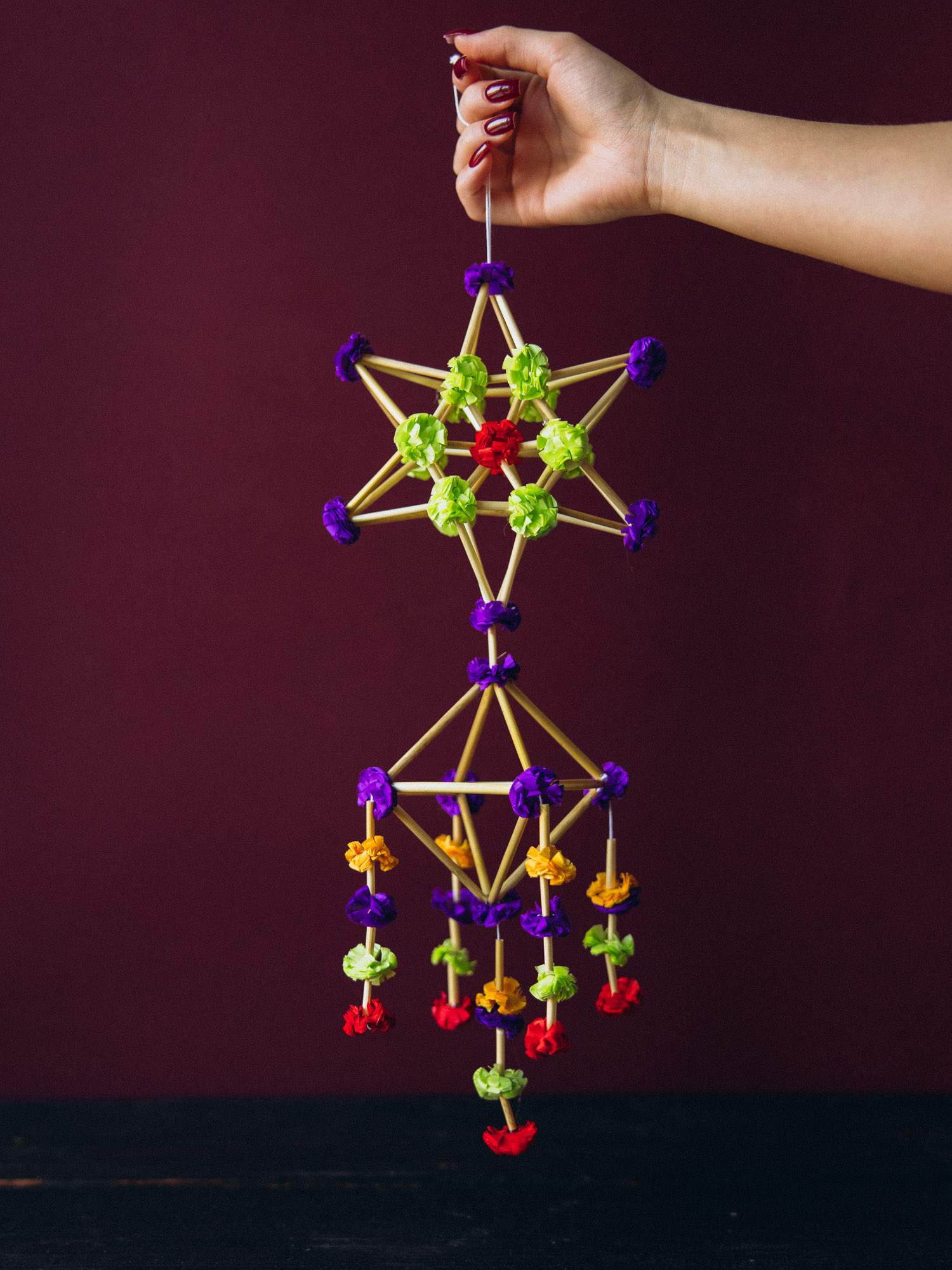 Mini pająk ludowy w formie gwiazdy i diamentu, ozdobiony kwiatkami z bibuły.