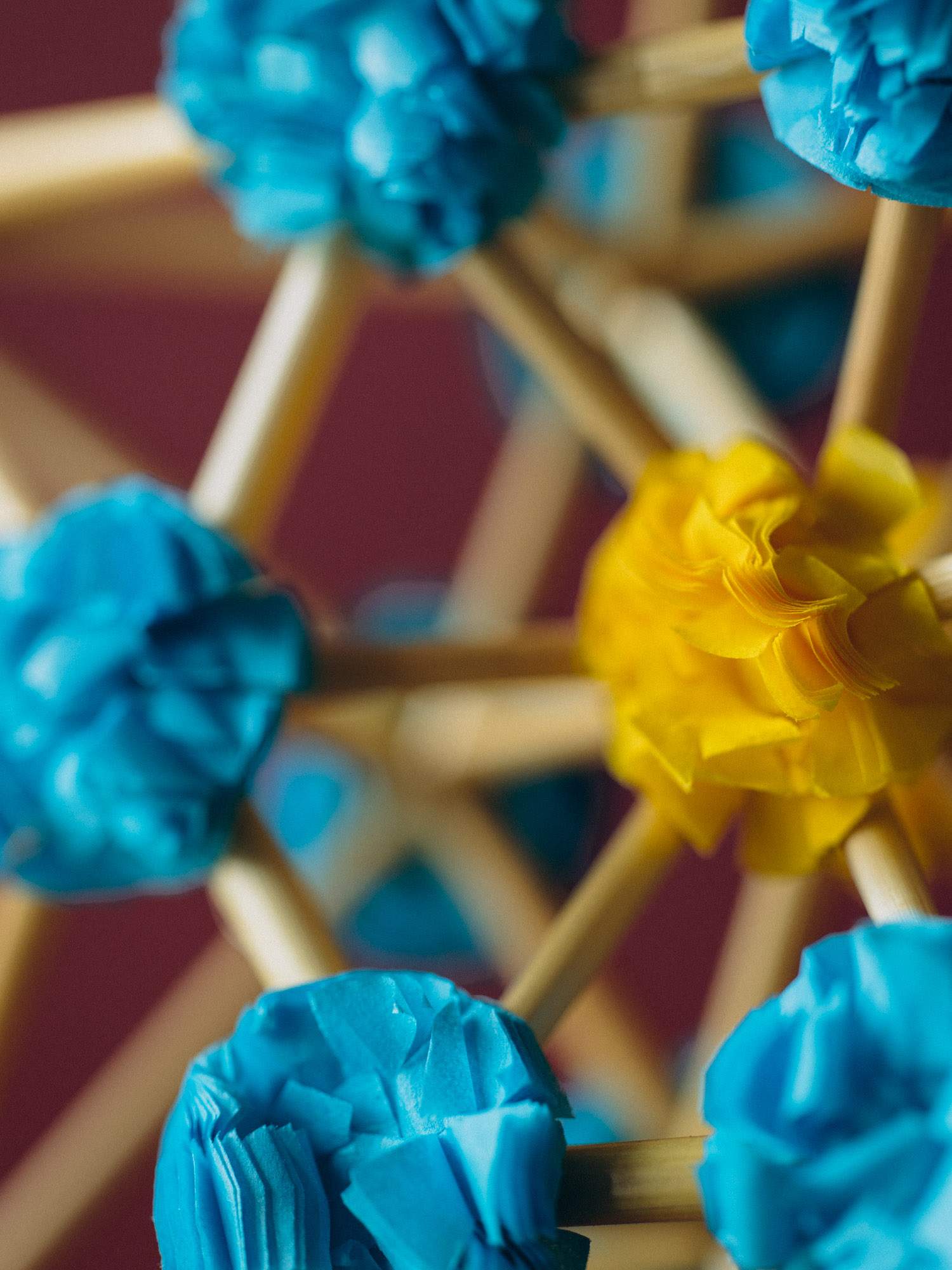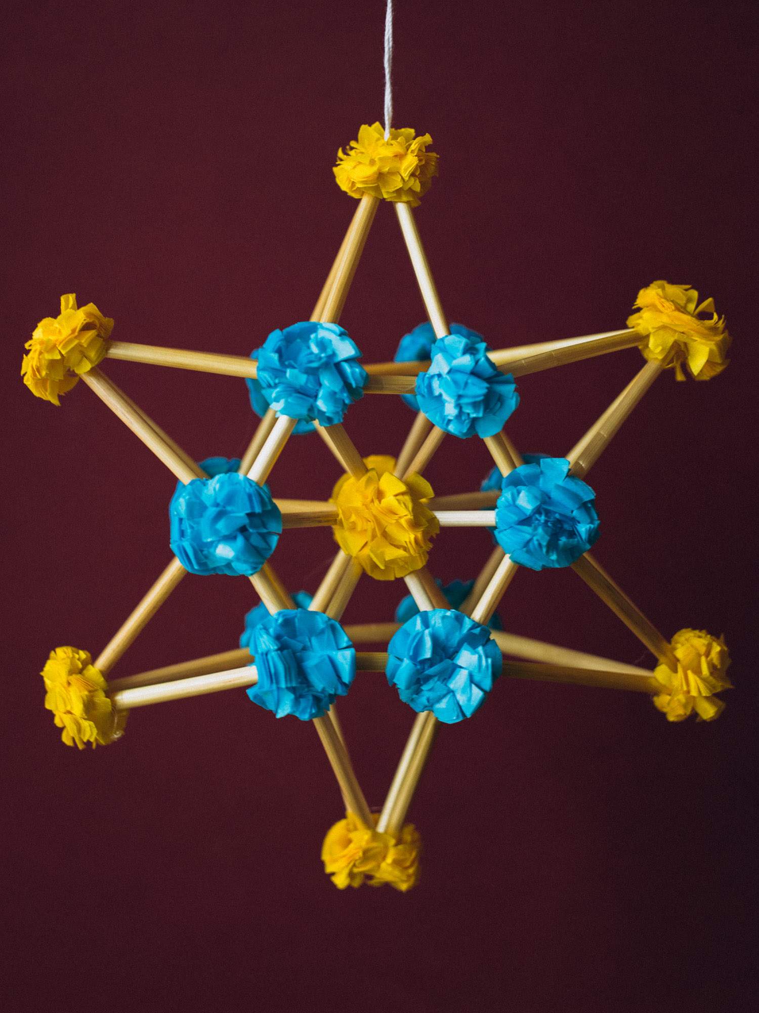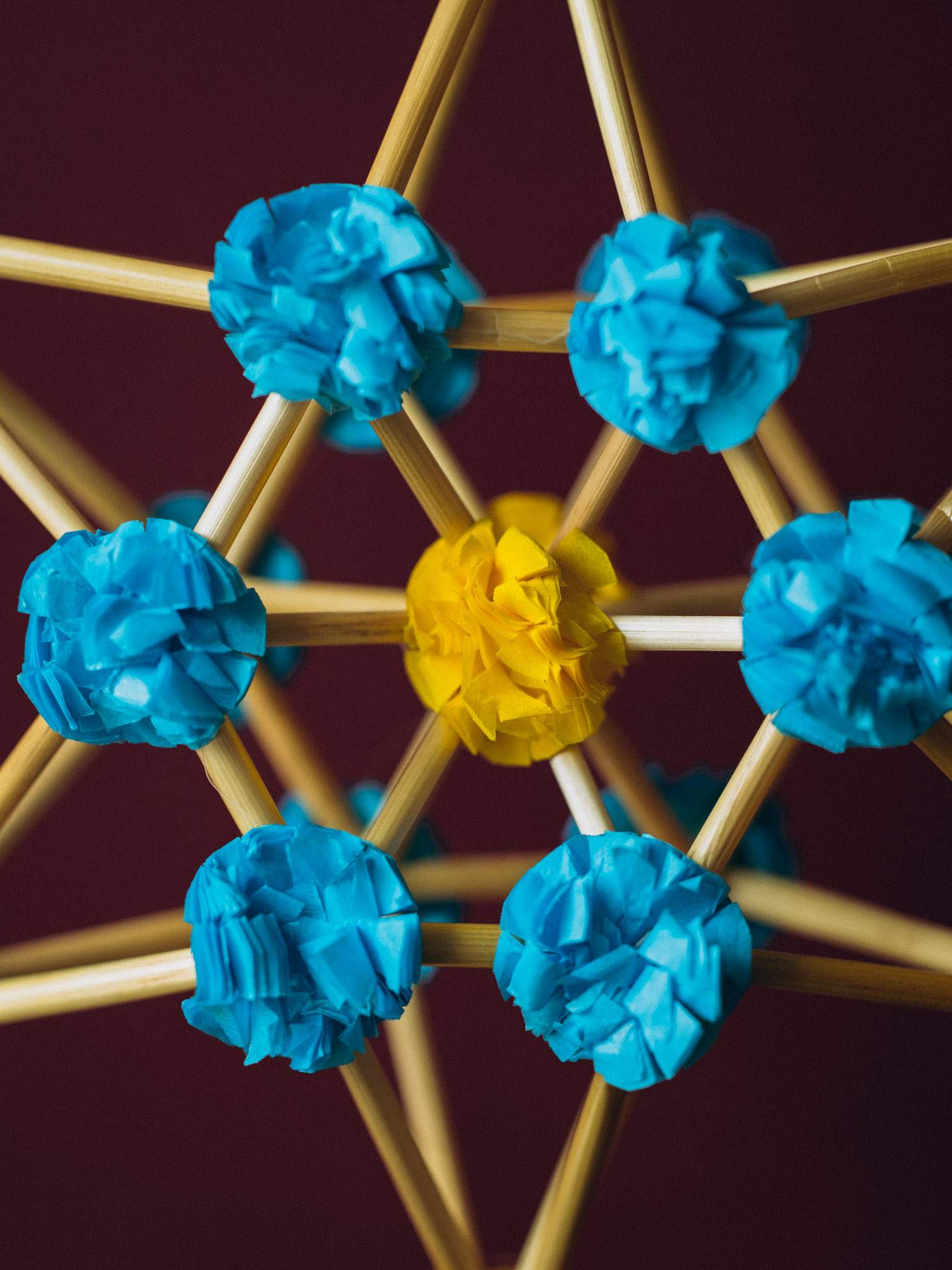 Tradycyjny mini pająk ludowy z bibułkowymi kwiatkami w odcieniach niebieskiego i żółtego.