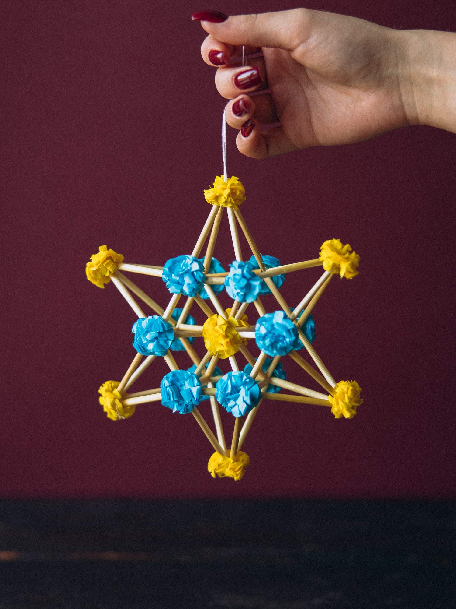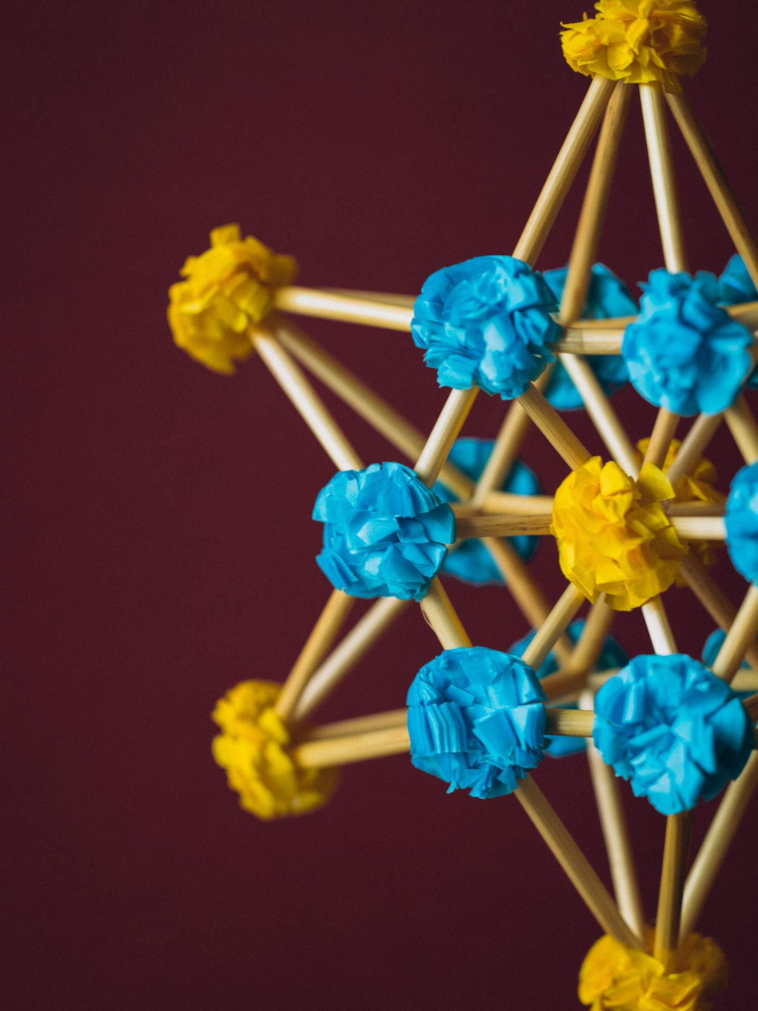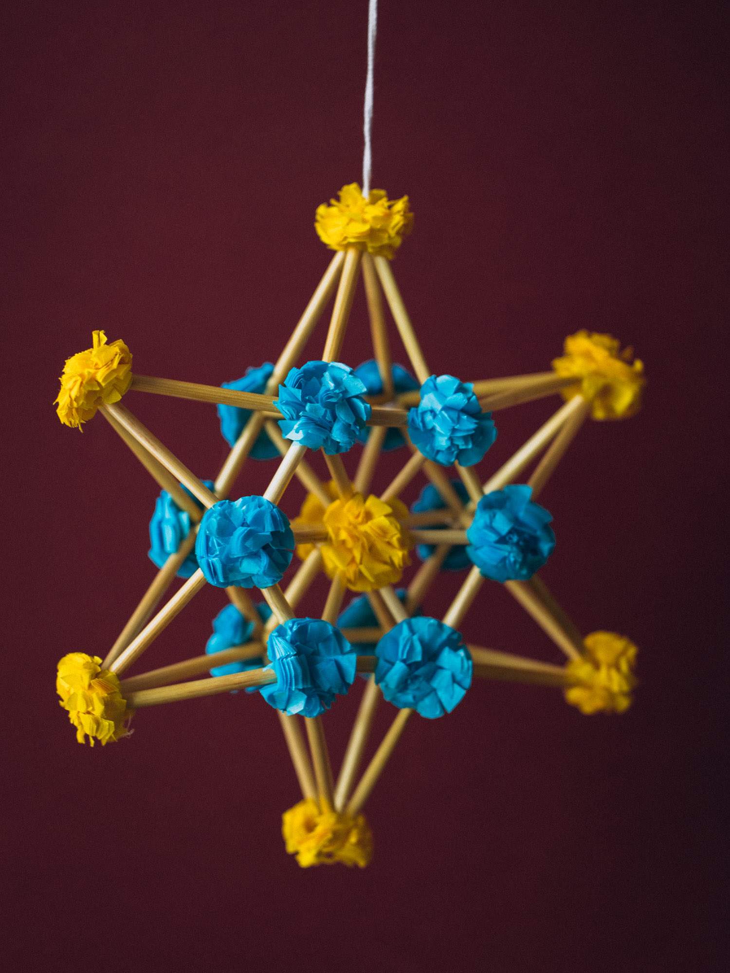Tradycyjny mini pająk ludowy z bibułkowymi kwiatkami w odcieniach niebieskiego i żółtego.