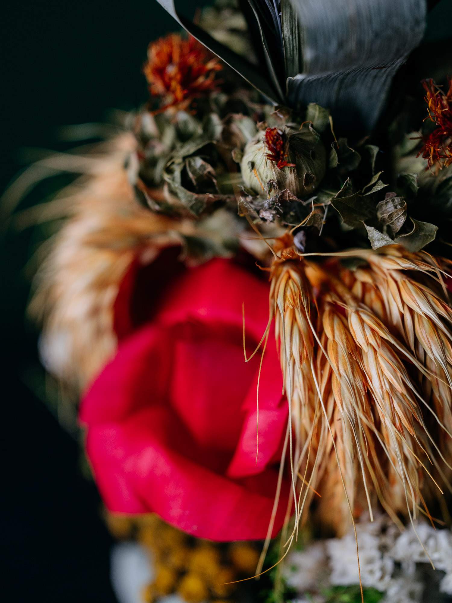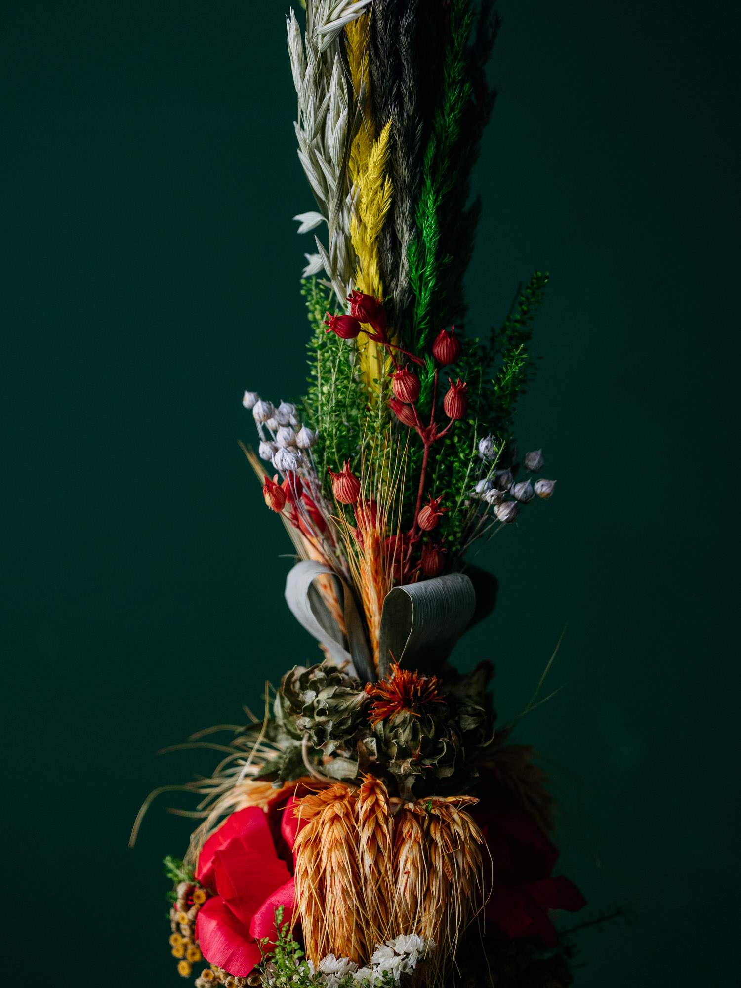 Ręcznie wykonana, duża palma wielkanocna zdobiona czerwonymi różami z suszonych elementów. Palma została wykonana wyłącznie z naturalnych, suszonych składników. Znajdują się tam trawy, zboża czy kwiaty misternie ułożone w oryginalną kompozycję.