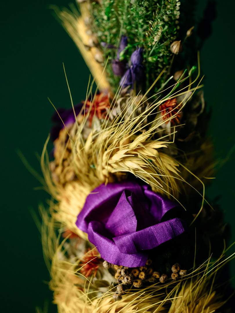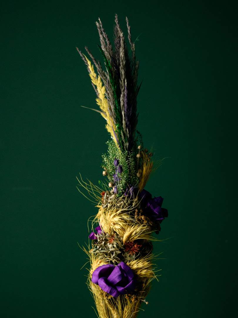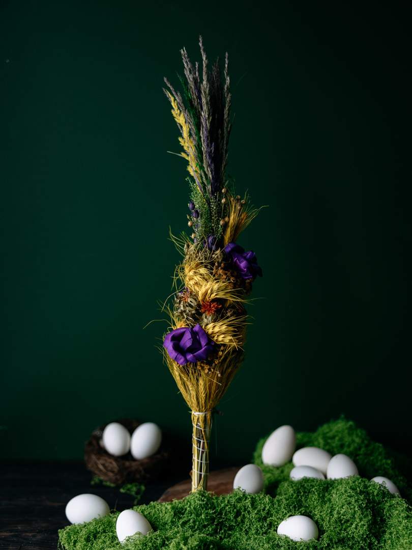 Ręcznie wykonana, duża palemka wielkanocna zdobiona suszonymi elementami w fioletowym kolorze, formowanymi na wzór różyczek. Palma została wykonana wyłącznie z naturalnych, suszonych składników. Znajdują się tam trawy, zboża czy kwiaty misternie ułożone w oryginalną kompozycję.