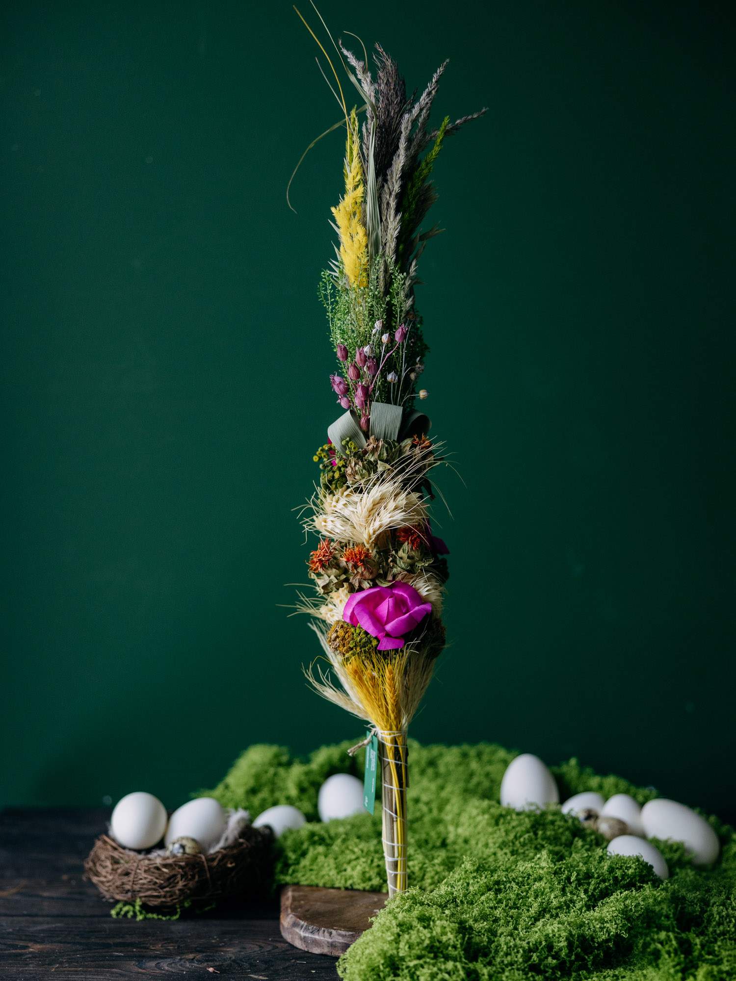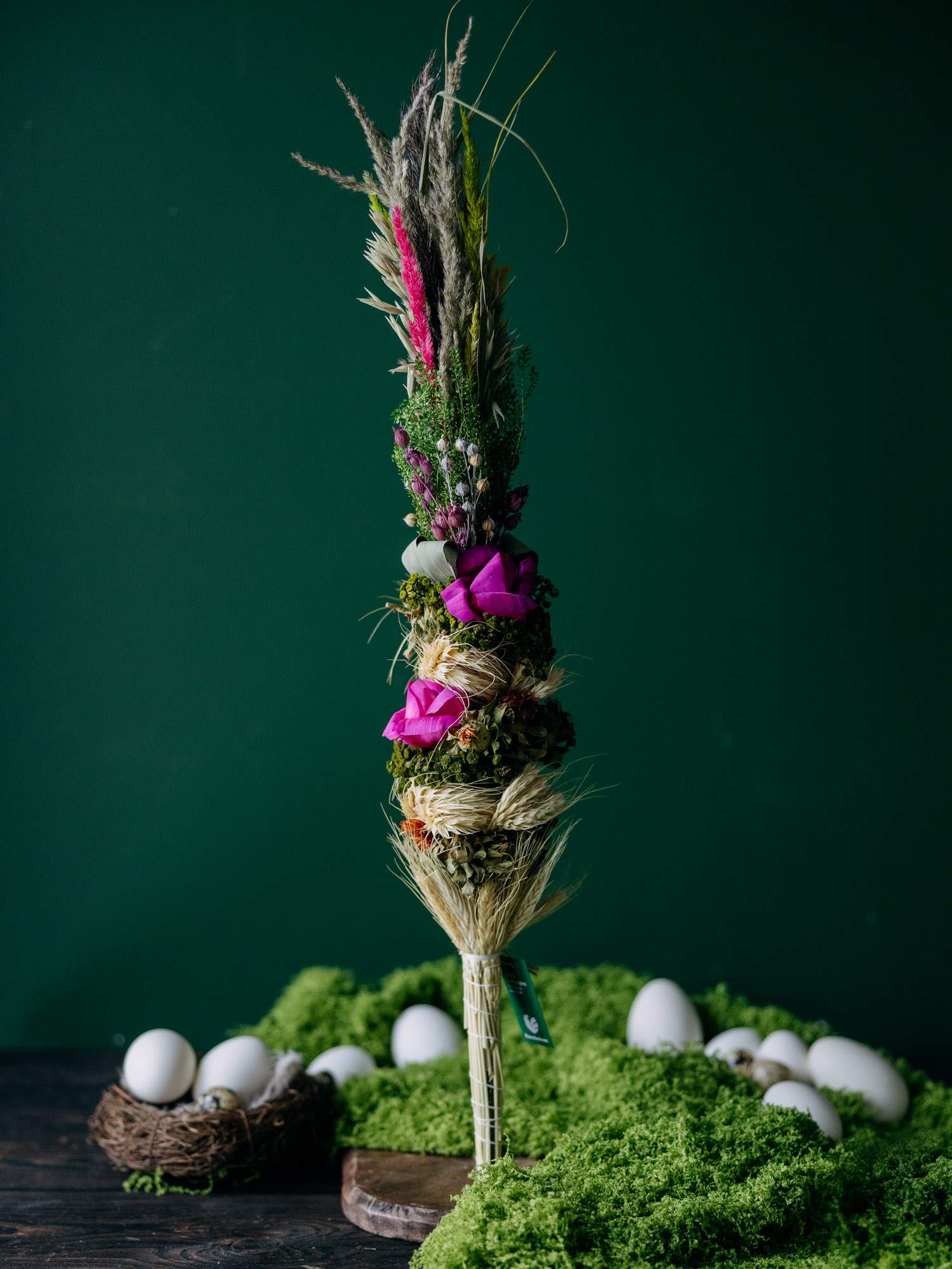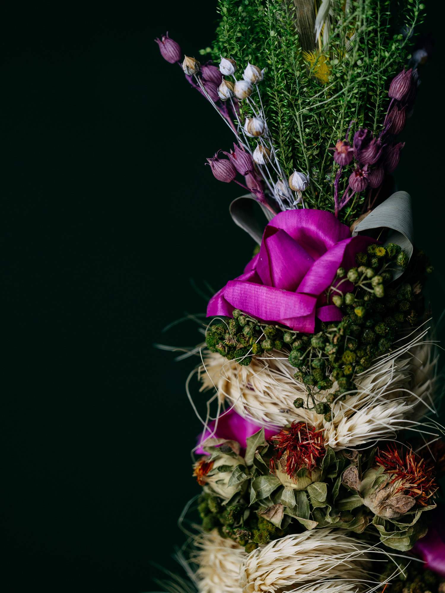 Ręcznie wykonana, duża palma wielkanocna zdobiona suszonymi elementami, formowanymi na wzór fioletowych róż. Palma została wykonana wyłącznie z naturalnych, suszonych składników. Znajdują się tam trawy, zboża czy kwiaty misternie ułożone w oryginalną kompozycję.