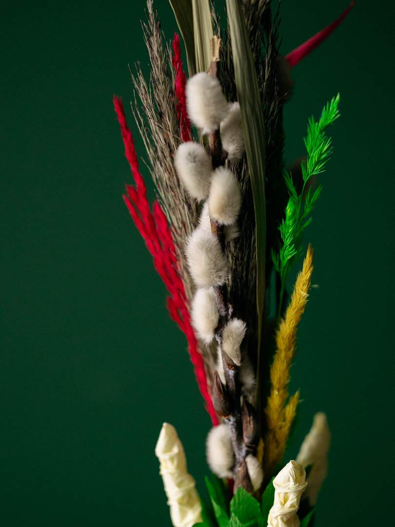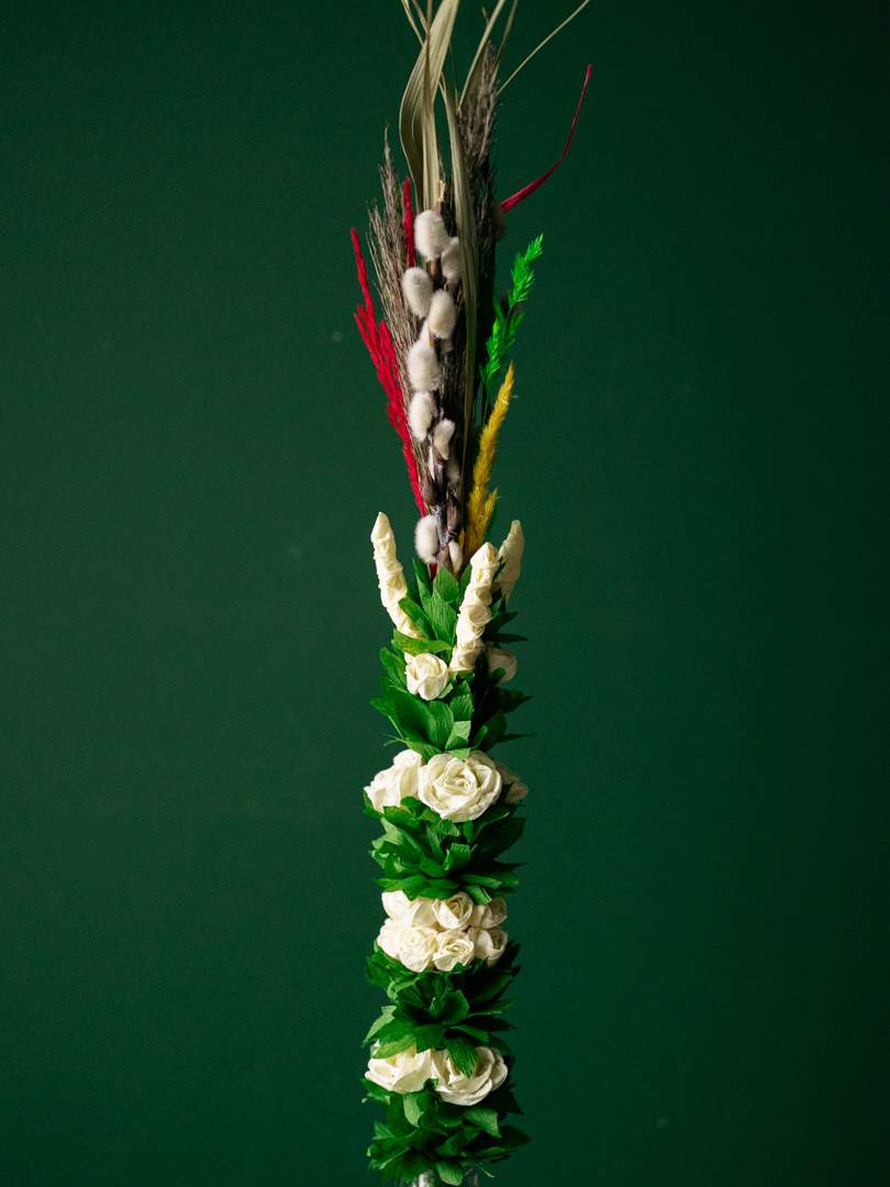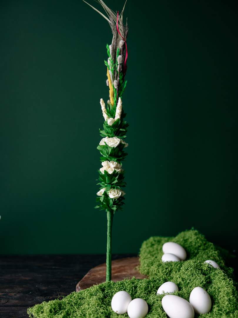 Kremowa palma wielkanocna wykonana ręcznie z wysokiej jakości bibuły oraz naturalnych elementów dekoracyjnych. Jasna, kremowa kolorystka nadaje palmie lekkości i unikatowego wyglądu.