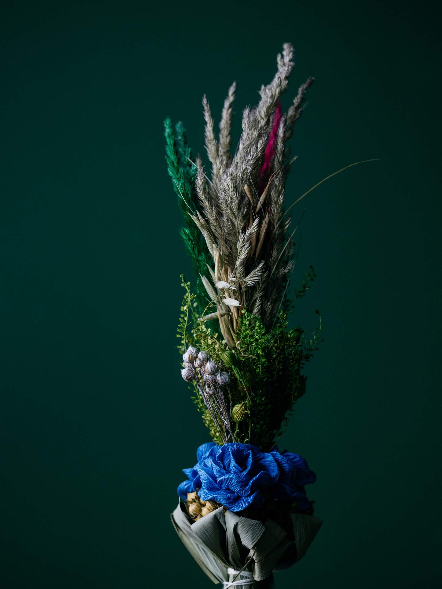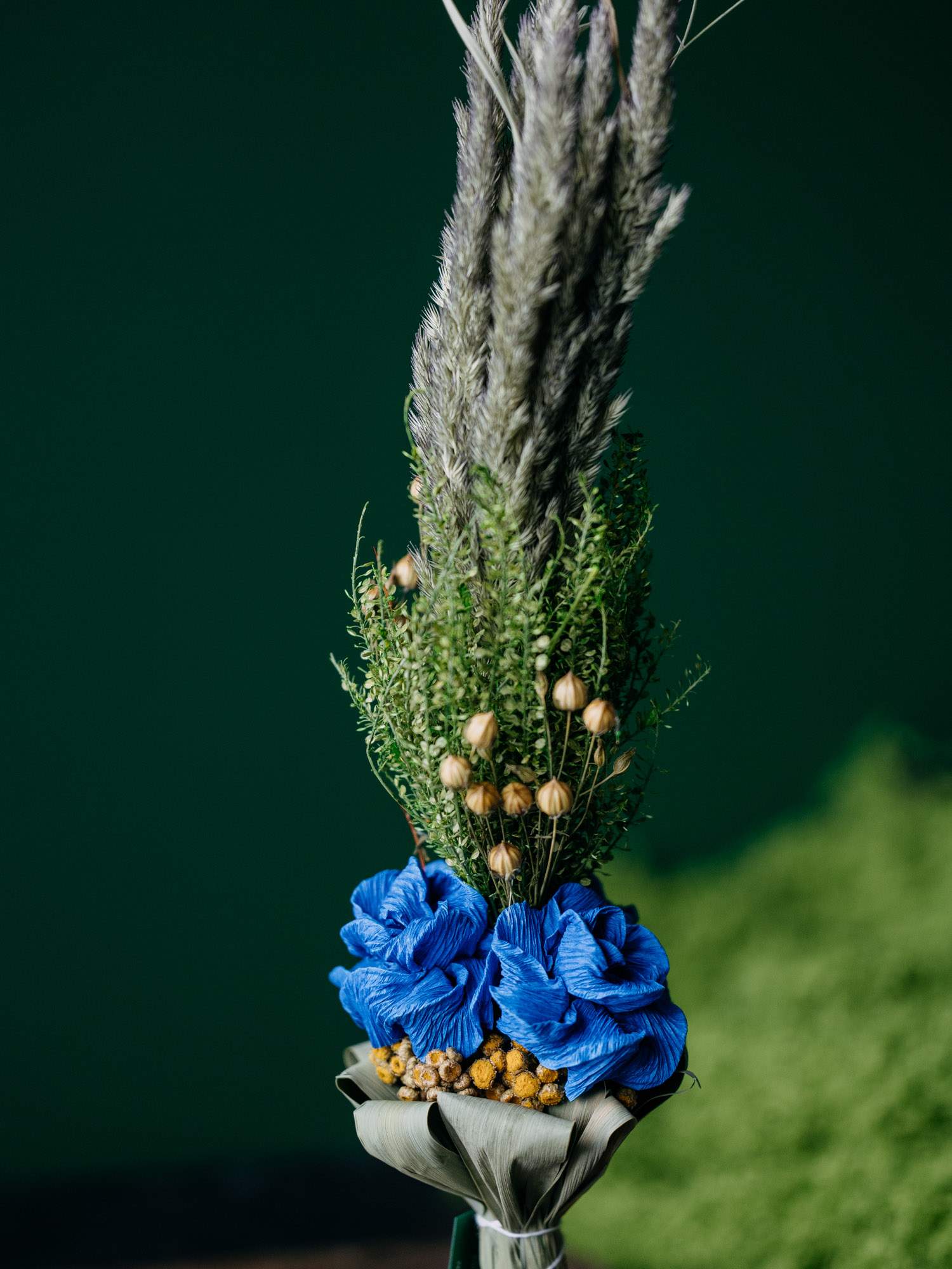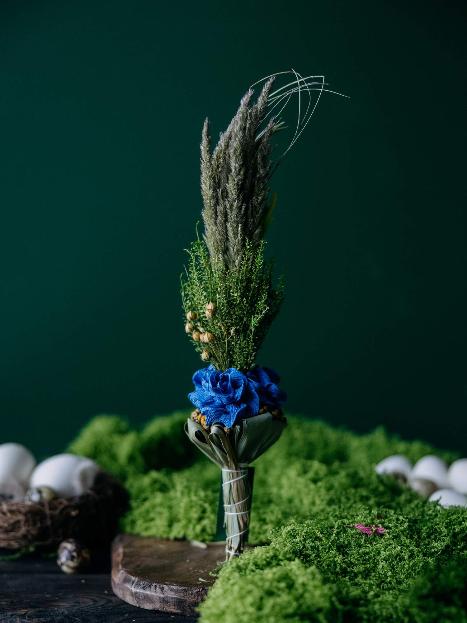 Ręcznie przygotowana palemka wielkanocna, wykonana z suszonych traw, zielonych gałązek i naturalnych dodatków roślinnych. U podstawy znajdują się wyraziste niebieskie różyczki, który są wykonane z bibuły. Forma smukła, pionowa, utrzymana w naturalnym stylu.