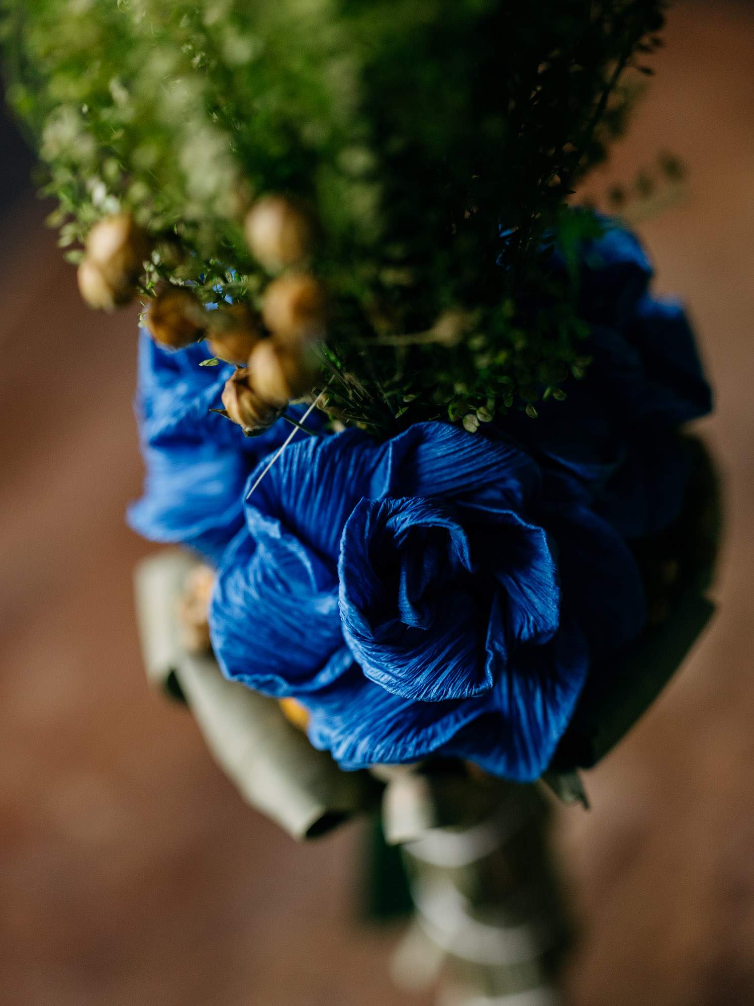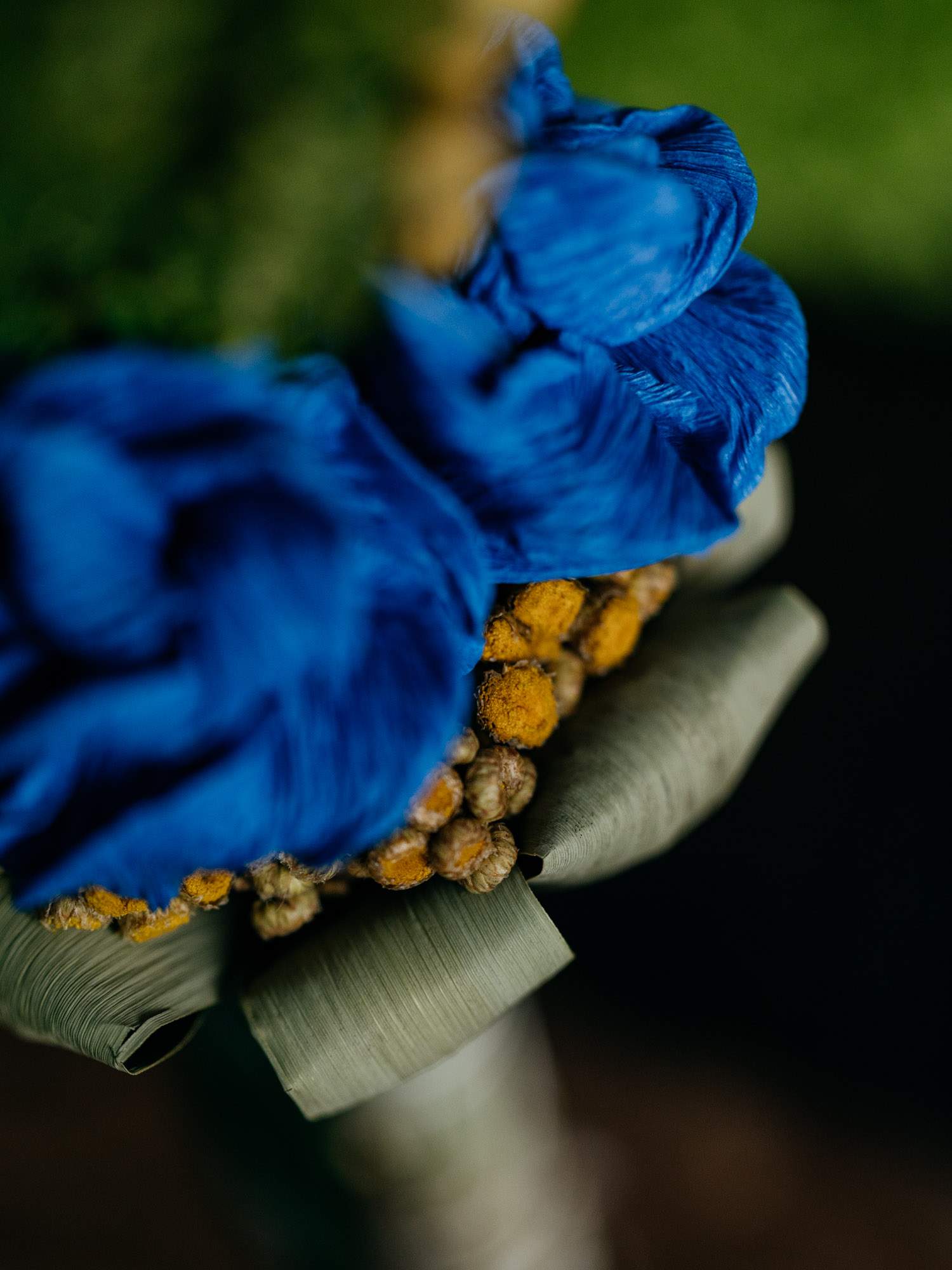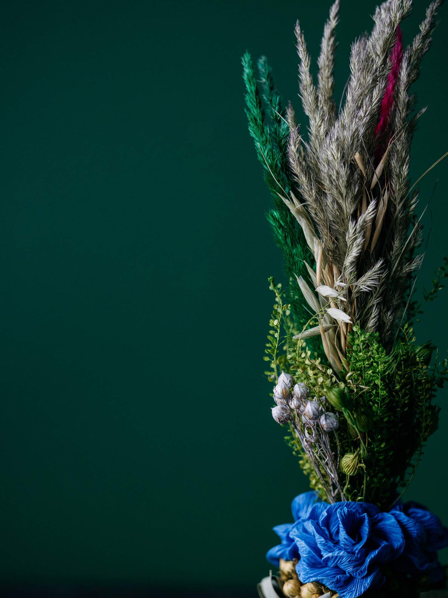 Ręcznie przygotowana palemka wielkanocna, wykonana z suszonych traw, zielonych gałązek i naturalnych dodatków roślinnych. U podstawy znajdują się wyraziste niebieskie różyczki, który są wykonane z bibuły. Forma smukła, pionowa, utrzymana w naturalnym stylu.
