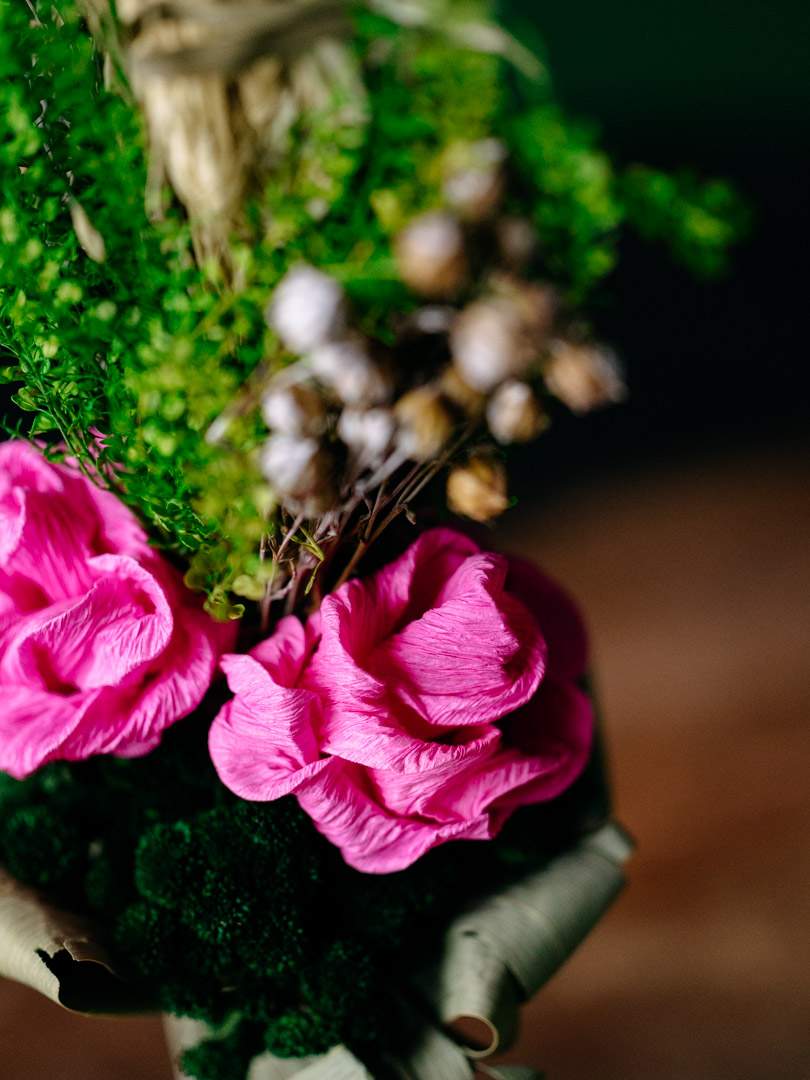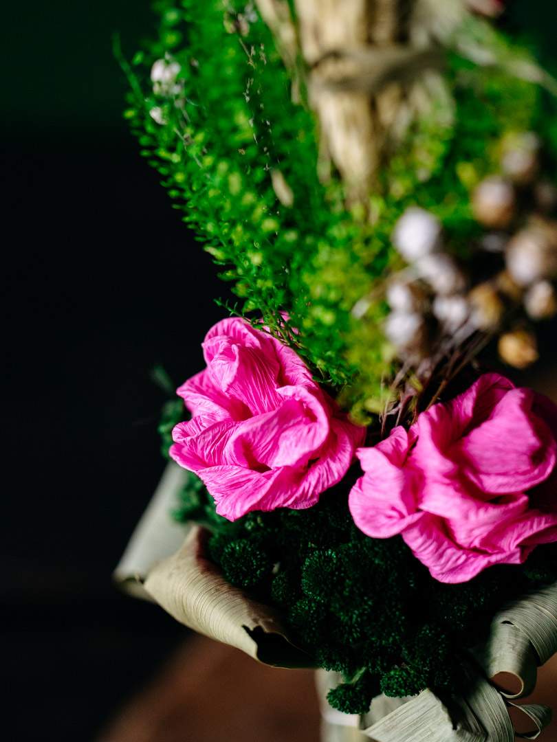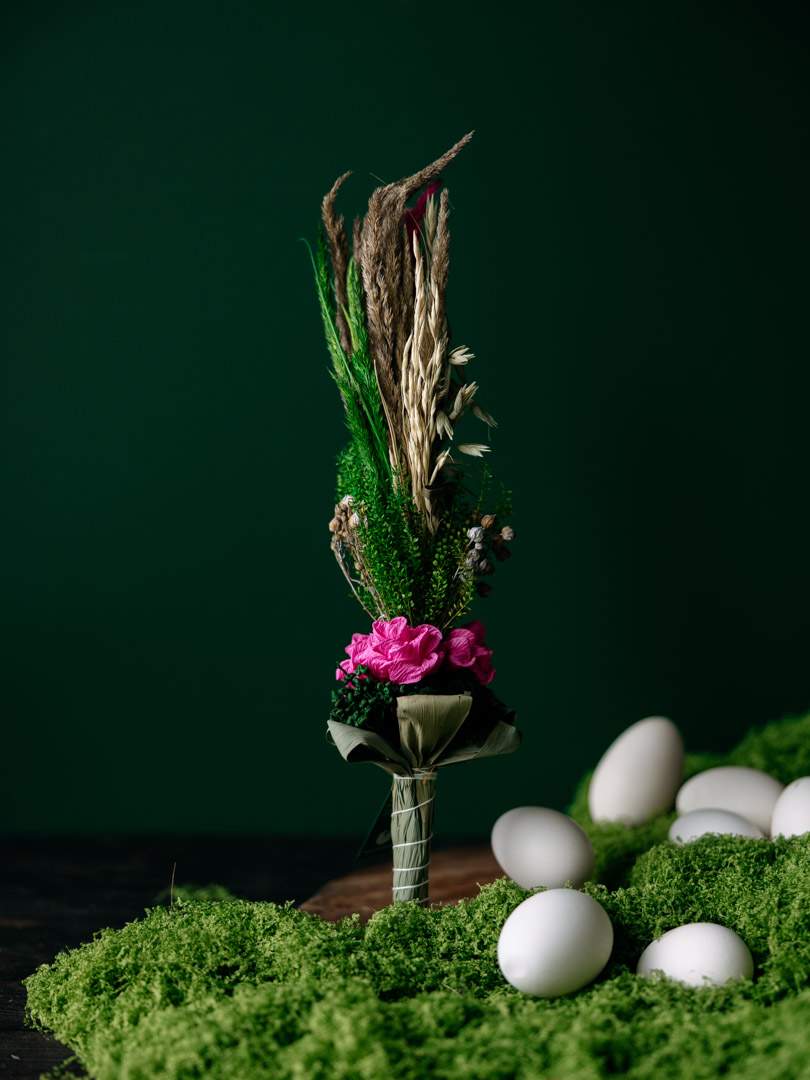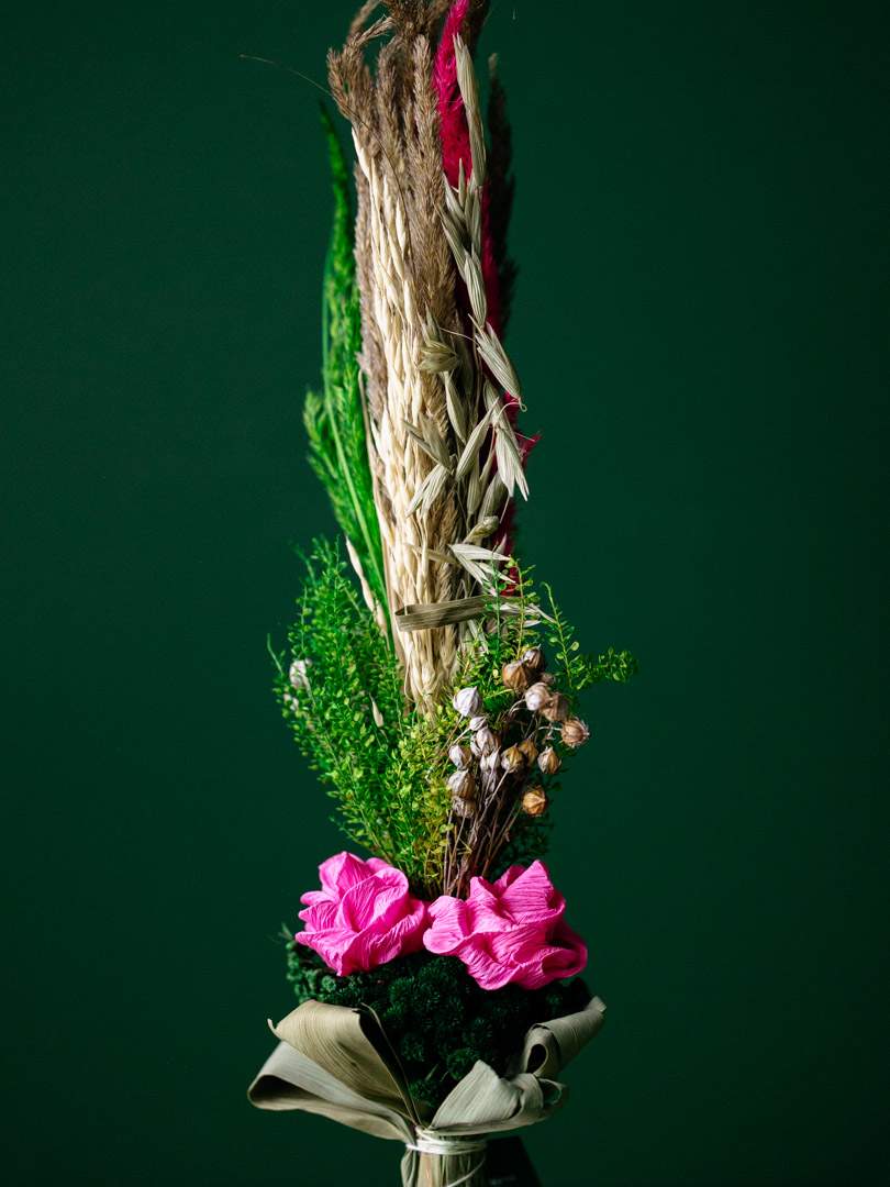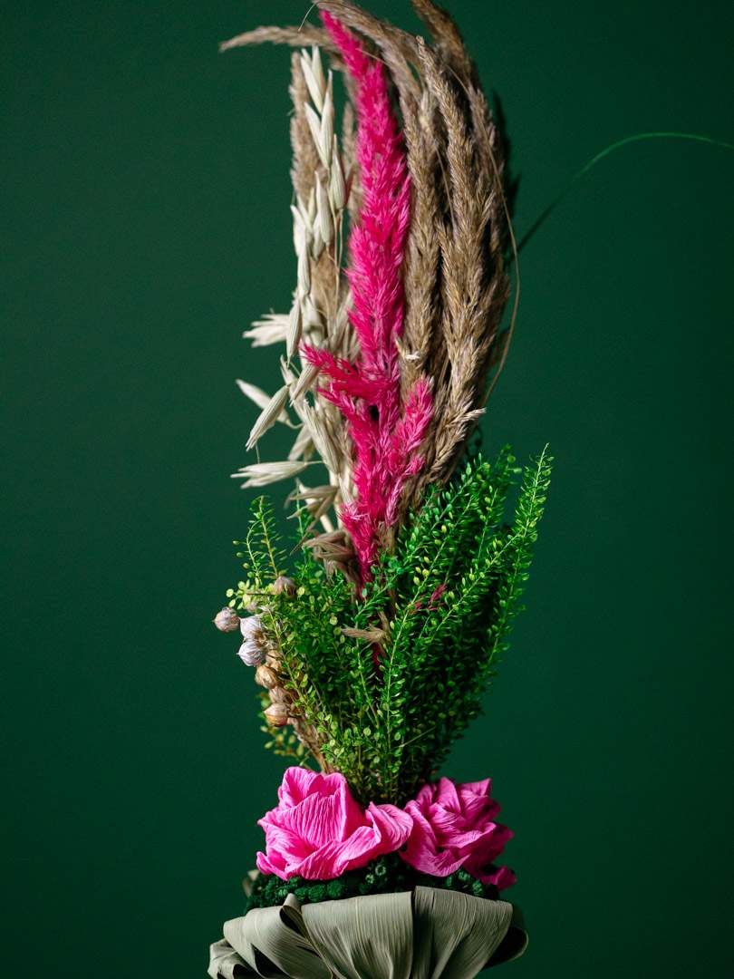 Ręcznie wykonana, mała palemka wielkanocna zdobiona suszonymi elementami, formowanymi na wzór różowych różyczek. Palma została wykonana wyłącznie z naturalnych, suszonych składników. Znajdują się tam trawy, zboża czy kwiaty misternie ułożone w oryginalną kompozycję.