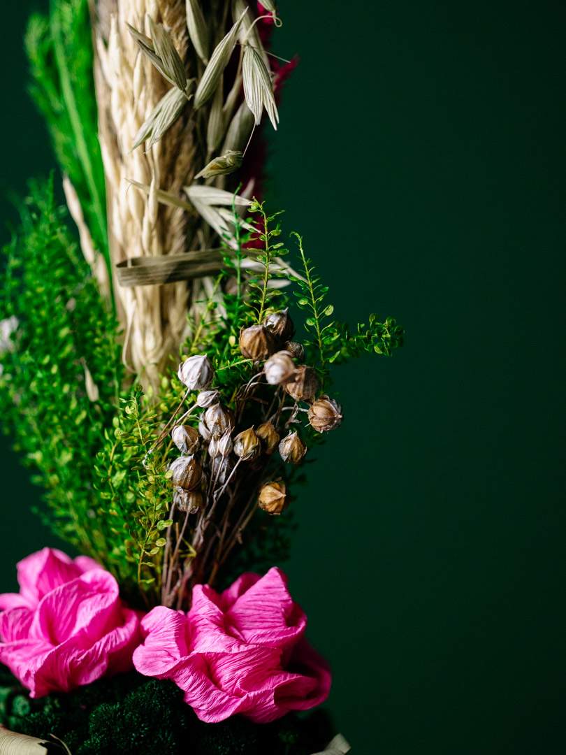 - Materiał: suszone trawy, trzciny i zboża z polskich pól, dekoracje z łuby drzewnej, bibuła