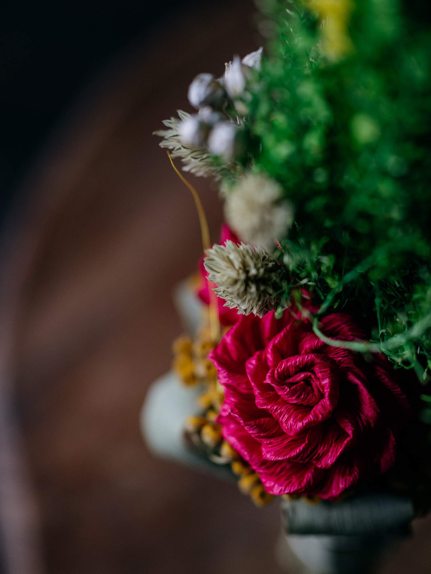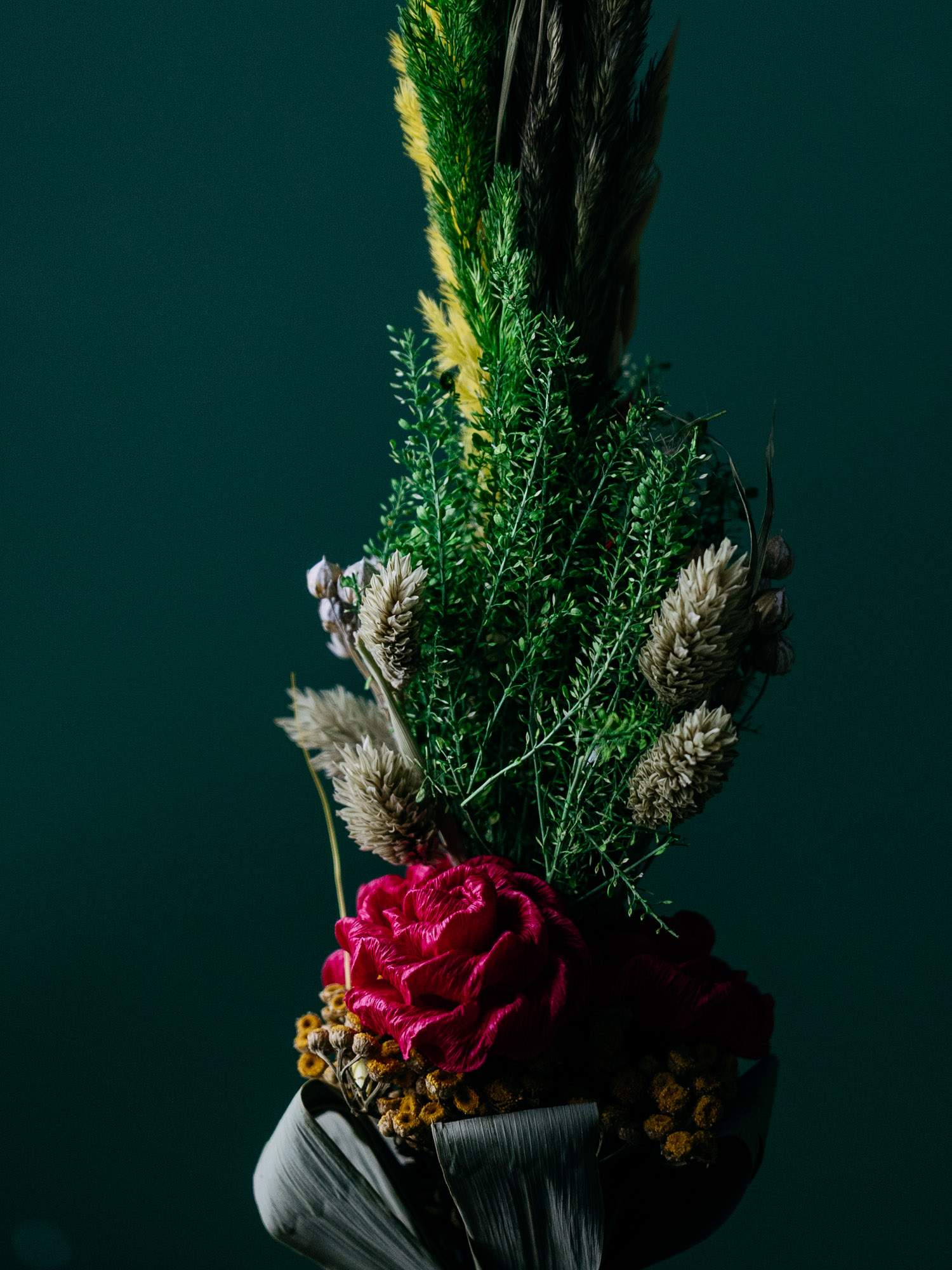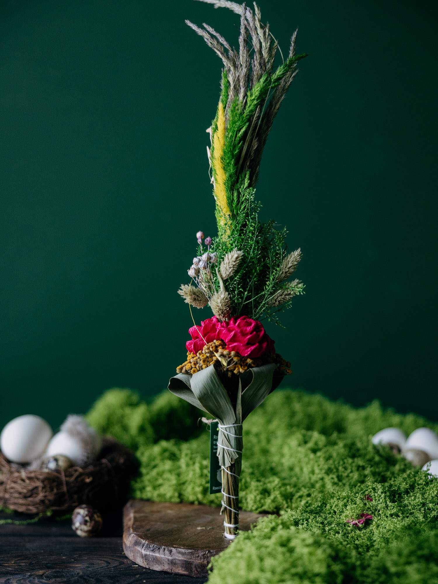 Palma wielkanocna wykonana ręcznie z suszonych traw, gałązek oraz zielonych dodatków roślinnych. W części środkowej umieszczone zostały rubinowe różyczki z bibuły. Całość tworzy lekką, naturalną kompozycję.