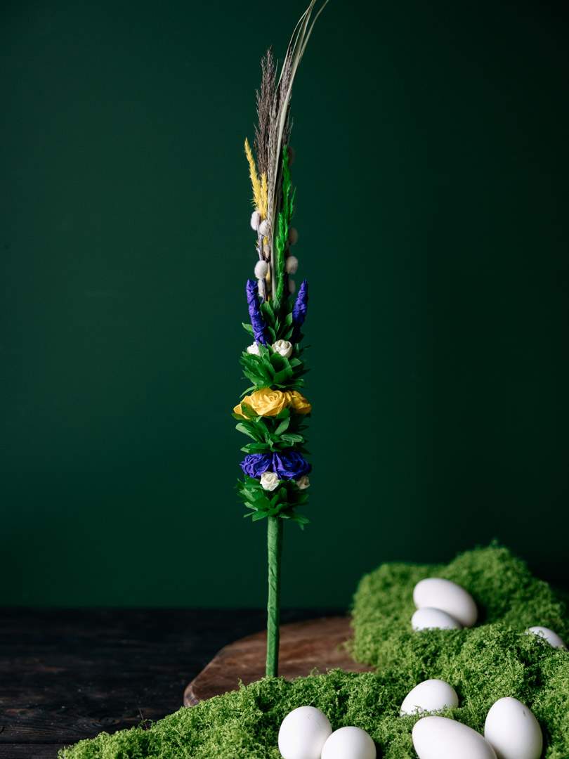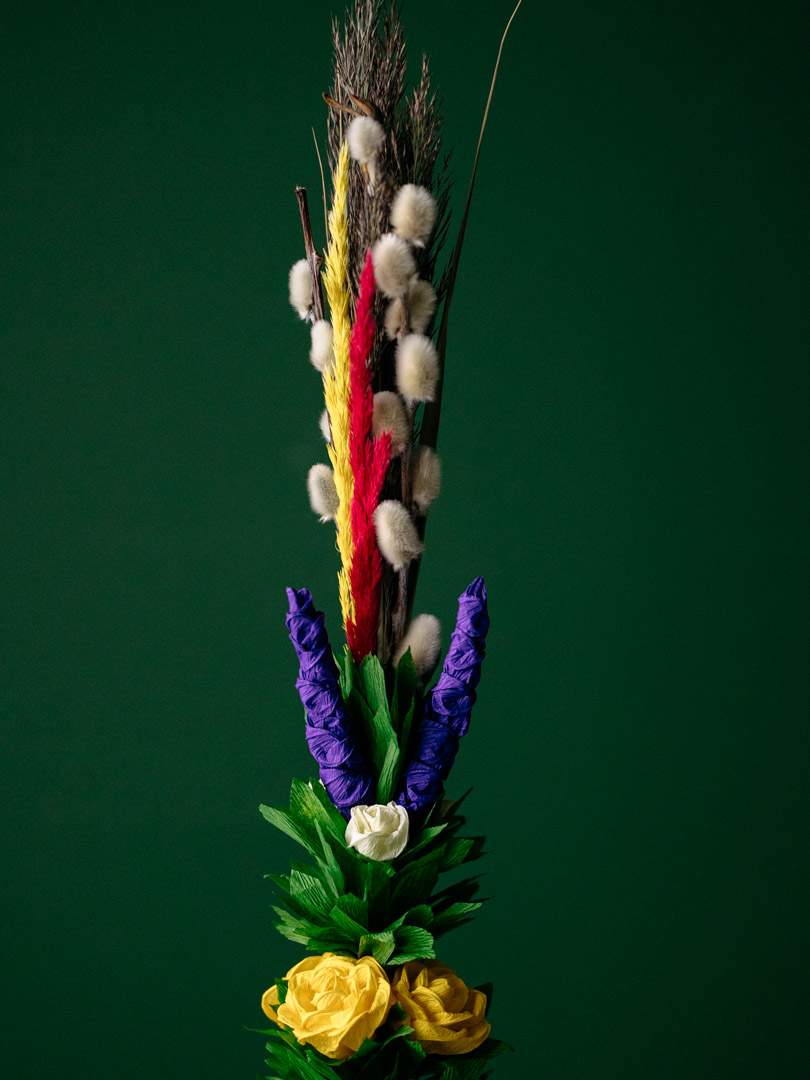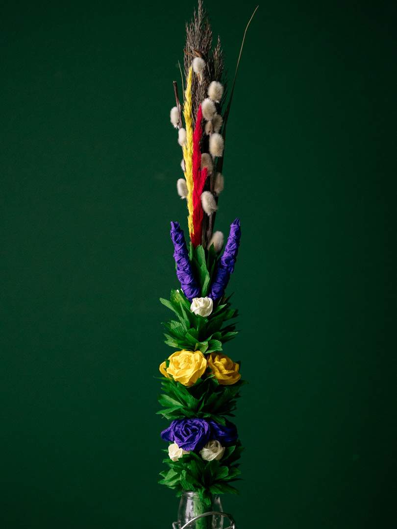 Mała palma wielkanocna wykonana ręcznie z kolorowej bibuły oraz elementów roślinnych. Palma o wysokościu 60 cm doskonale nadaje się do tradycyjnego święcenia palm oraz jako dekoracja wielkanocna do wnętrz.