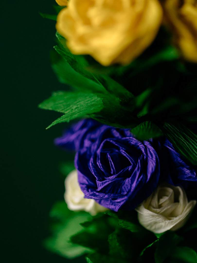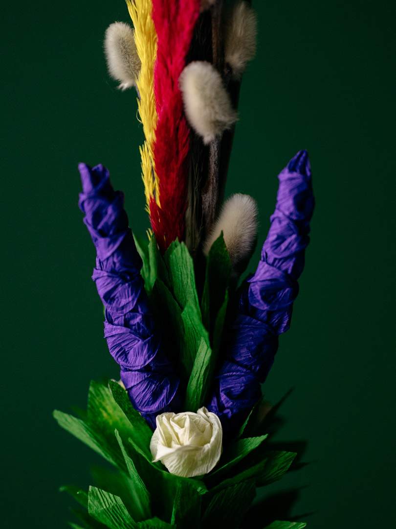 Ręcznie wykonana palma wielkanocna z bibuły w odcieniach fioletowo-żółtych.