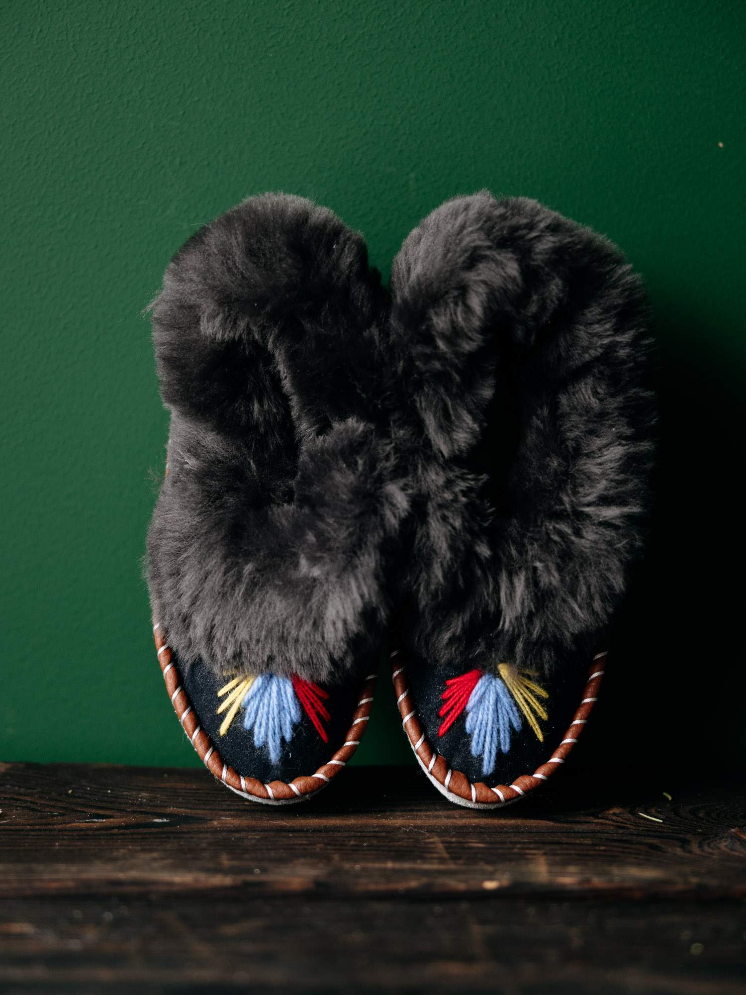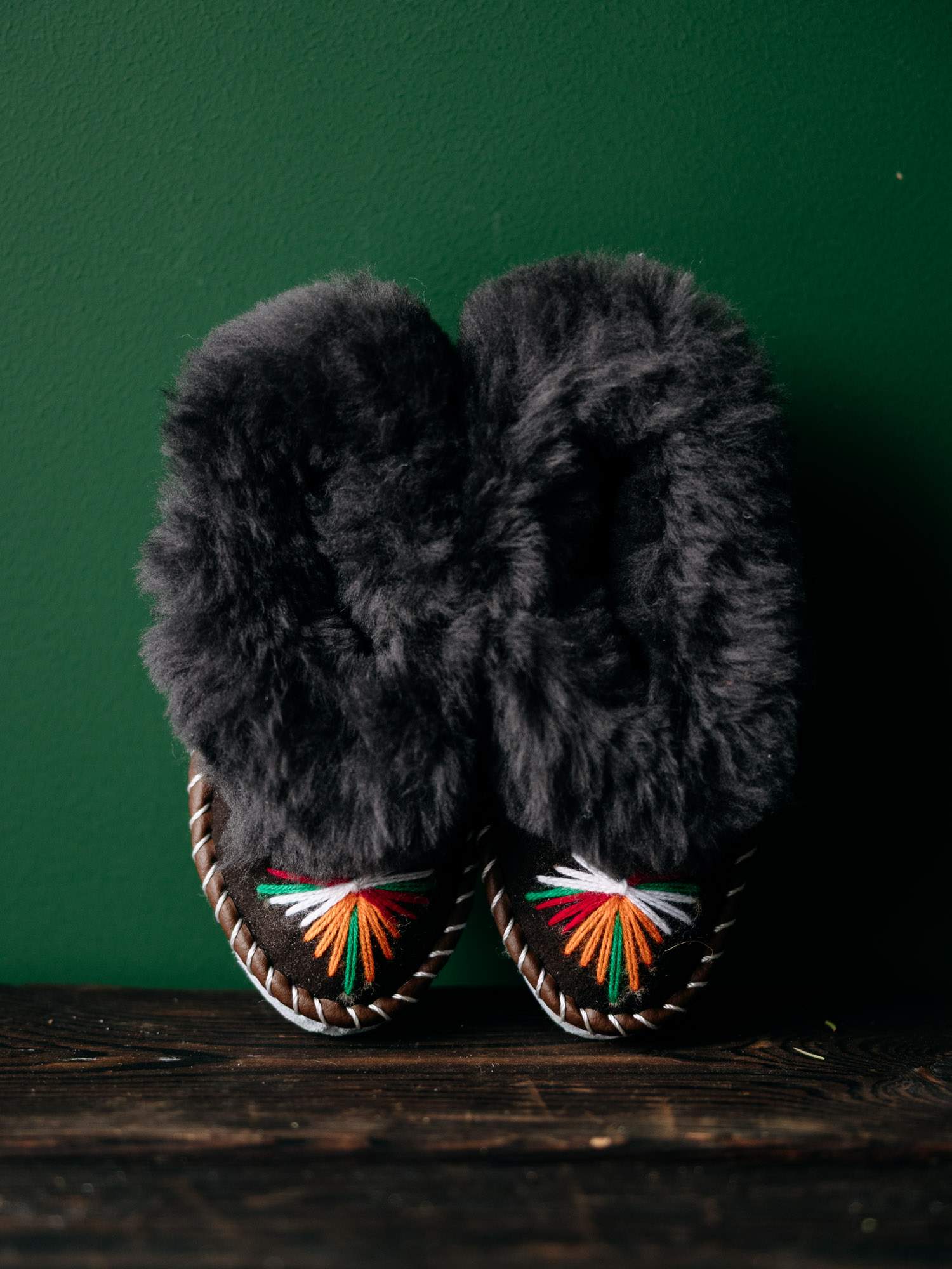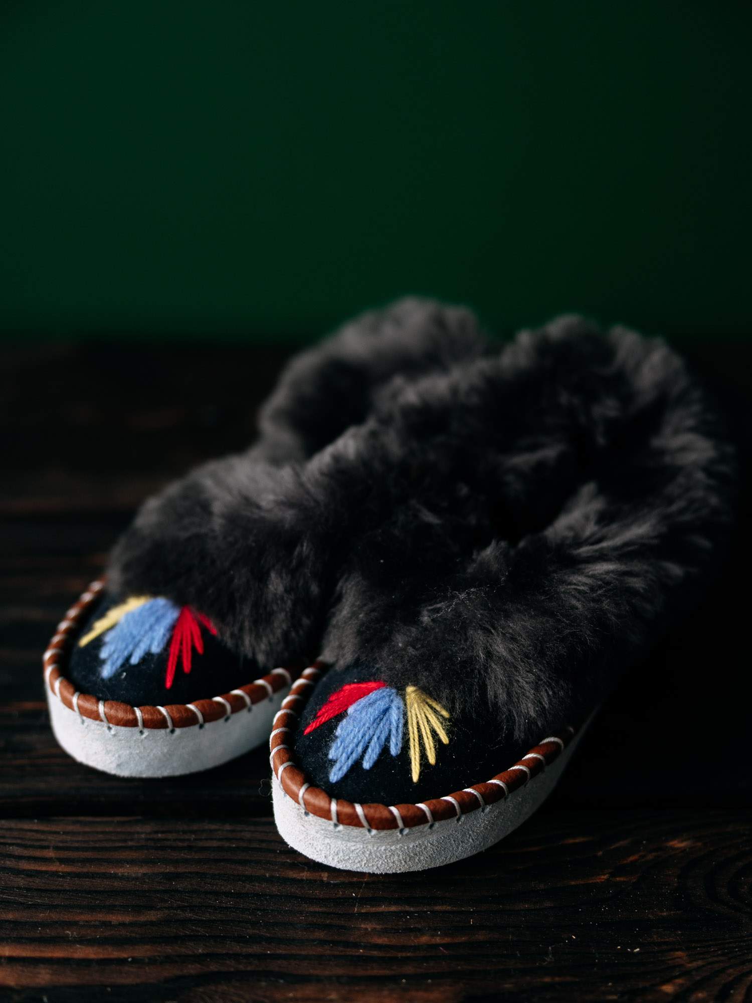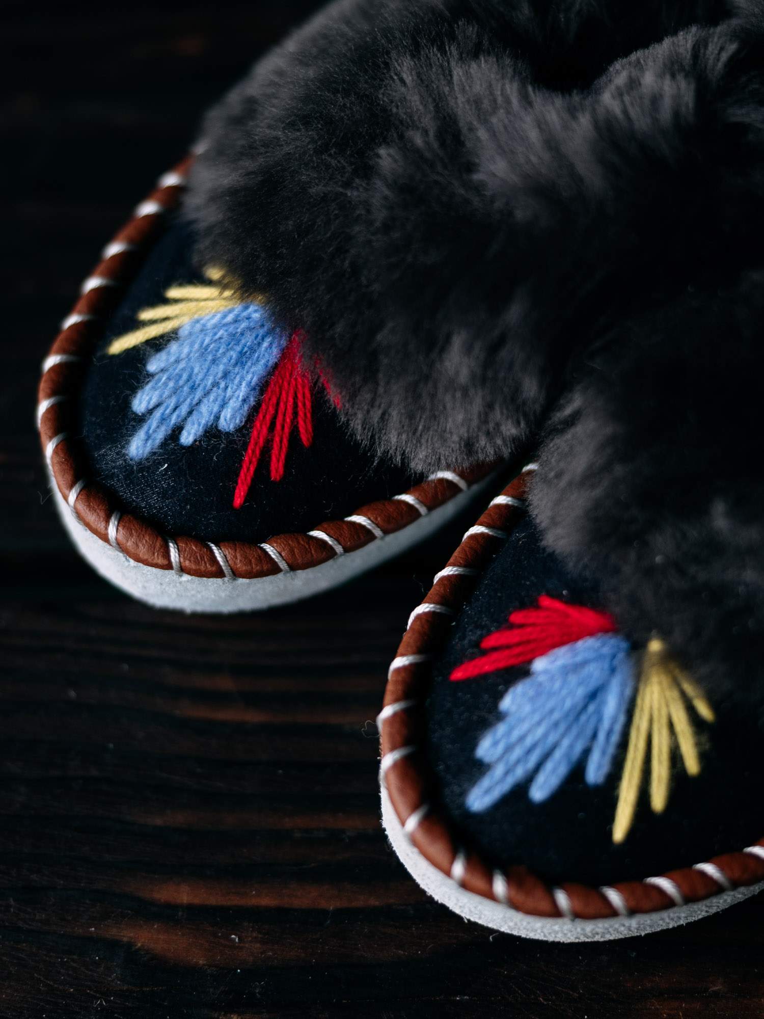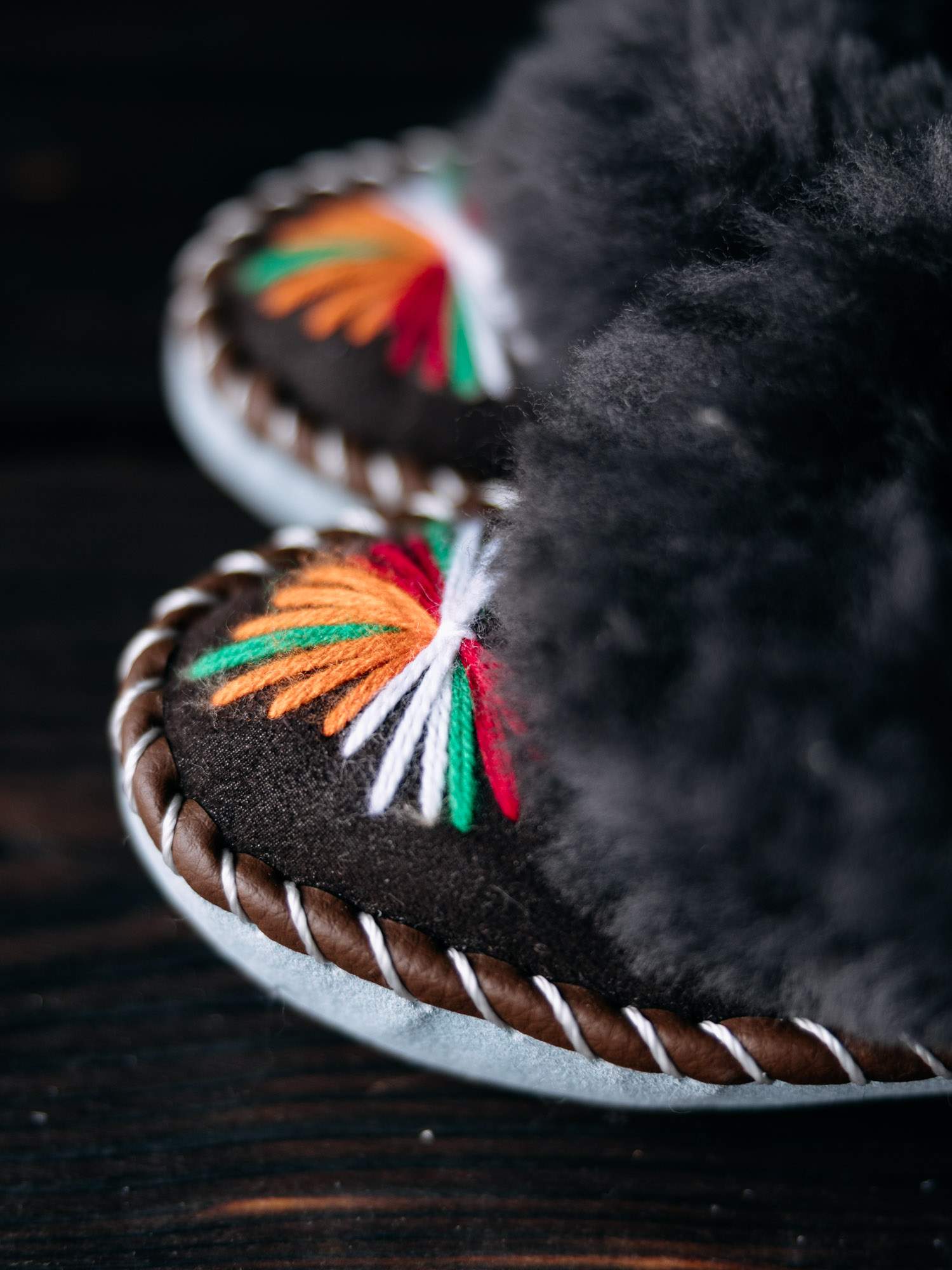 Pantofle wyszywane z ciemnym futerkiem - skóra i wełna