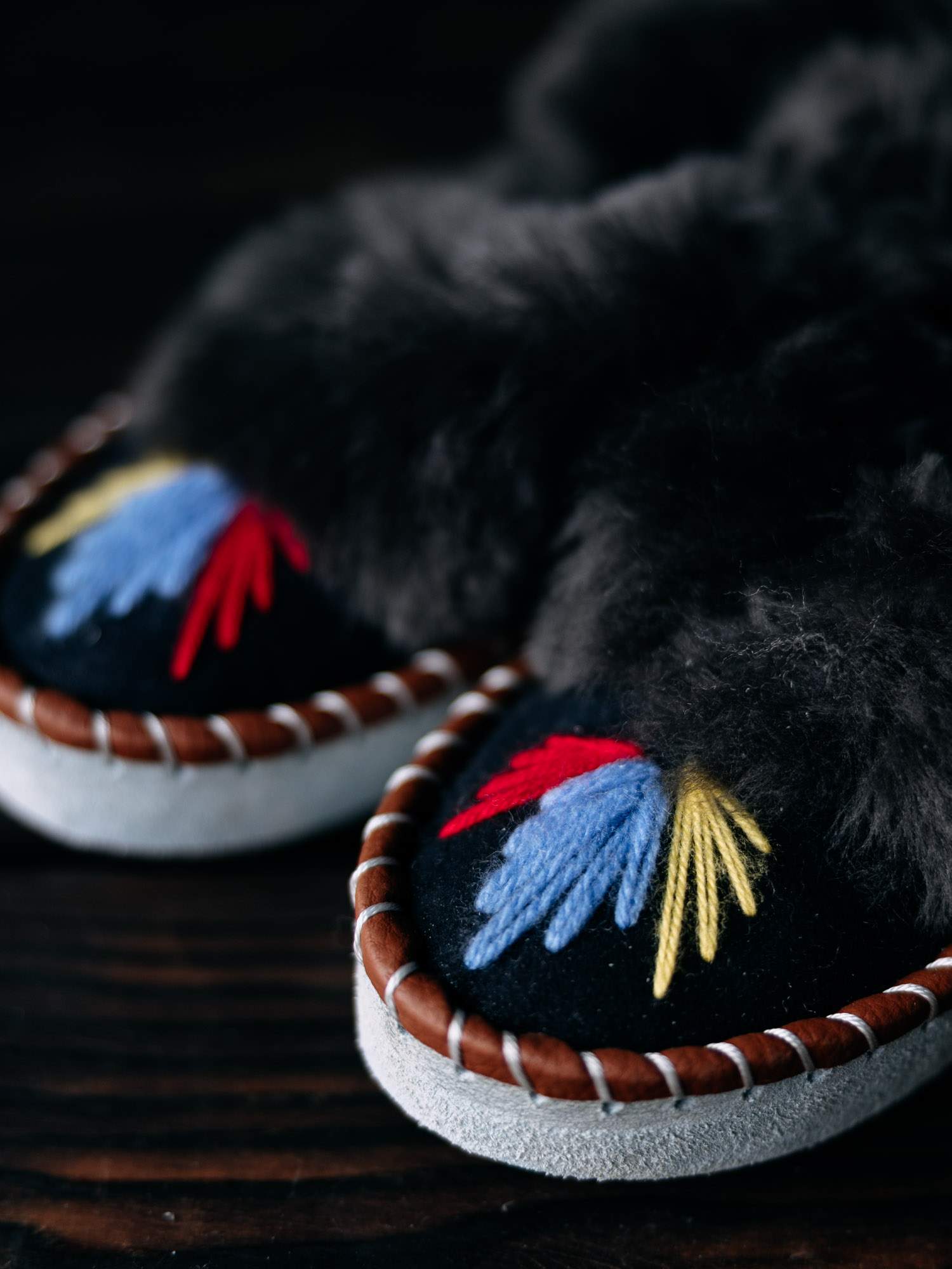 Tradycyjne pantofle z ciemnym futerkiem i wyszyciem.