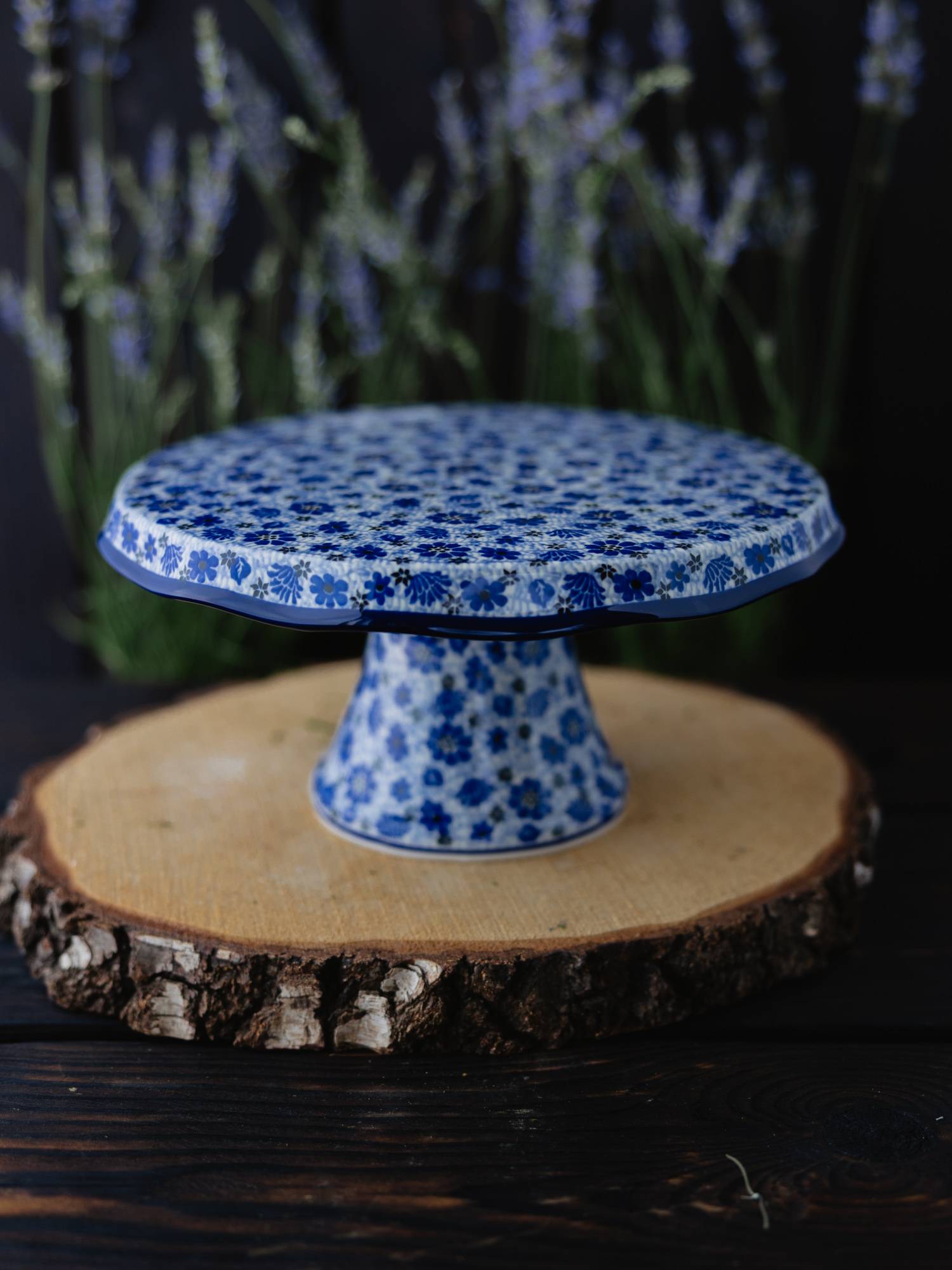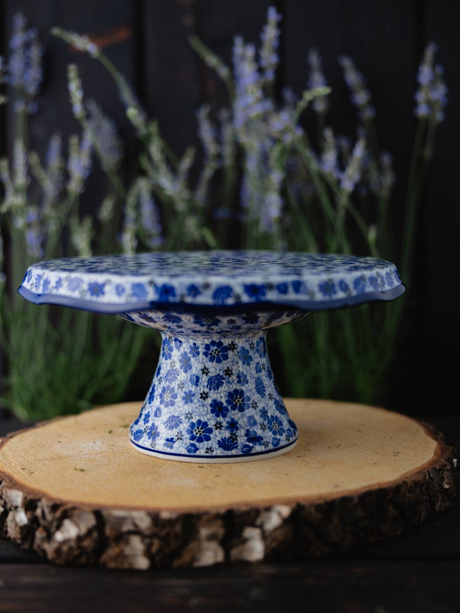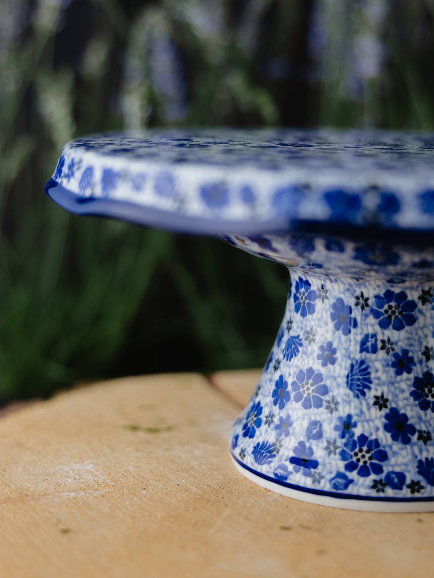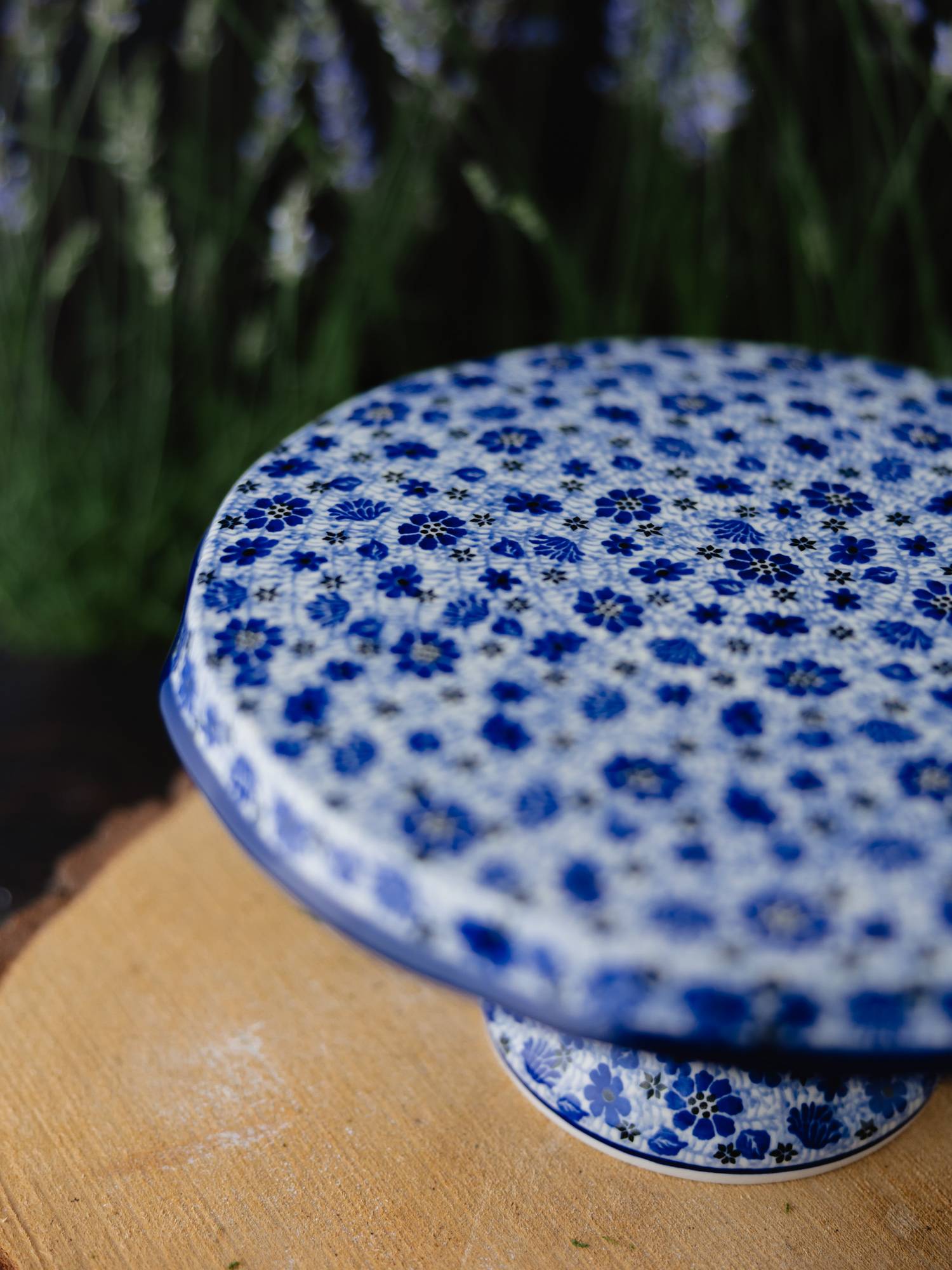Okrągła patera na rozszerzanej stopce. Jasna ceramika została ozdobiona ręcznie, kobaltowo-niebieskim wzorem łąki. Patera ma formę szerokiego, płaskiego talerza umieszczonego na masywnej stopce rozszerzającej się ku podstawie. Krawędź górnej części patery wykonano w delikatnie falowanej, ozdobnej formie. Całość tworzy stabilną podstawę, idealną do serwowania ciast i deserów. Patera została wykonana w „Ceramice Artystycznej” w Bolesławcu.