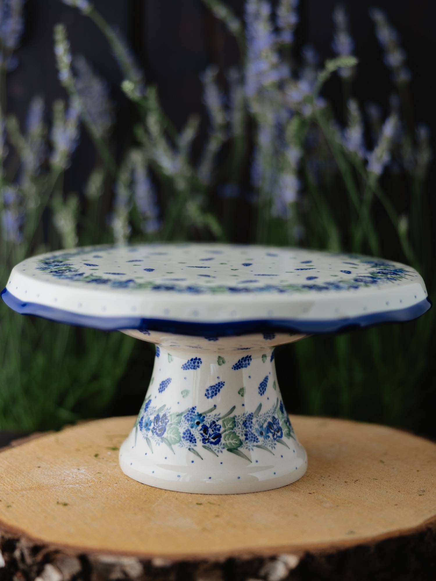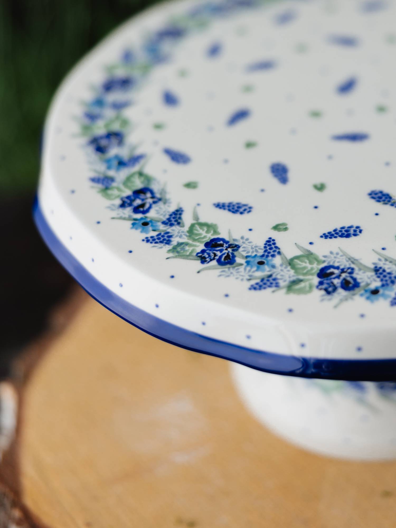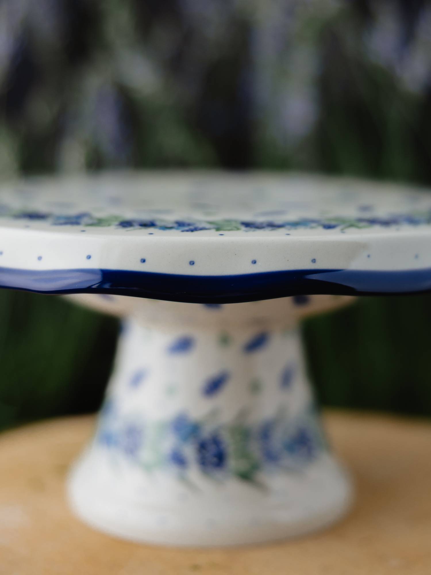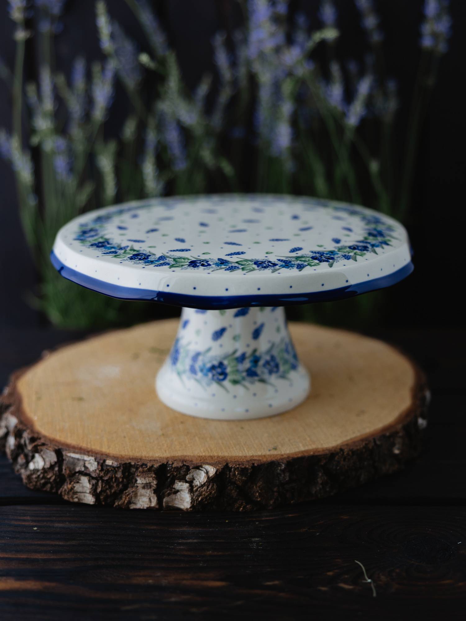Okrągła patera na rozszerzanej stopce. Jasna ceramika została ozdobiona ręcznie, kobaltowo-zielonym wzorem wianka. Patera ma formę szerokiego, płaskiego talerza umieszczonego na masywnej stopce rozszerzającej się ku podstawie. Krawędź górnej części patery wykonano w delikatnie falowanej, ozdobnej formie. Całość tworzy stabilną podstawę, idealną do serwowania ciast i deserów. Patera została wykonana w „Ceramice Artystycznej” w Bolesławcu.
