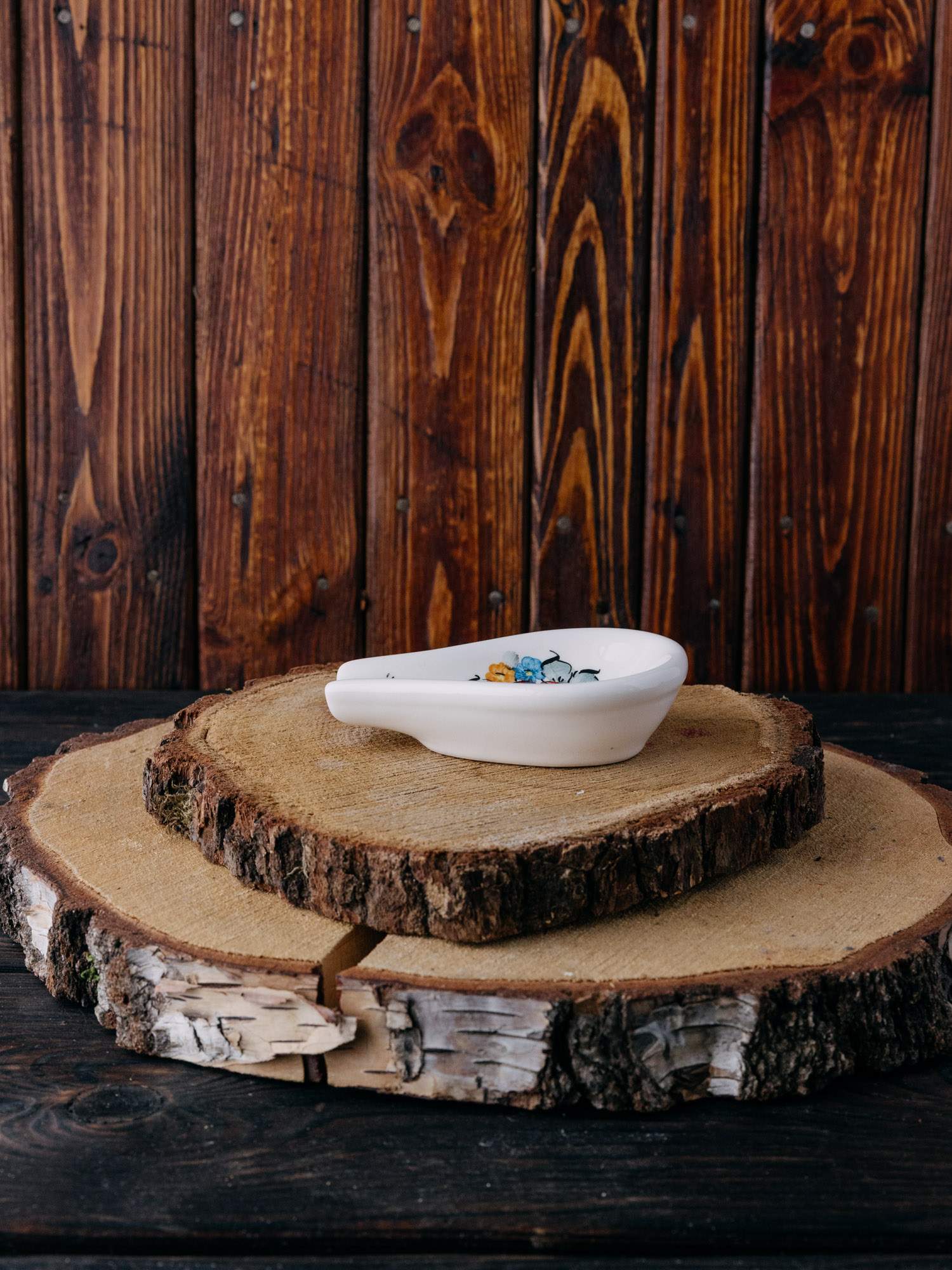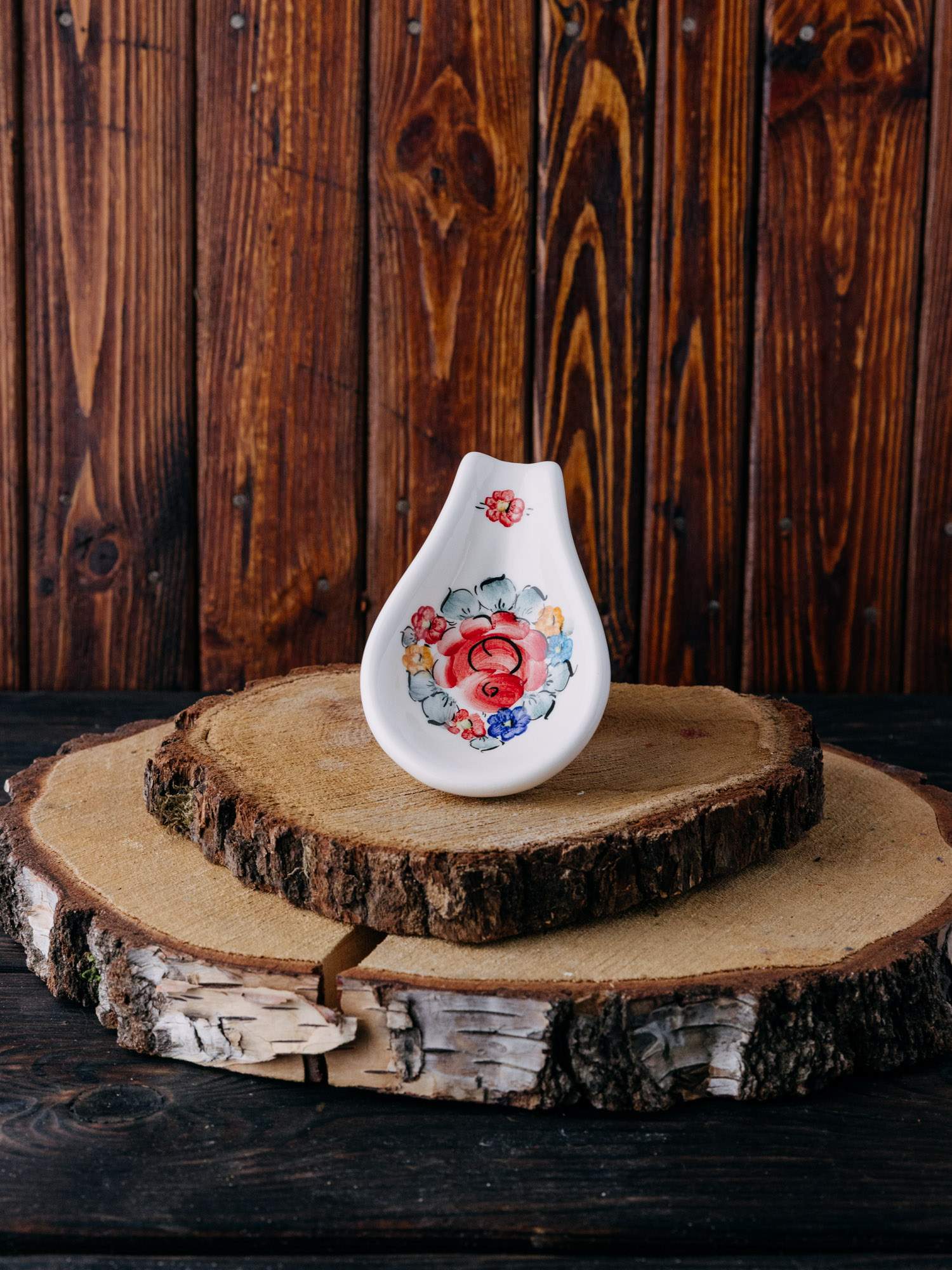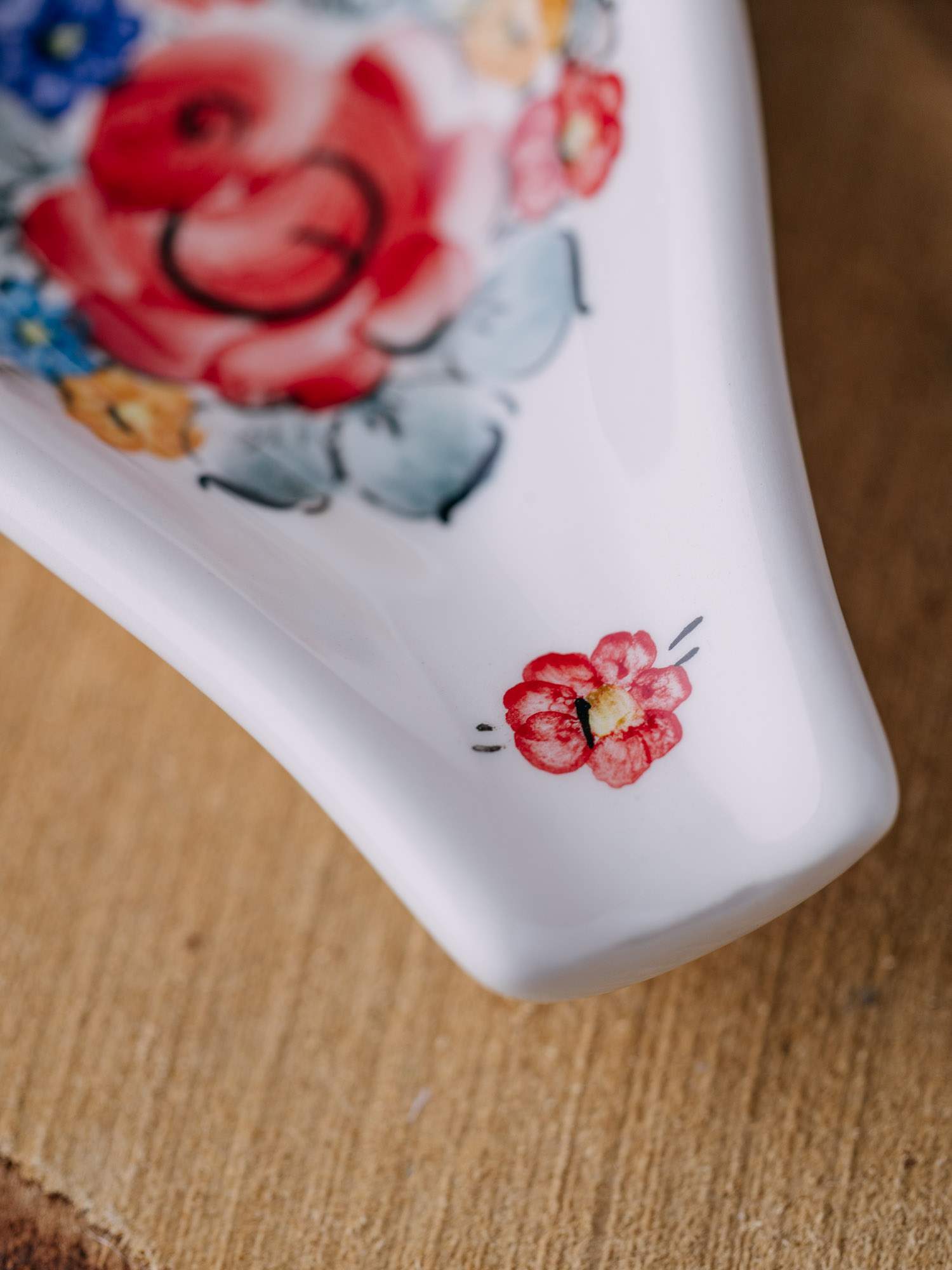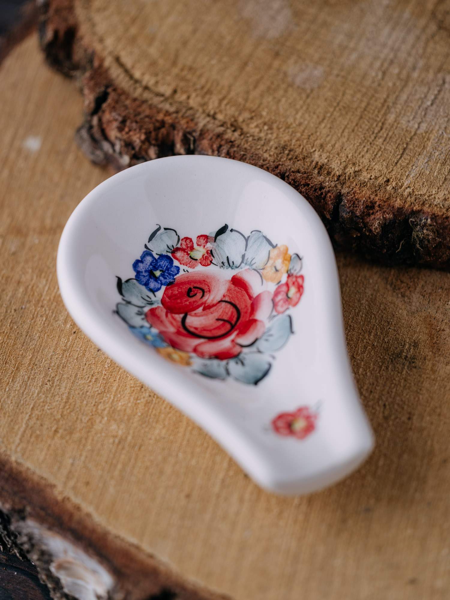 Owalna podstawka na łyżkę z tradycyjnym kolorowym wzorem kwiatowym.