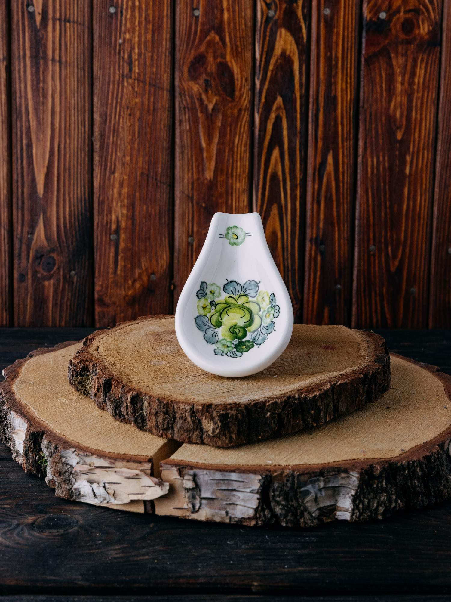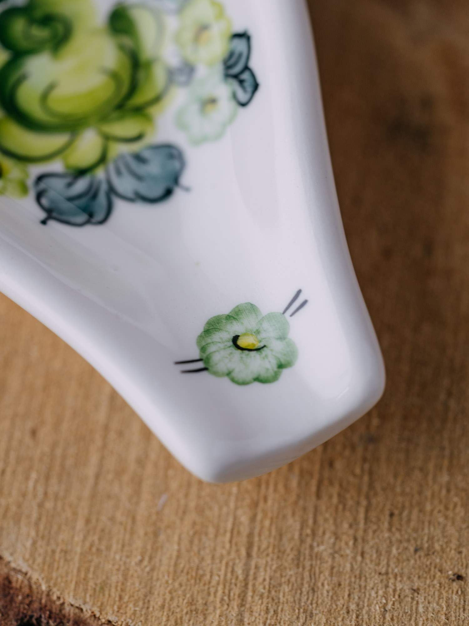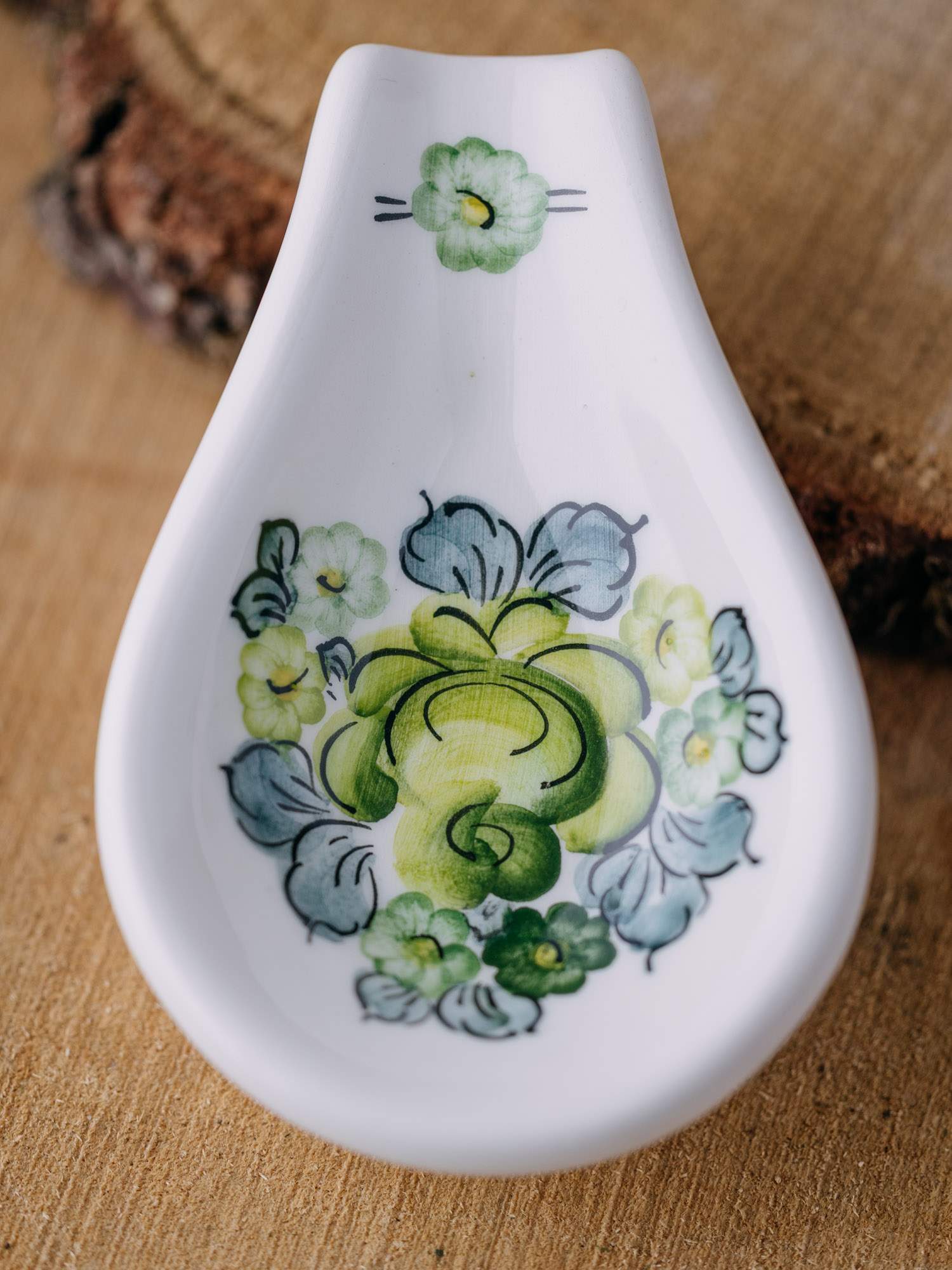 Ceramiczna podstawka pod łyżkę z Fajansu Włocławek, zdobiona zielonym wzorem. Jej staranne wykonanie i klasyczny styl sprawiają, że jest praktyczna i estetyczna. Doskonała do codziennego użytku oraz jako urokliwa ozdoba.