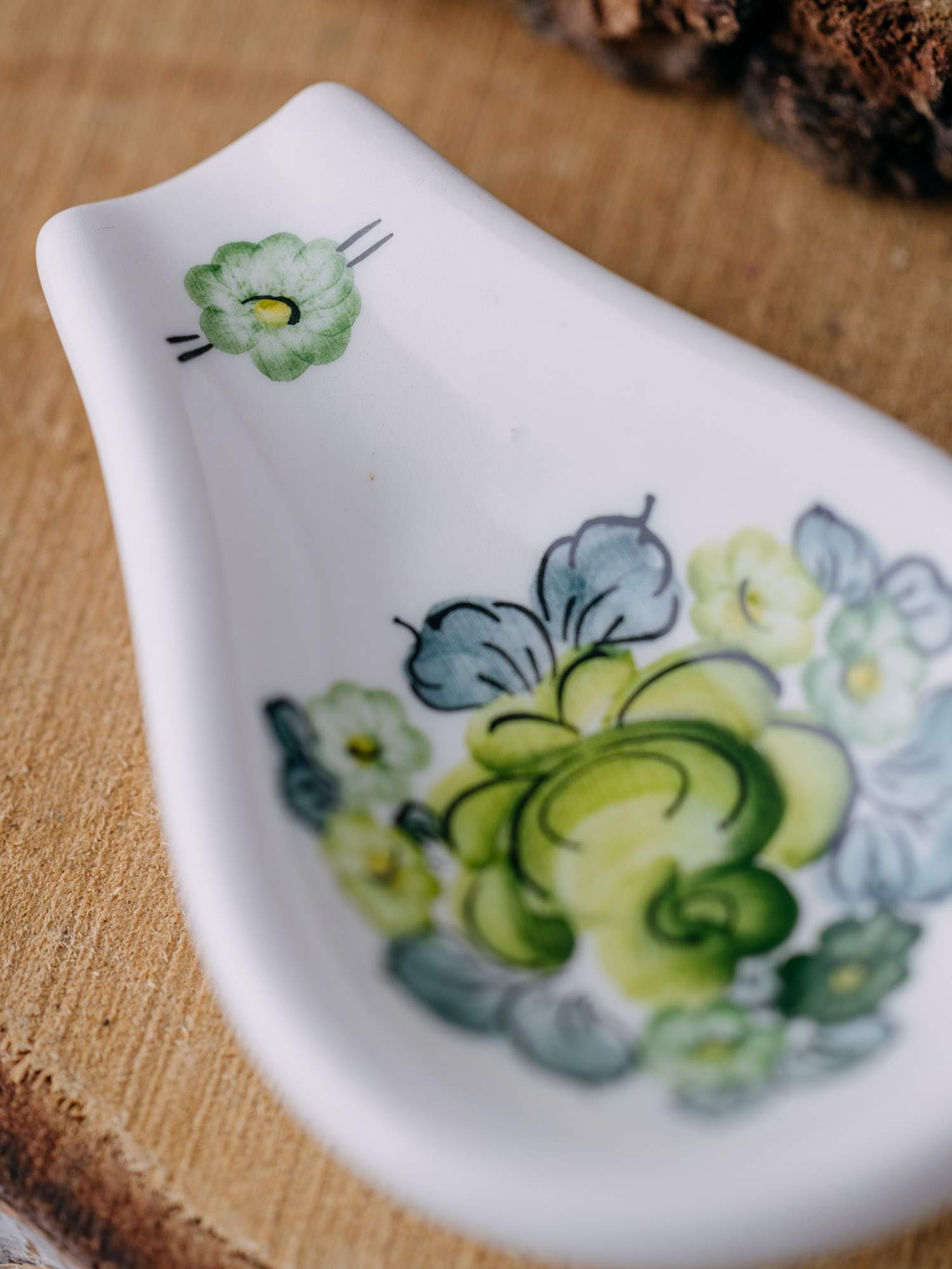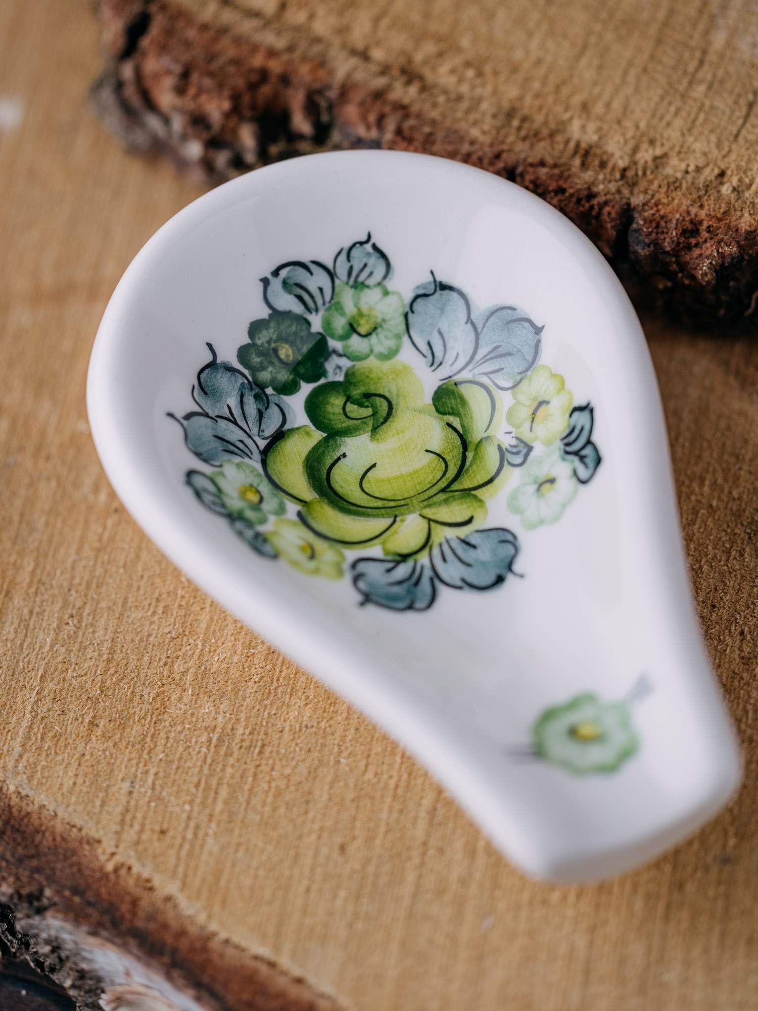 Owalna podstawka na łyżkę z zielonym wzorem kwiatowym.