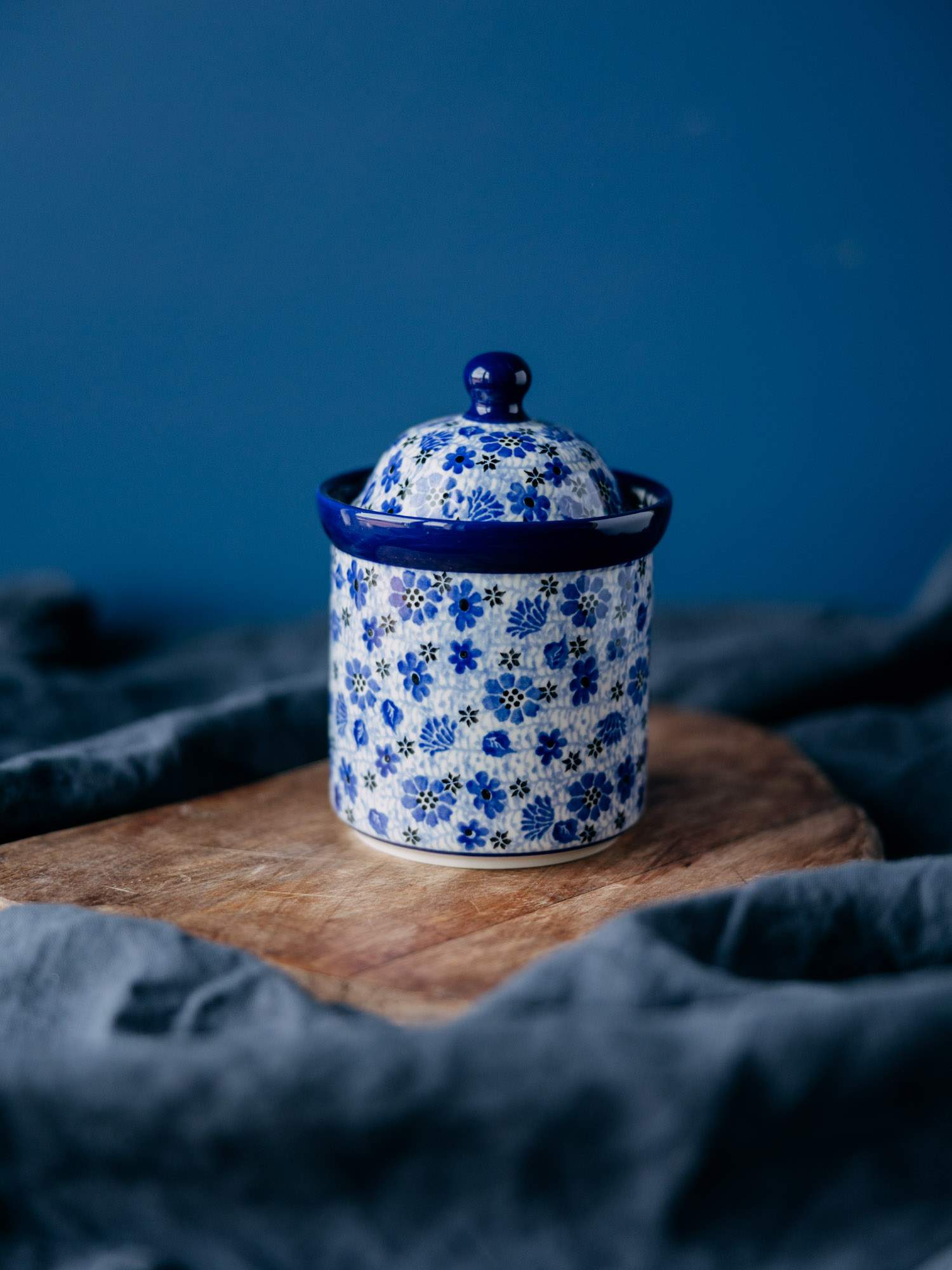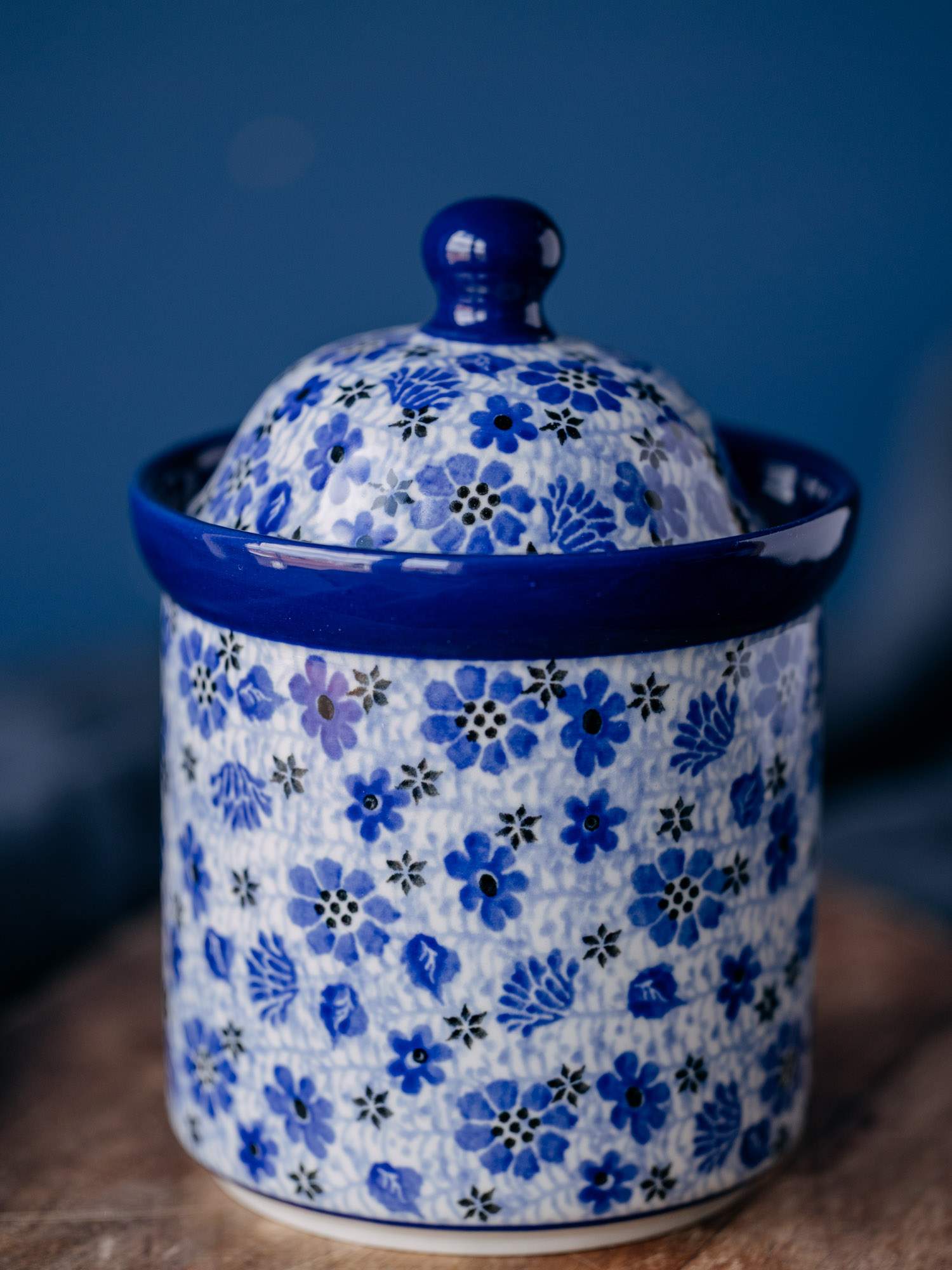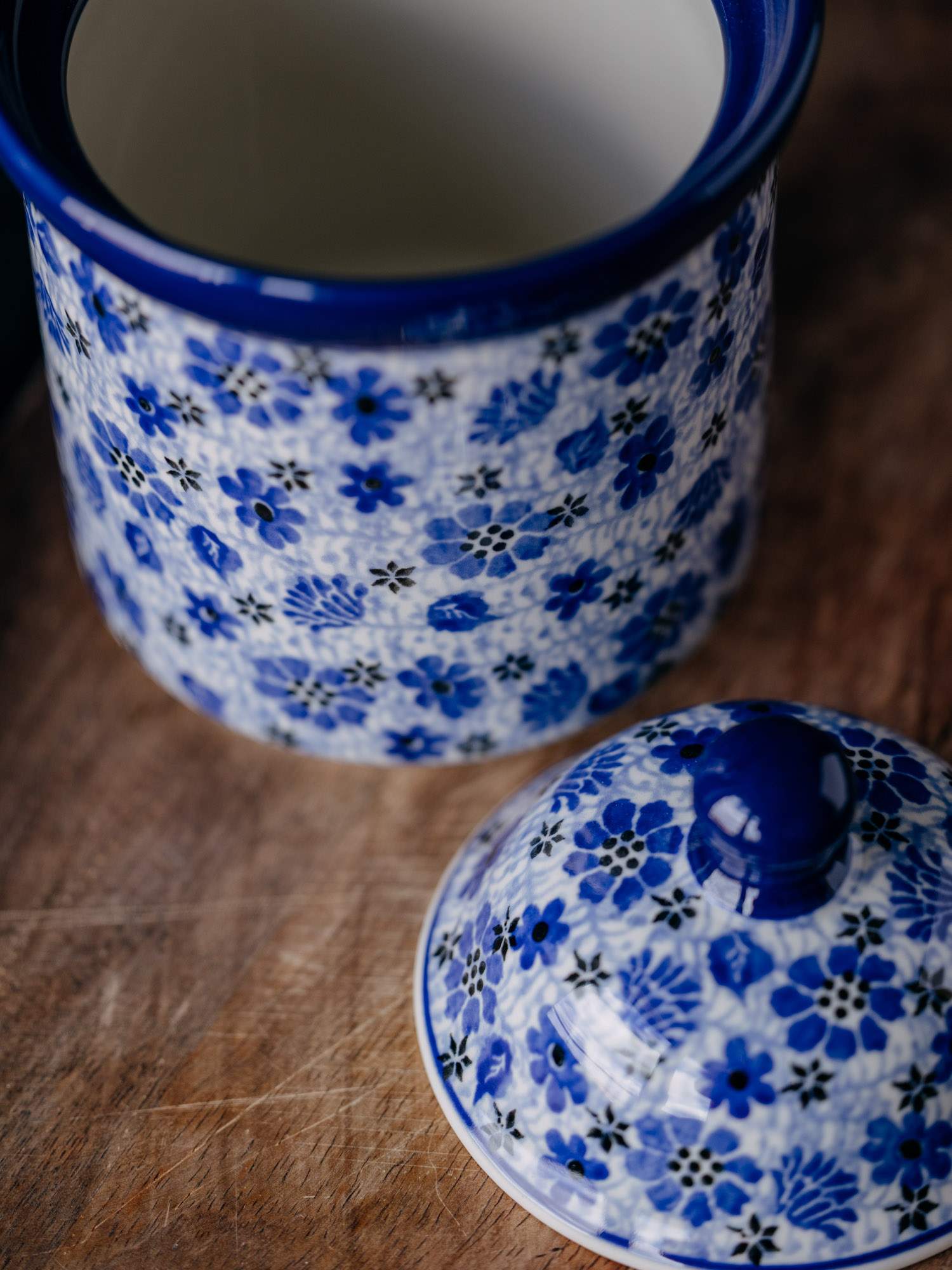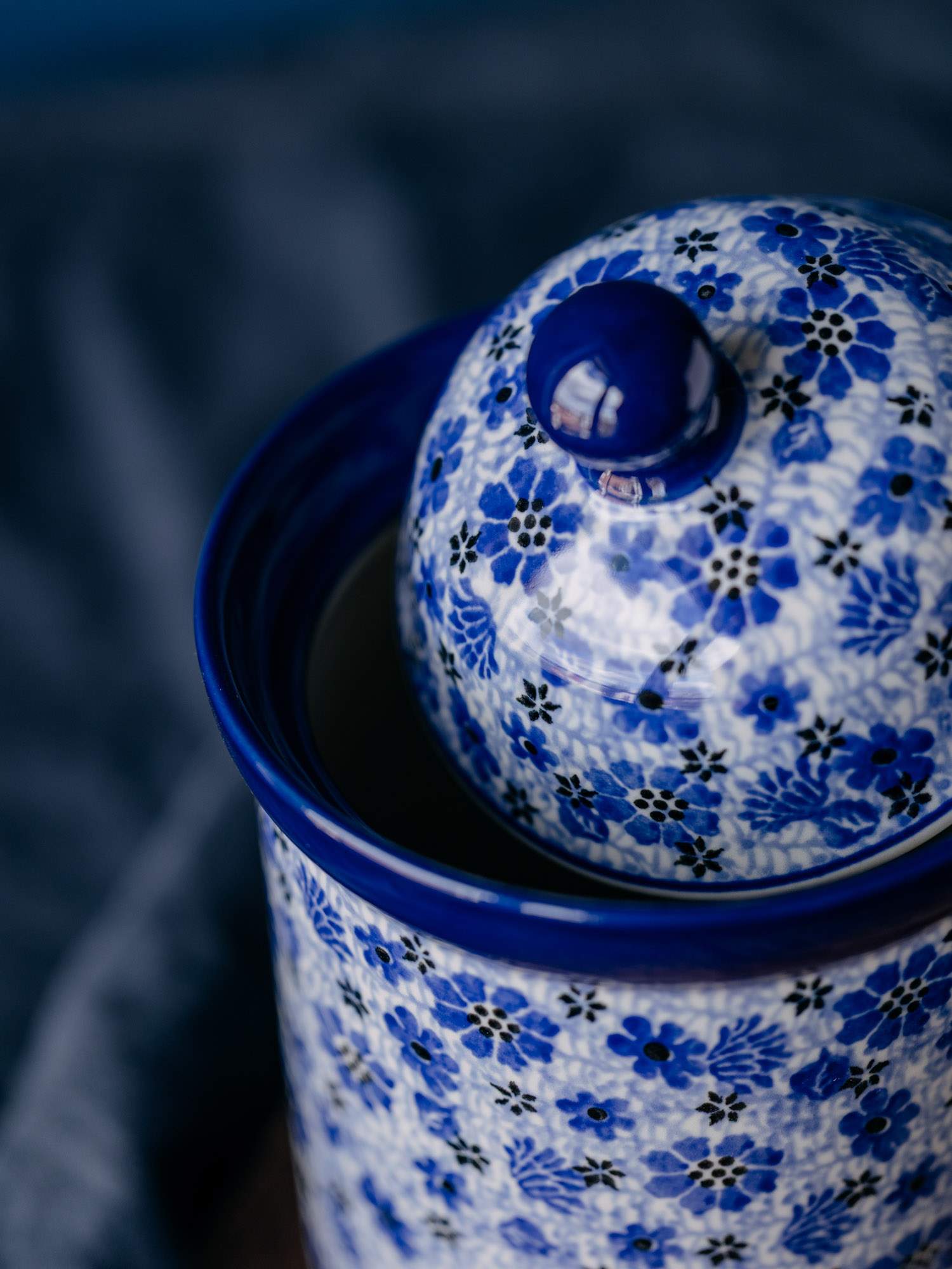 Klasyczny, okrągły pojemnik w zestawie z przykrywką. Jasna ceramika została ozdobiona ręcznie, niebiesko-kobaltowym wzorem łąki. Wysokiej jakości ceramika sprawia, że jest idealny do przechowywania kawy, herbaty lub cukru. Pojemnik został wykonany w „Ceramice Artystycznej” w Bolesławcu.