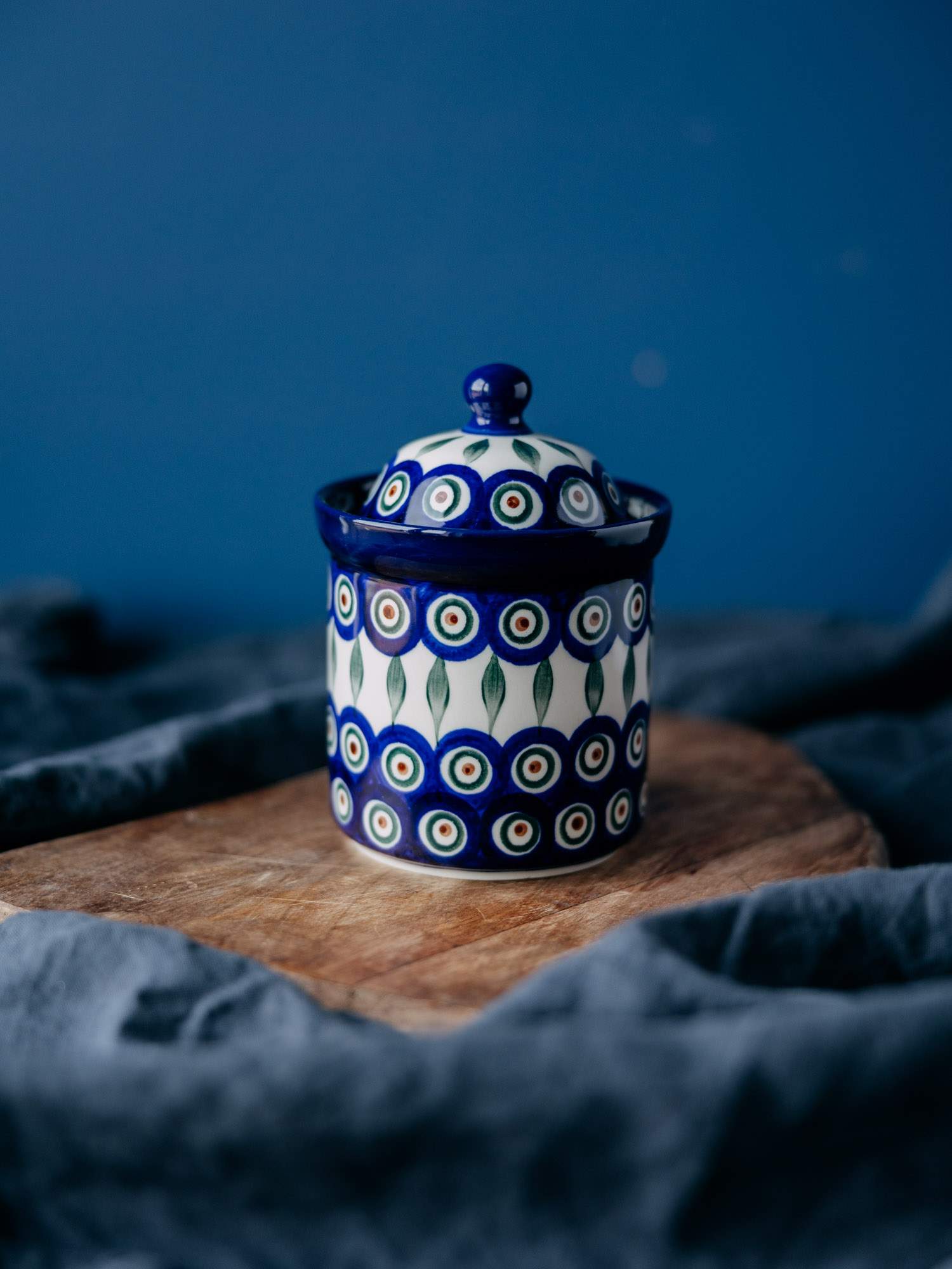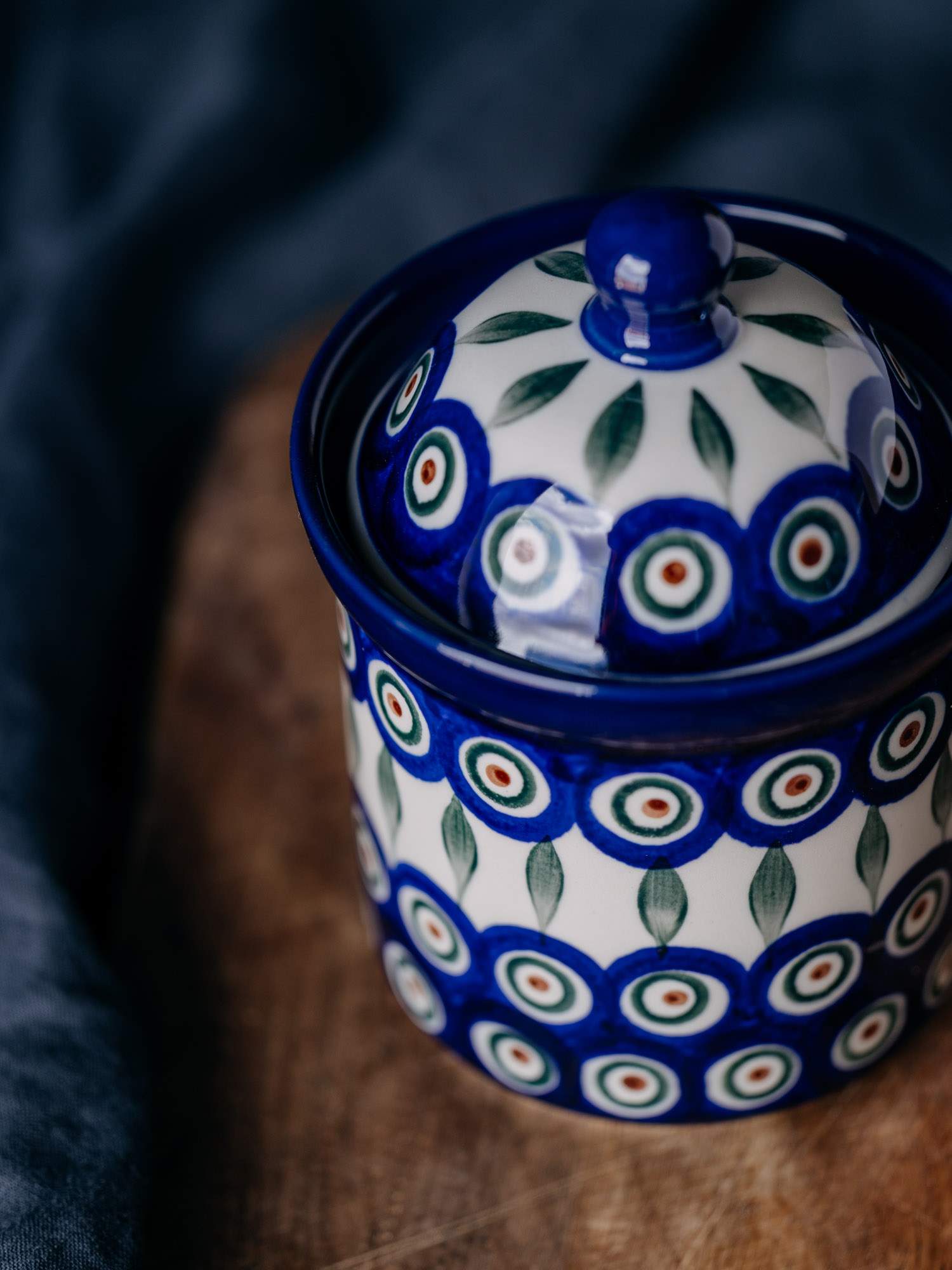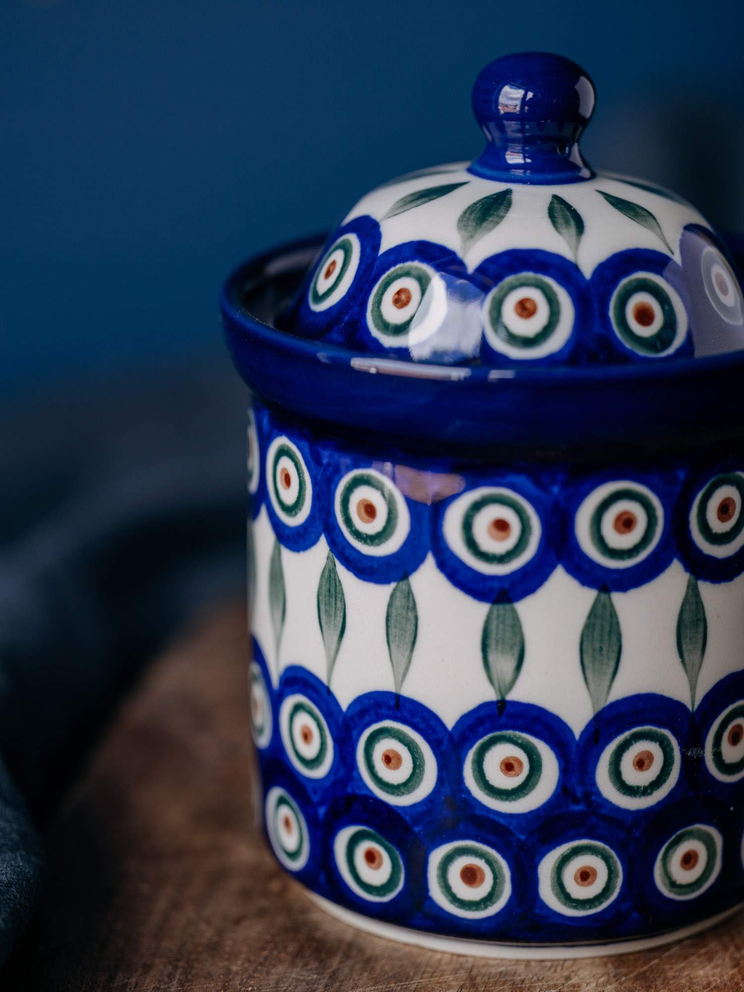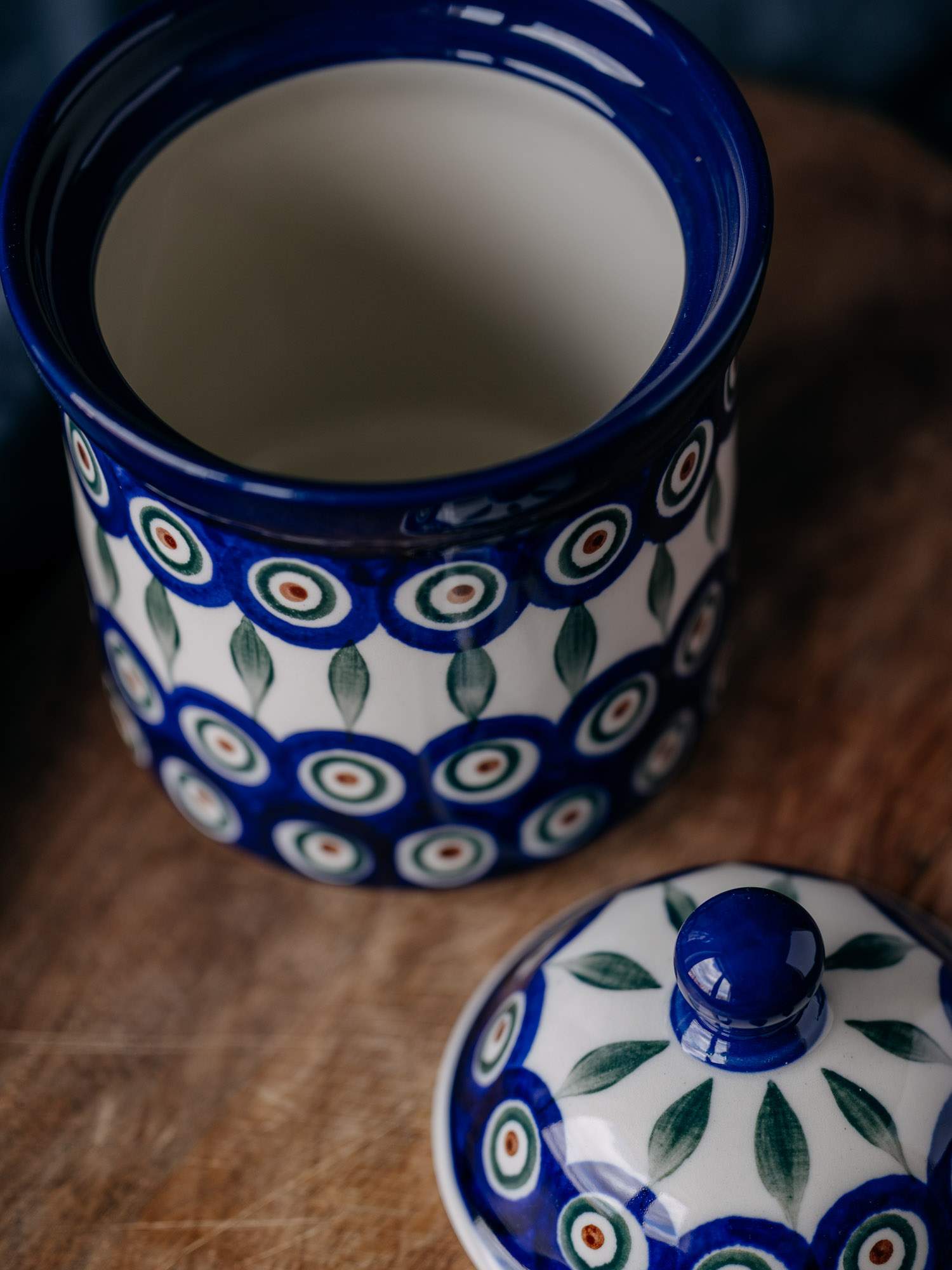 Klasyczny, okrągły pojemnik w zestawie z przykrywką. Jasna ceramika została ozdobiona ręcznie, kobaltowo-zielonym wzorem pawiego oczka z listkiem. Wysokiej jakości ceramika sprawia, że jest idealny do przechowywania kawy, herbaty lub cukru. Pojemnik został wykonany w „Ceramice Artystycznej” w Bolesławcu.