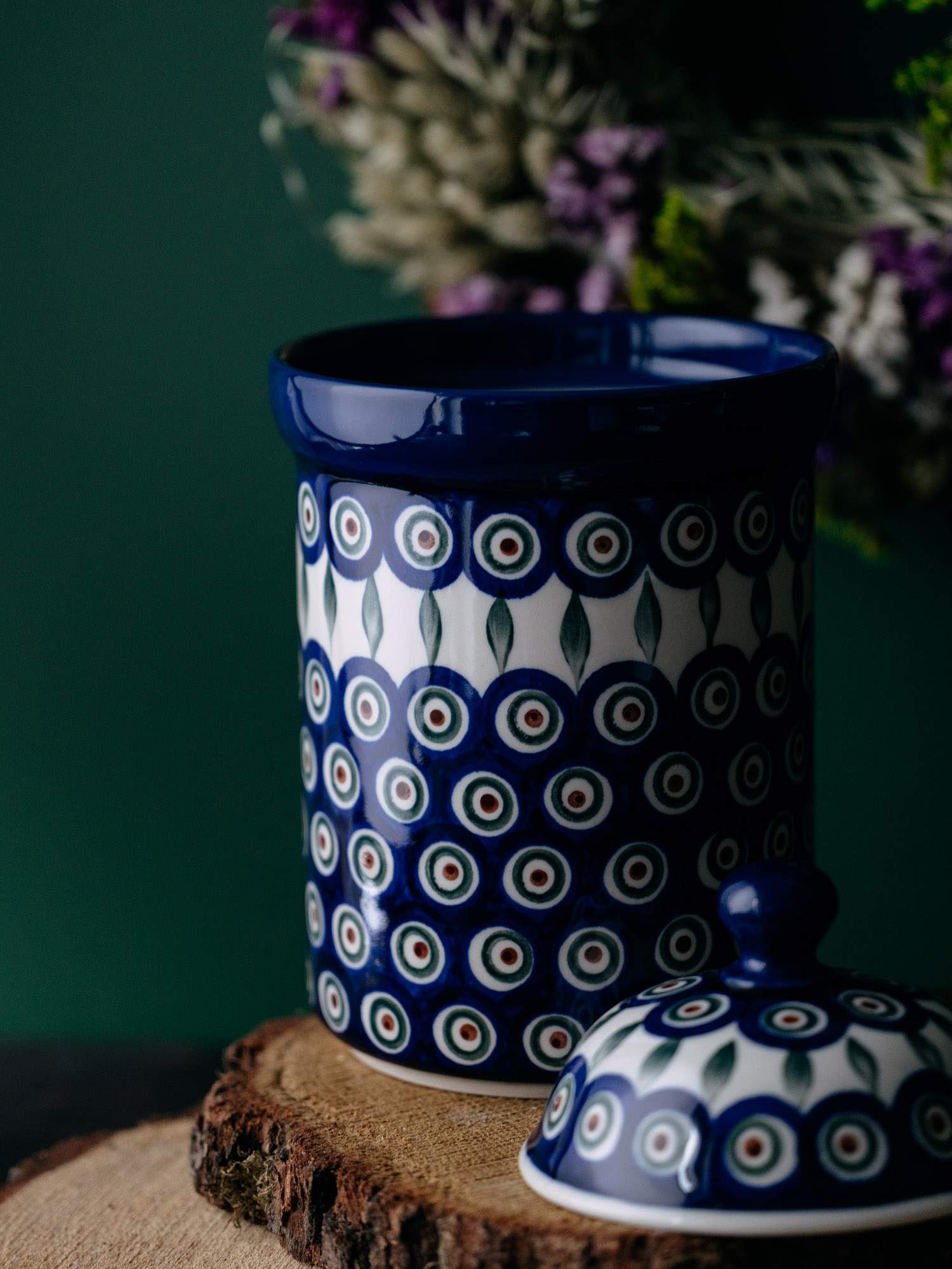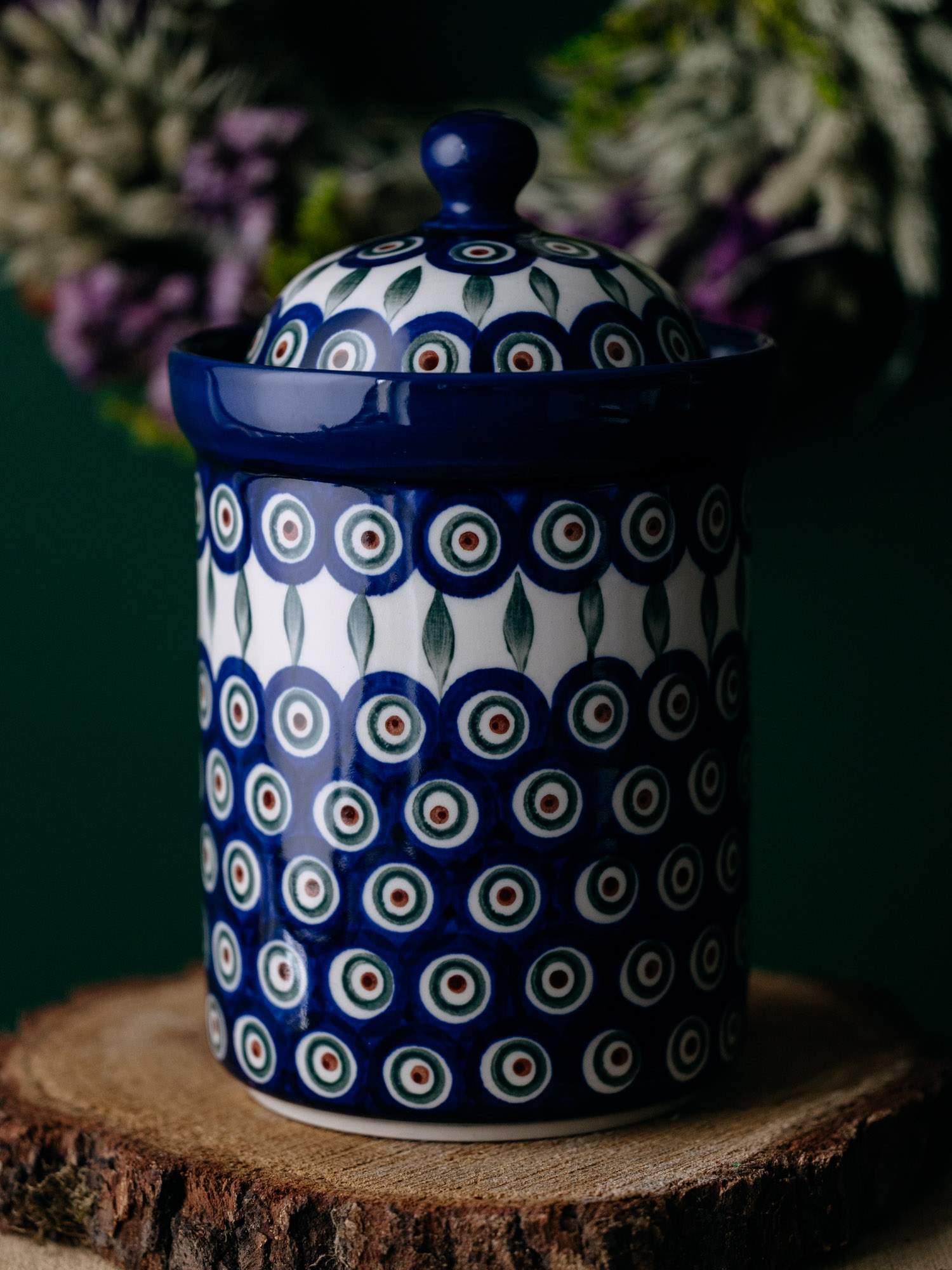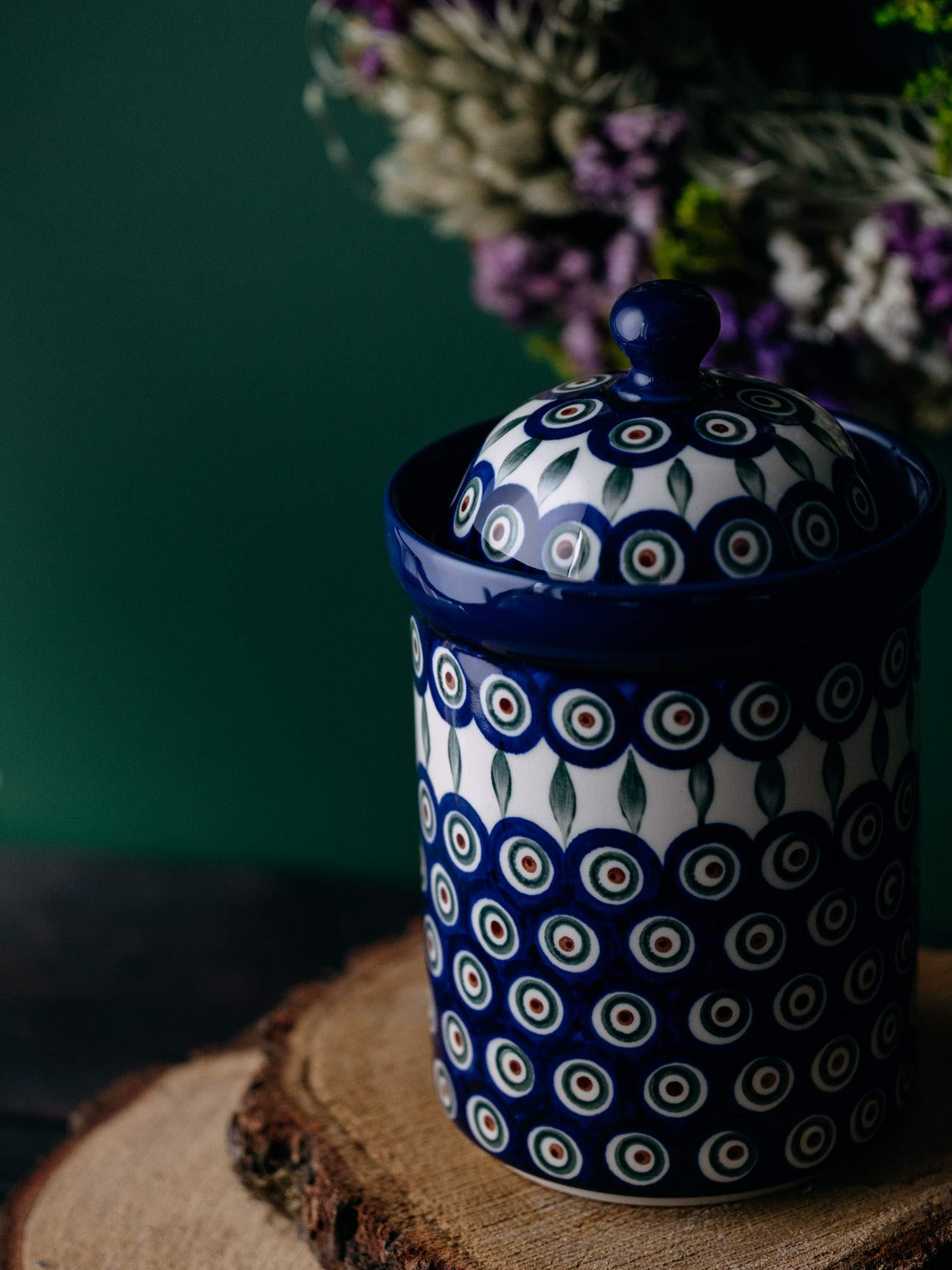 Klasyczny, okrągły pojemnik w zestawie z przykrywką. Jasna ceramika została ozdobiona ręcznie, kobaltowo-zielonym wzorem pawiego oczka z listkiem. Wysokiej jakości ceramika sprawia, że jest idealny do przechowywania kawy, herbaty lub cukru. Pojemnik został wykonany w „Ceramice Artystycznej” w Bolesławcu.