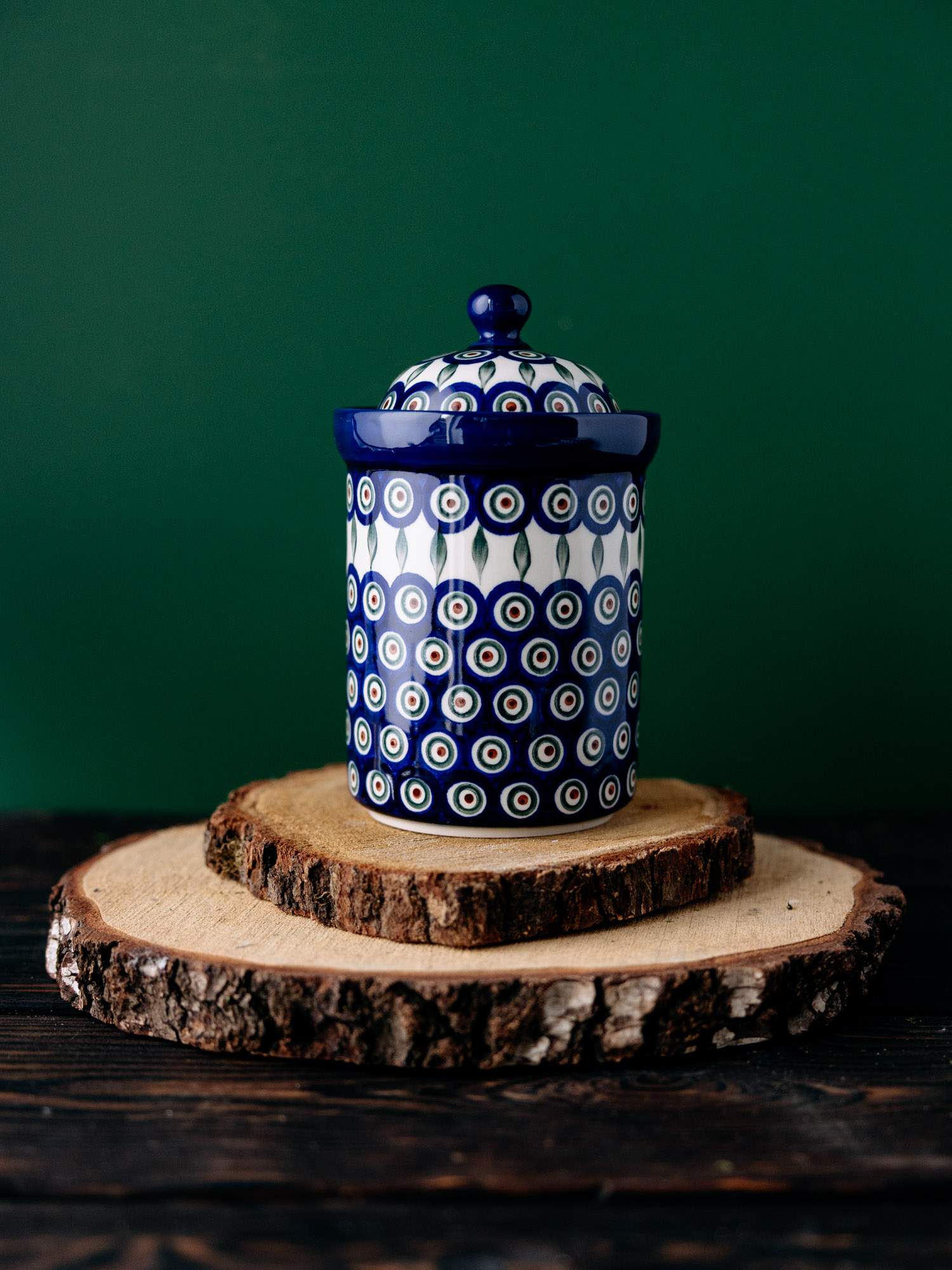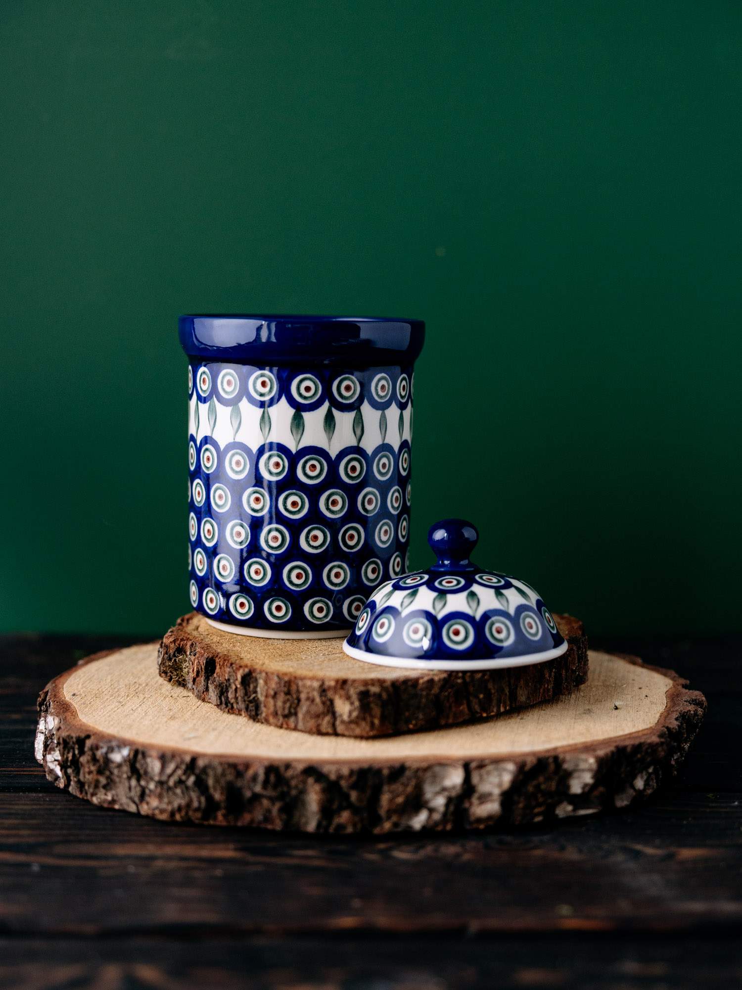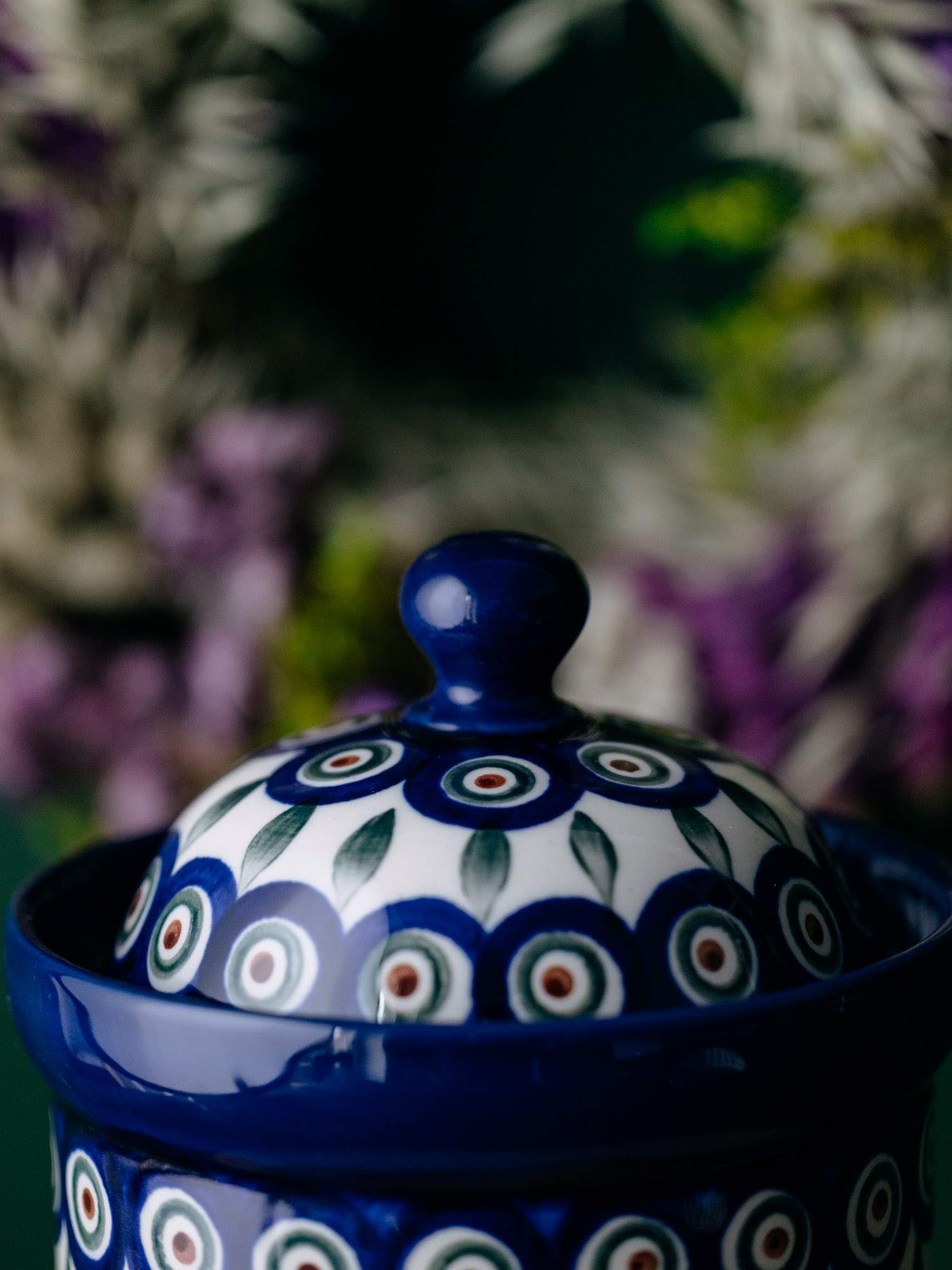 Klasyczny, okrągły pojemnik w zestawie z przykrywką. Jasna ceramika została ozdobiona ręcznie, kobaltowo-zielonym wzorem pawiego oczka z listkiem. Wysokiej jakości ceramika sprawia, że jest idealny do przechowywania kawy, herbaty lub cukru. Pojemnik został wykonany w „Ceramice Artystycznej” w Bolesławcu.