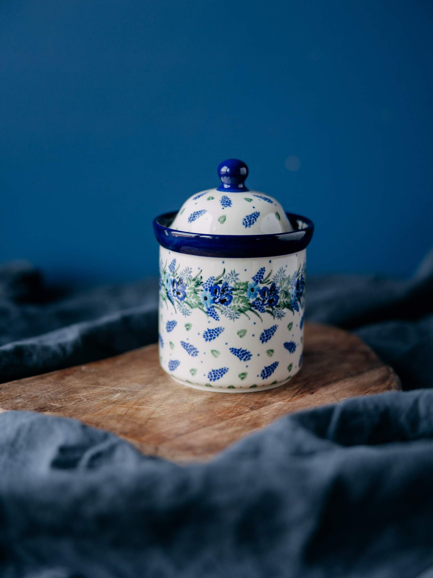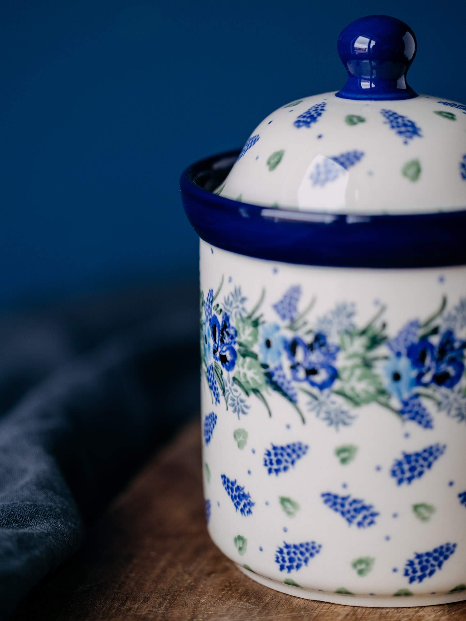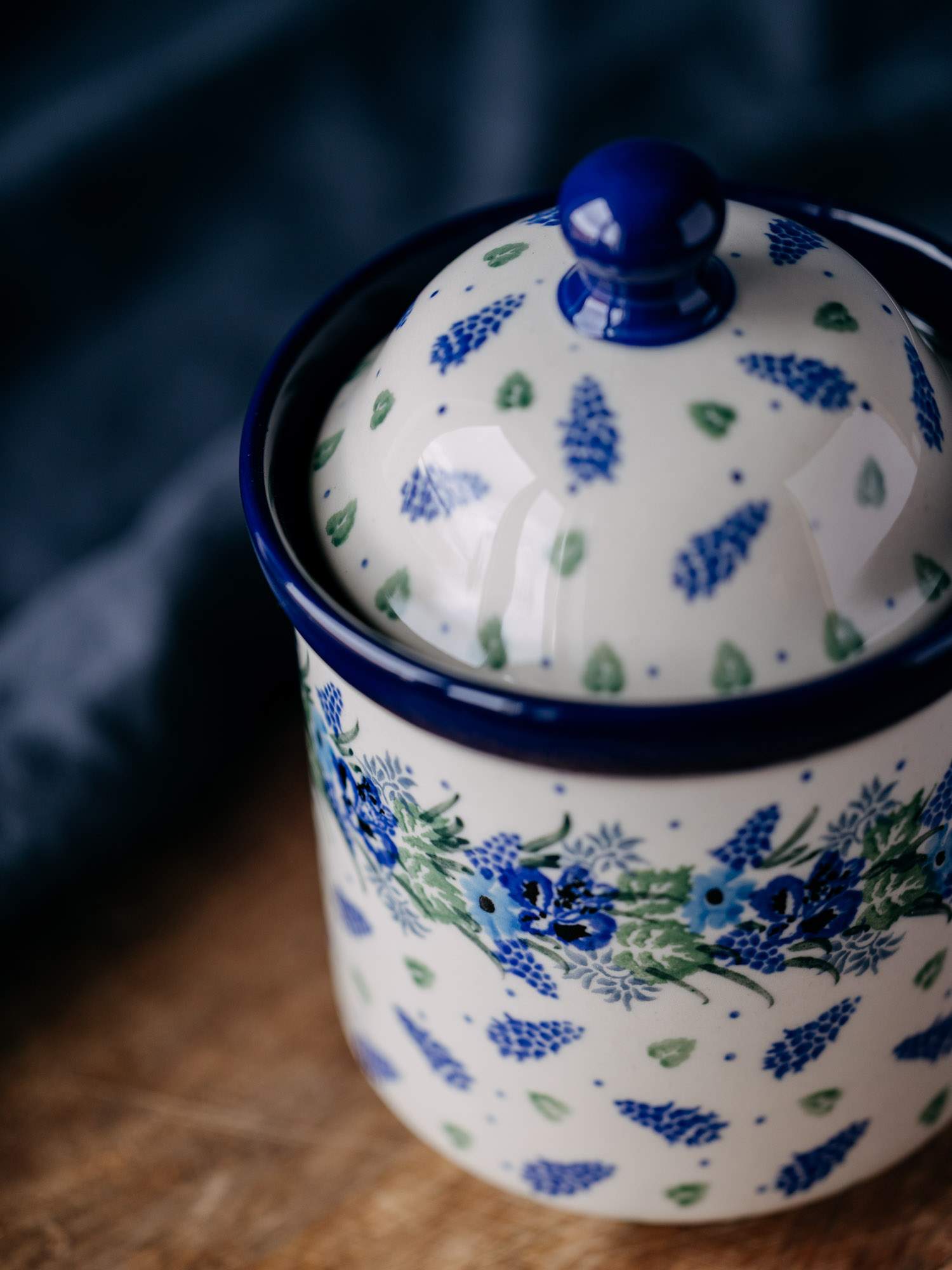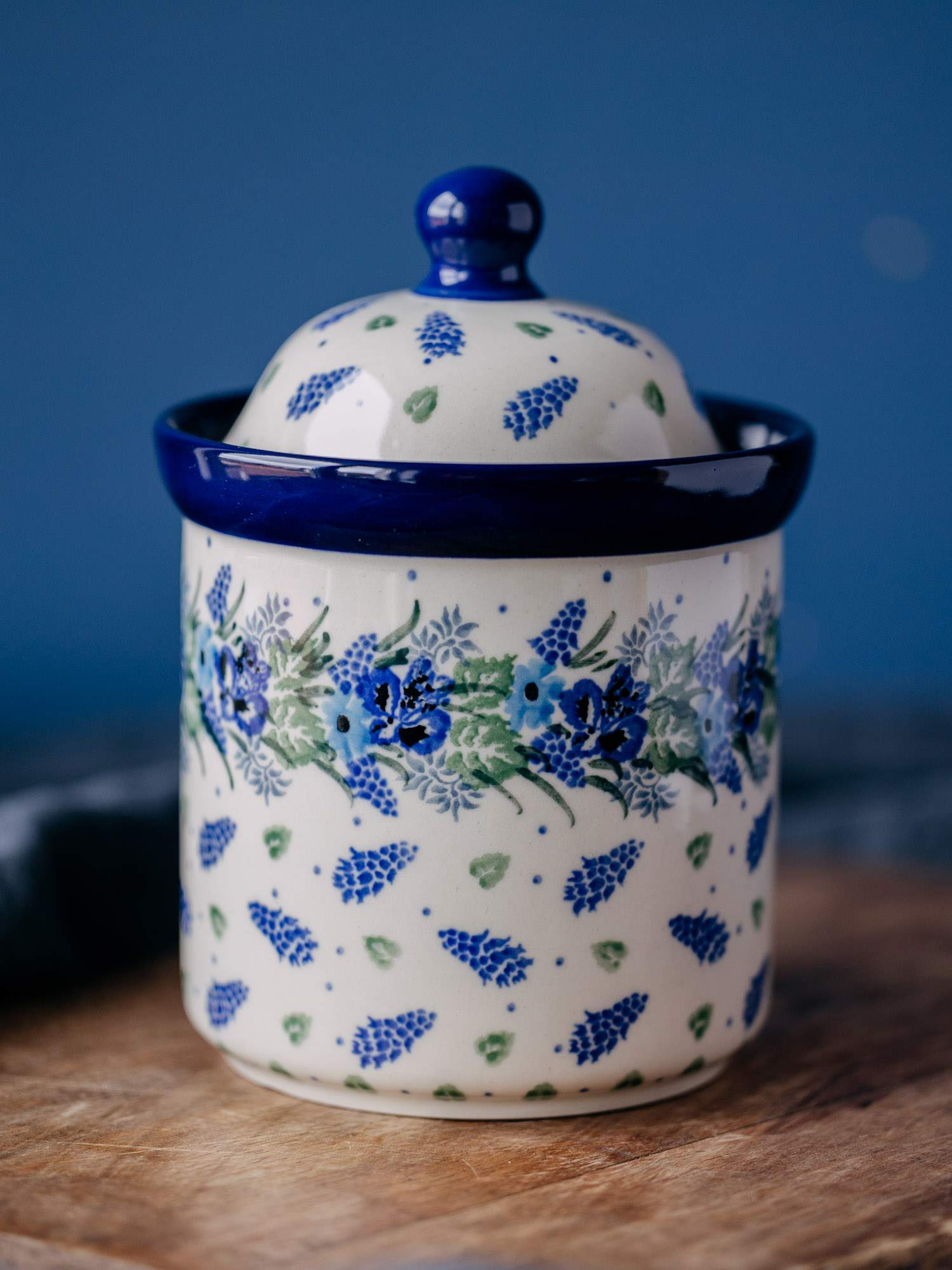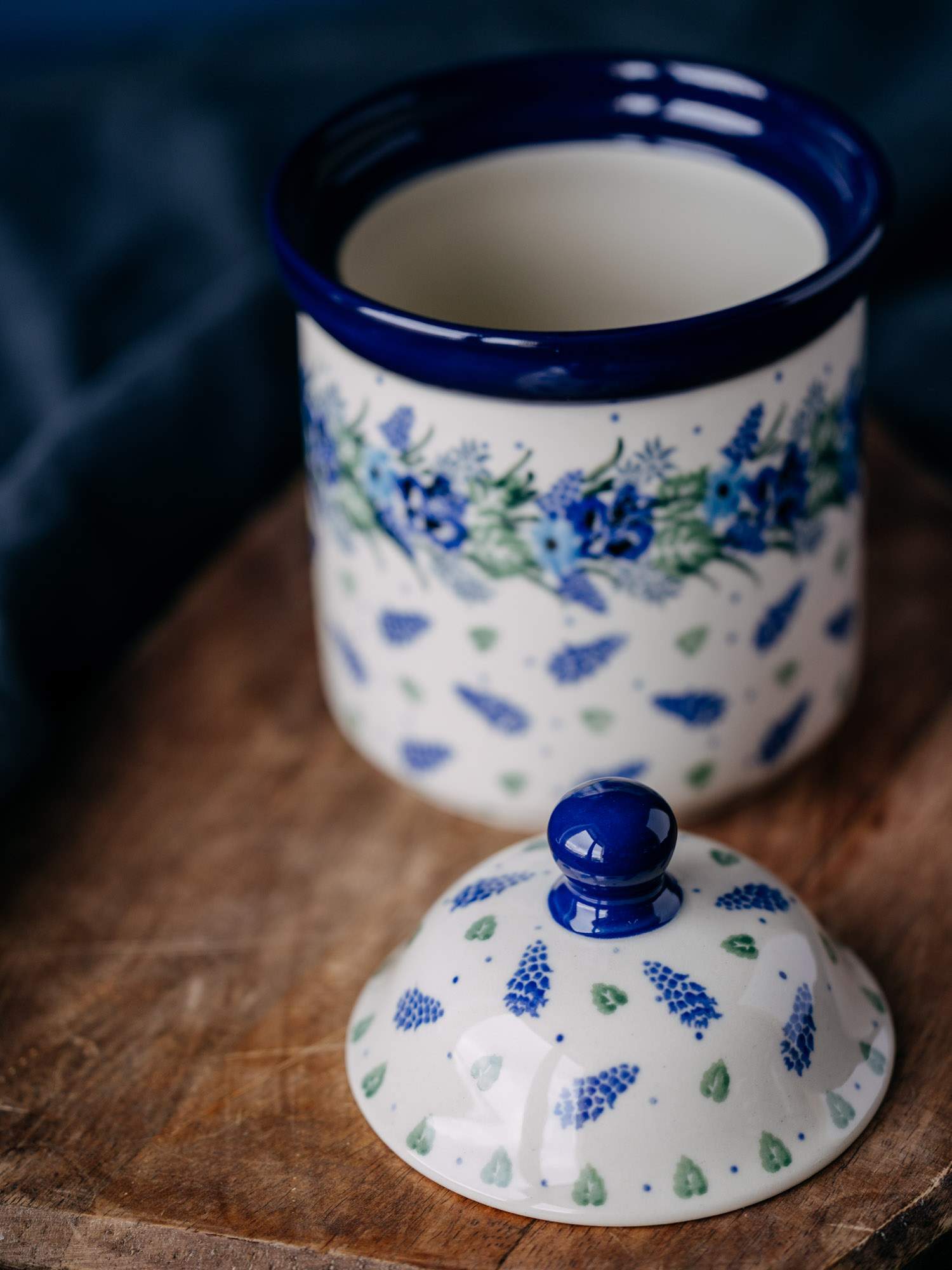 Klasyczny, okrągły pojemnik w zestawie z przykrywką. Jasna ceramika została ozdobiona ręcznie, kobaltowo-zielonym wzorem wianka. Wysokiej jakości ceramika sprawia, że jest idealny do przechowywania kawy, herbaty lub cukru. Pojemnik został wykonany w „Ceramice Artystycznej” w Bolesławcu.