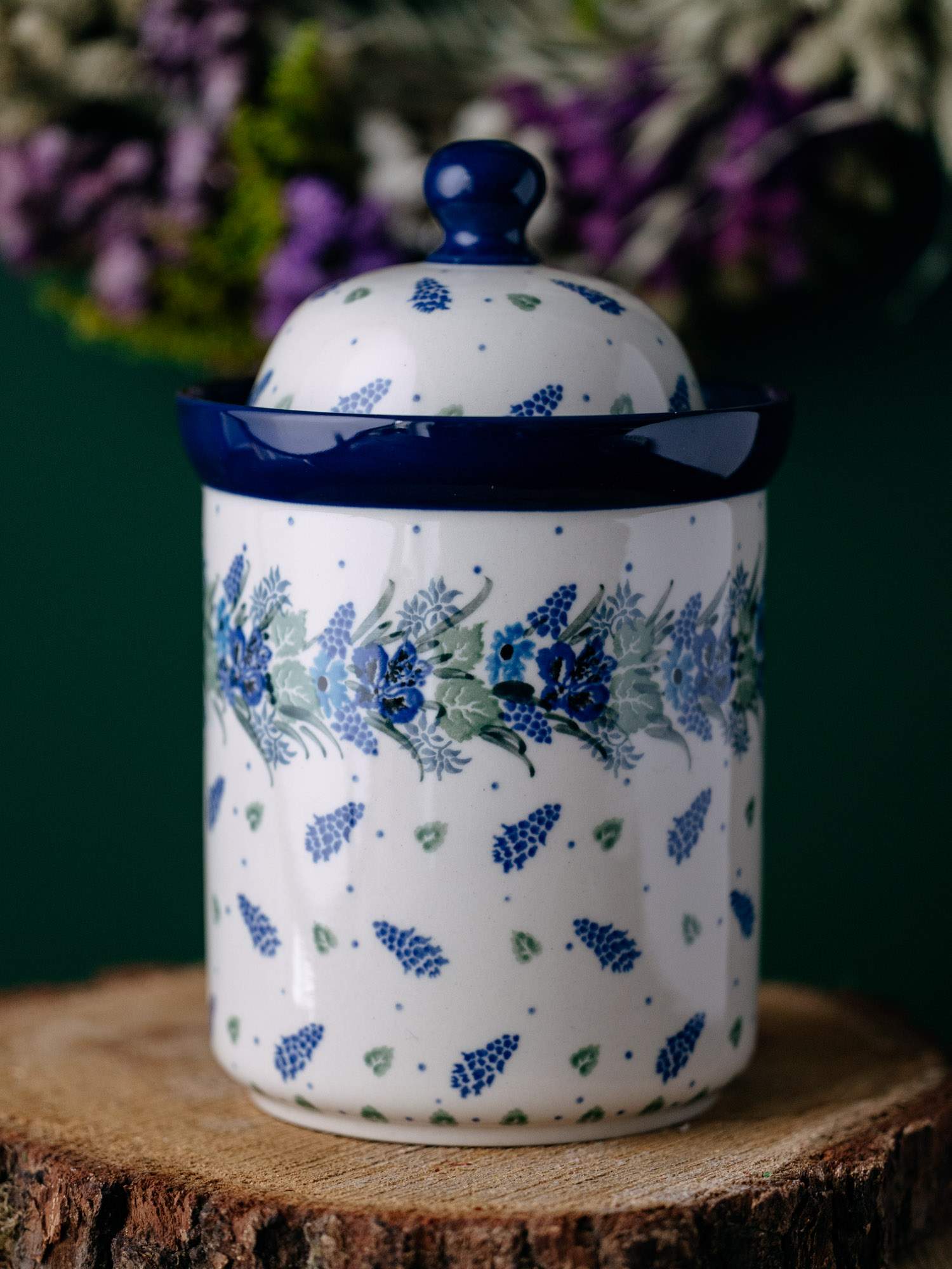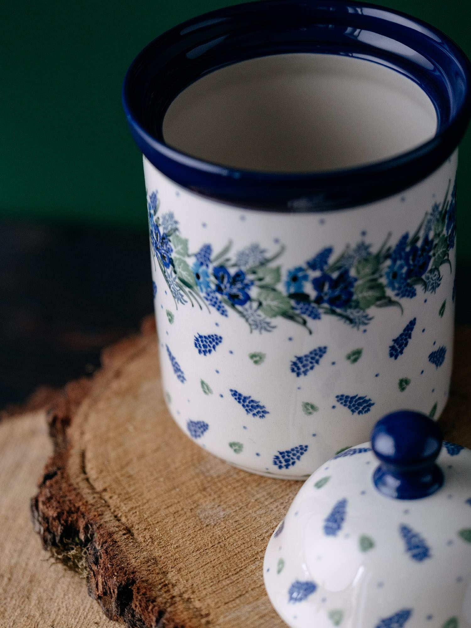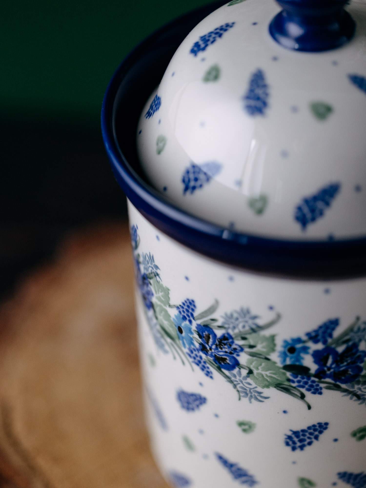 Klasyczny, okrągły pojemnik w zestawie z przykrywką. Jasna ceramika została ozdobiona ręcznie, kobaltowo-zielonym wzorem wianka. Wysokiej jakości ceramika sprawia, że jest idealny do przechowywania kawy, herbaty lub cukru. Pojemnik został wykonany w „Ceramice Artystycznej” w Bolesławcu.