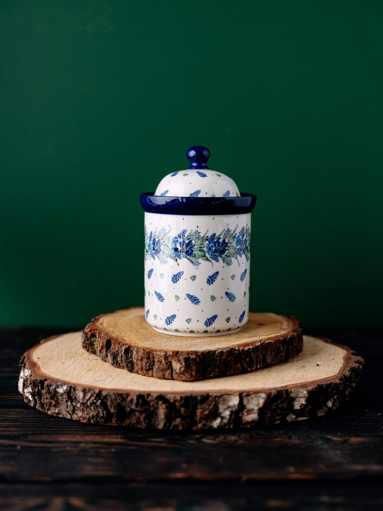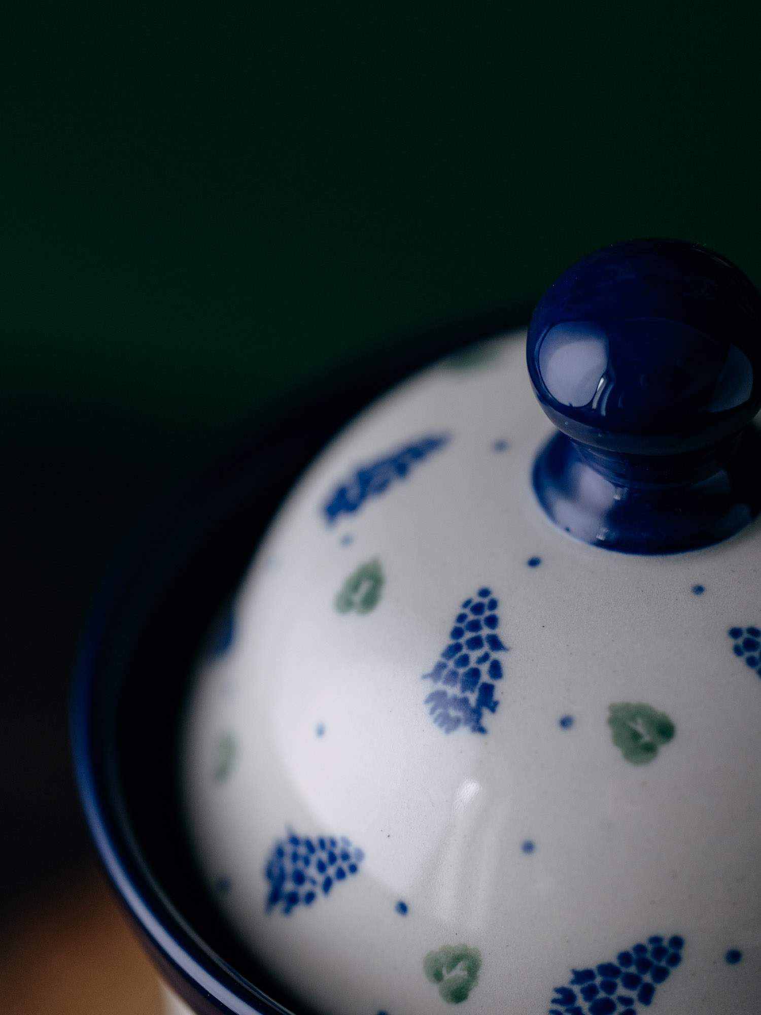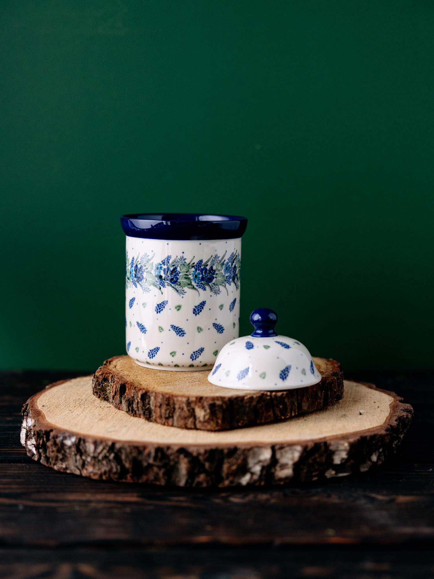 Klasyczny, okrągły pojemnik w zestawie z przykrywką. Jasna ceramika została ozdobiona ręcznie, kobaltowo-zielonym wzorem wianka. Wysokiej jakości ceramika sprawia, że jest idealny do przechowywania kawy, herbaty lub cukru. Pojemnik został wykonany w „Ceramice Artystycznej” w Bolesławcu.