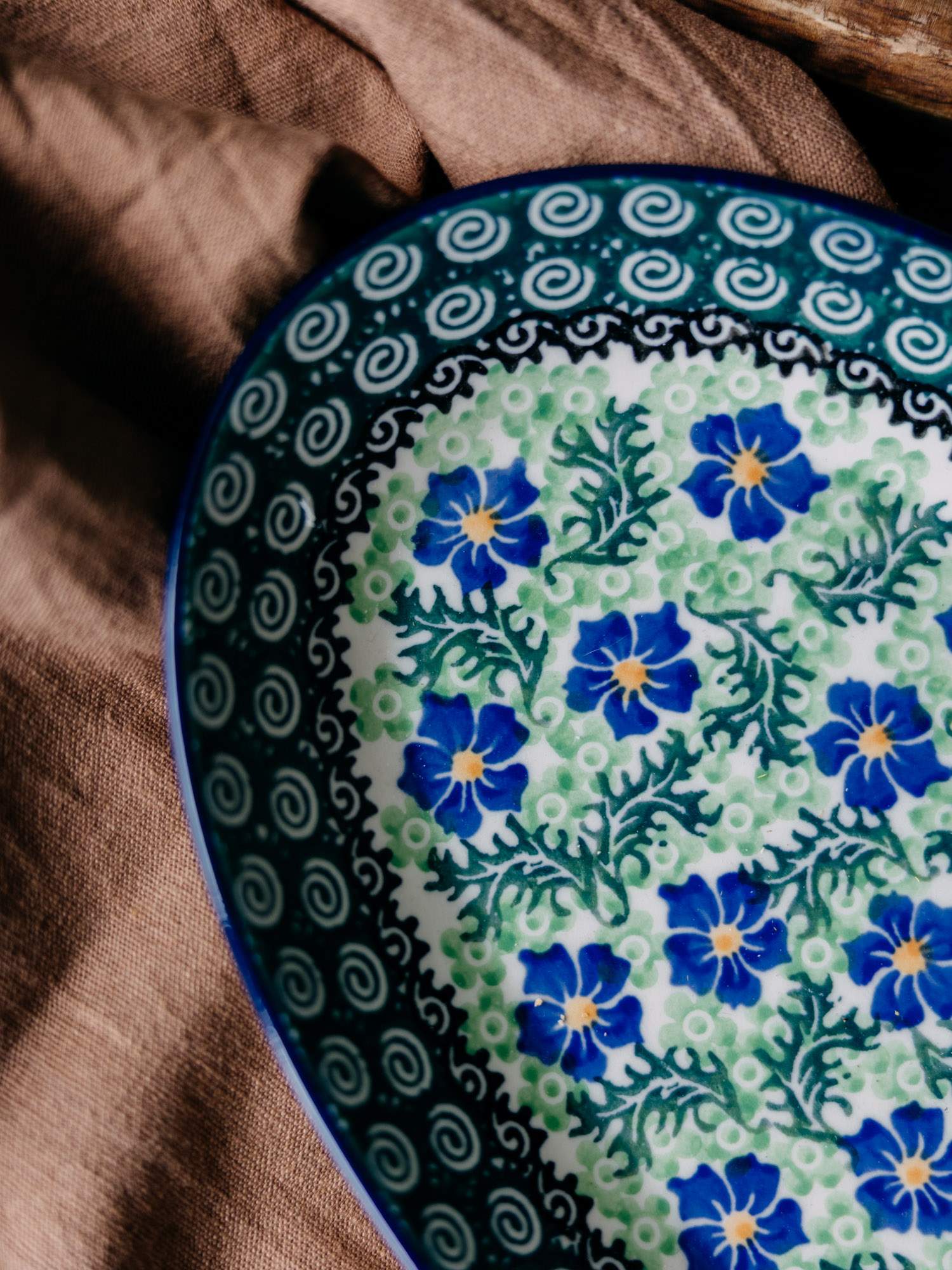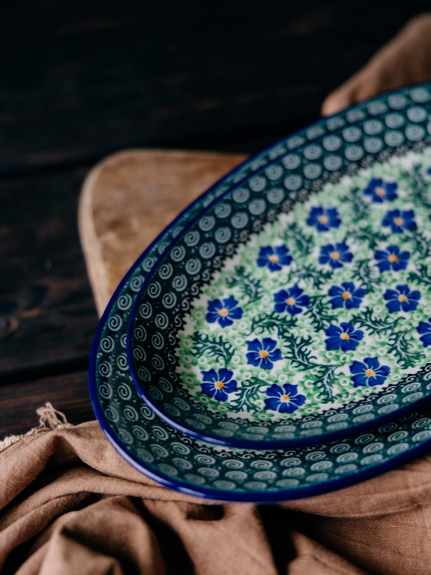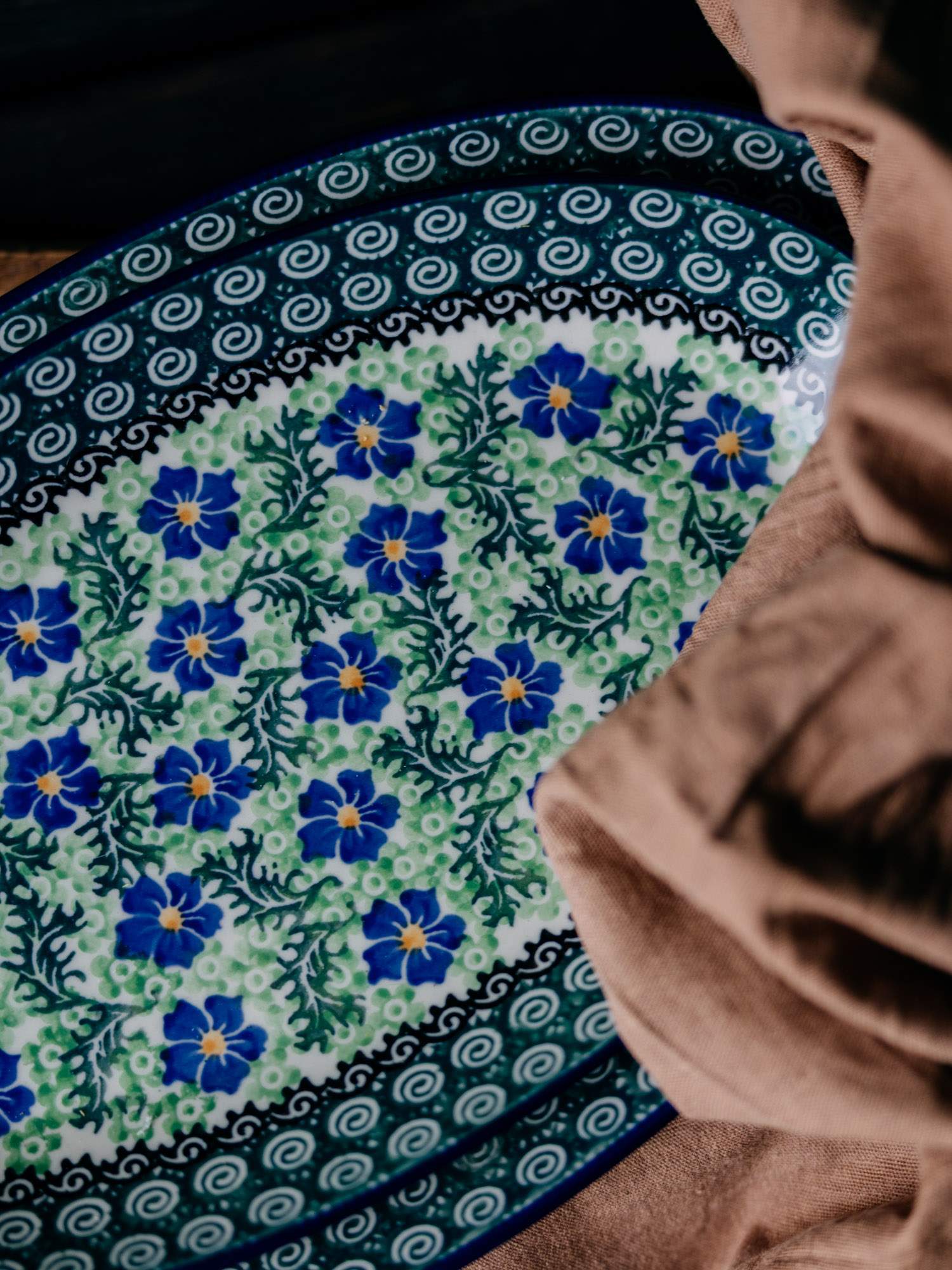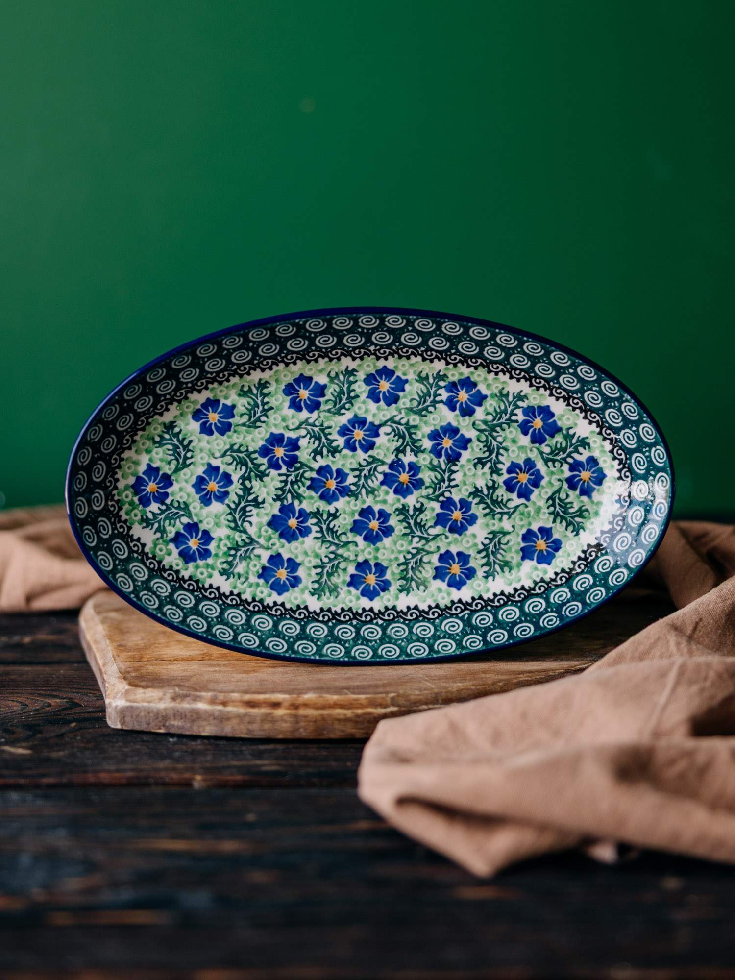 Średni półmisek o owalnym kształcie. Jasna ceramika została ozdobiona ręcznie, kobaltowo-zielonym wzorem chabrów. Naczynie posiada nieco wyższe oraz delikatnie wywinięte brzegi, które ułatwią podawanie potraw. Półmisek został wykonany w „Ceramice Artystycznej” w Bolesławcu.