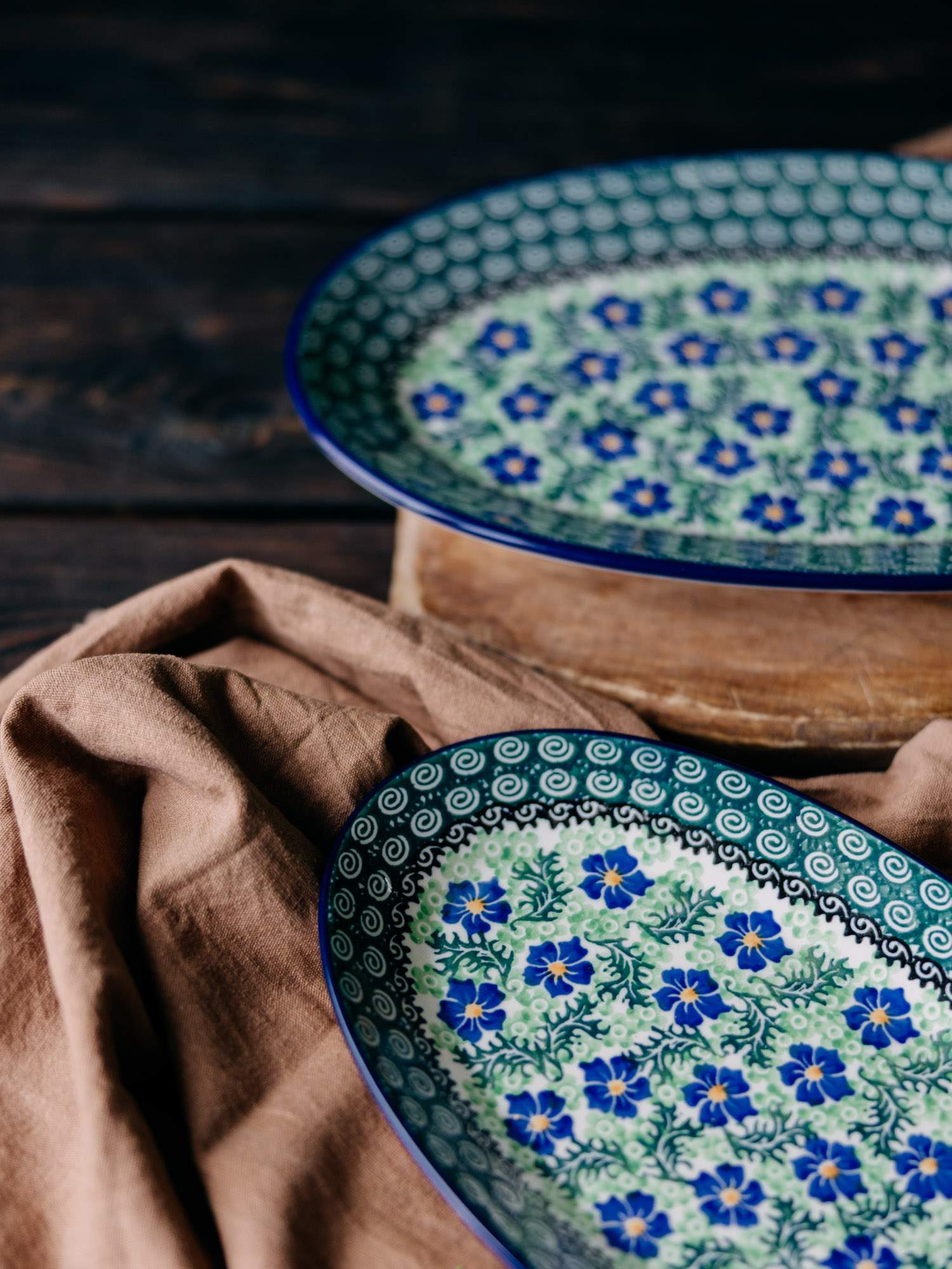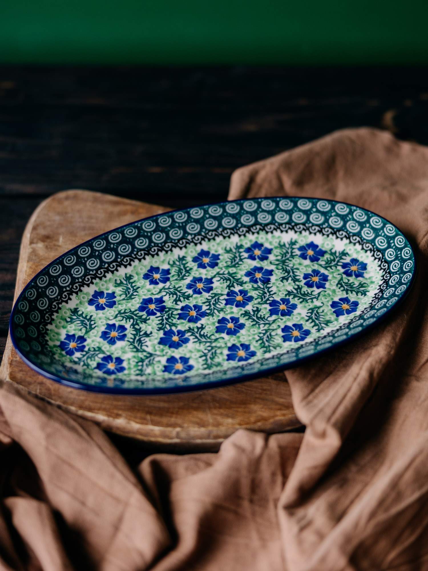 Średni półmisek o owalnym kształcie, ozdobiony kwiatowym, kobaltowo-zielonym wzorem chabrów.