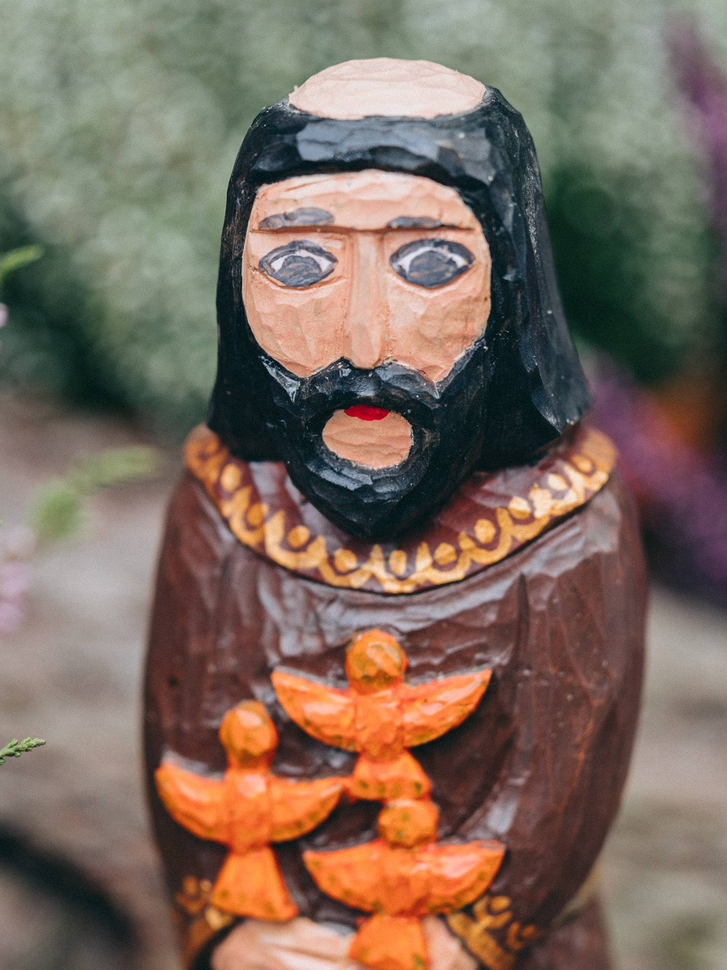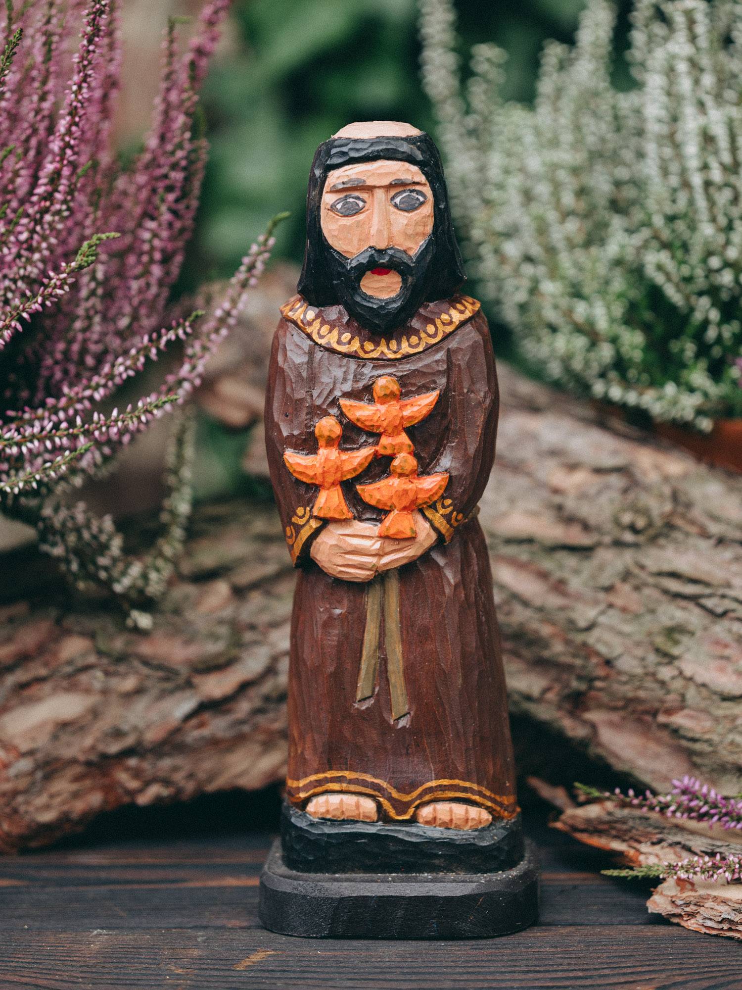 Wykonana ręcznie drewniana rzeźba sakralna przedstawiająca Świętego Franciszka z pomarańczowymi ptakami, które symbolizują umiłowanie do natury. Postać ubrana w brązowy habit zdobiony złotymi elementami oraz z przepasanym sznurem wokół talii. Przedstawiony z ciemną brodą oraz w intensywnych kolorach.