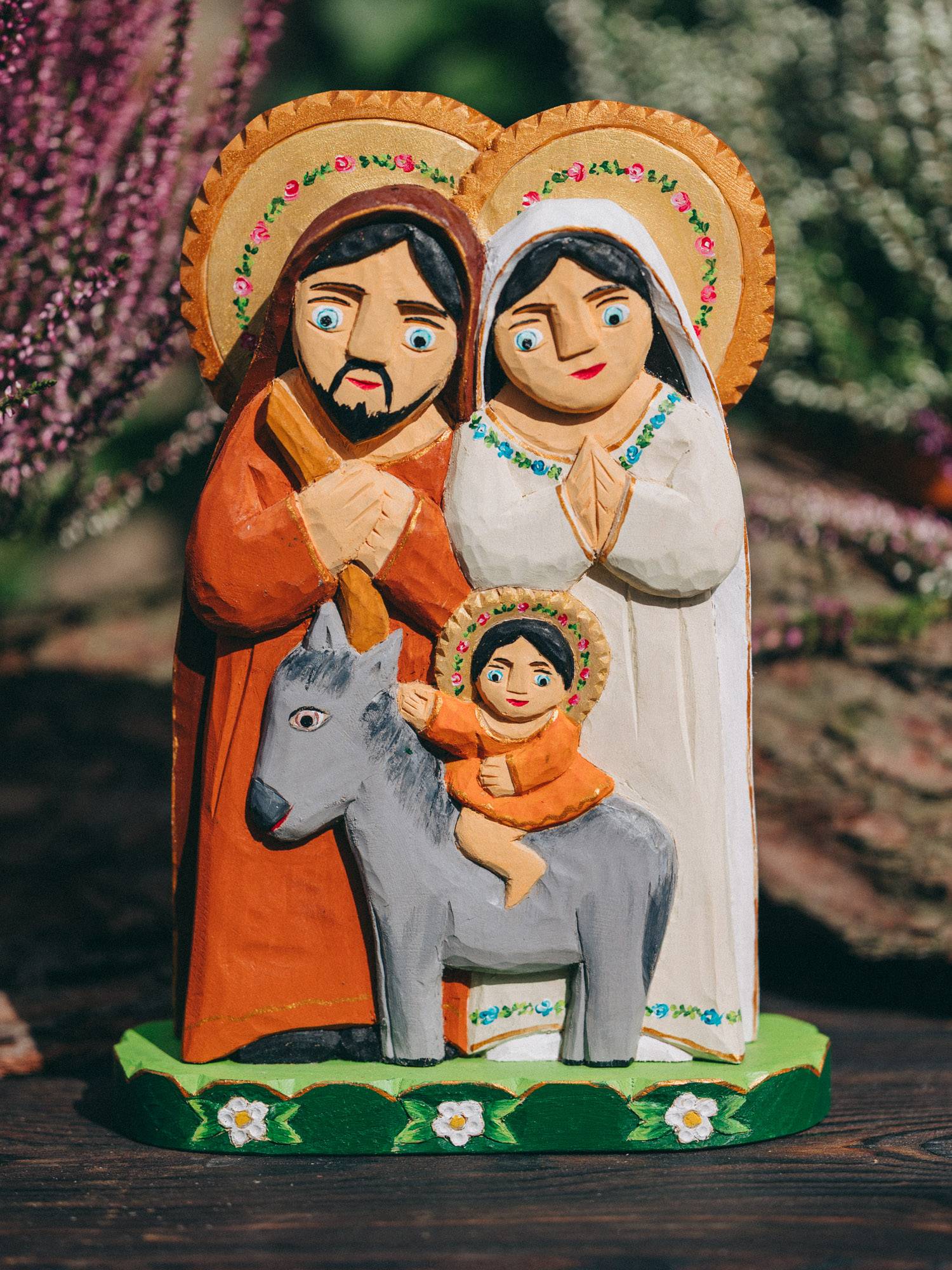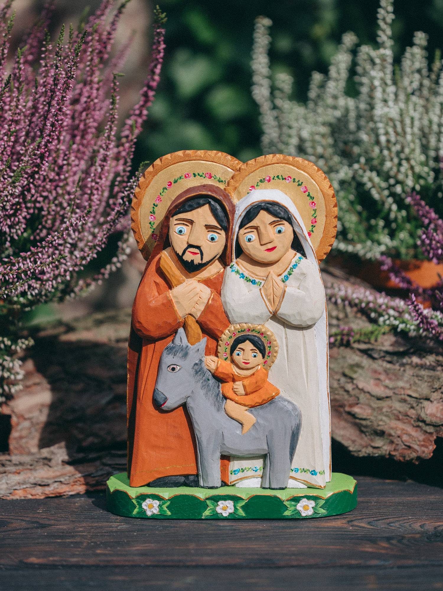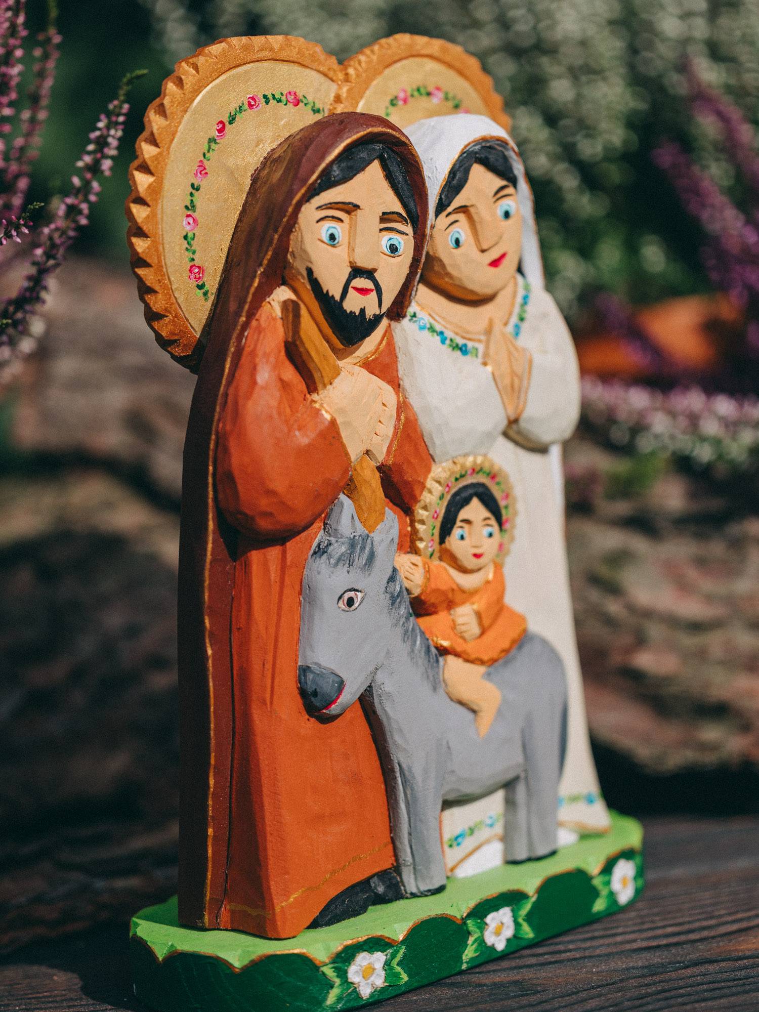 Wykonana ręcznie rzeźba przedstawiająca obraz Świętej Rodziny - ,,Ucieczka do Egiptu". Postać Maryi ukazano w białej szacie, zdobionej niebieskimi kwiatkami ze złożonymi dłońmi. Obok Józef w brązowej szacie, który trzyma w dłoniach laskę. Na szarym osiołku uwieczniono dzieciątko Jezusa w pomarańczowej szacie. Nad głowami Świętych znajdują się aureole zdobione delikatnym wzorem kwiatków.