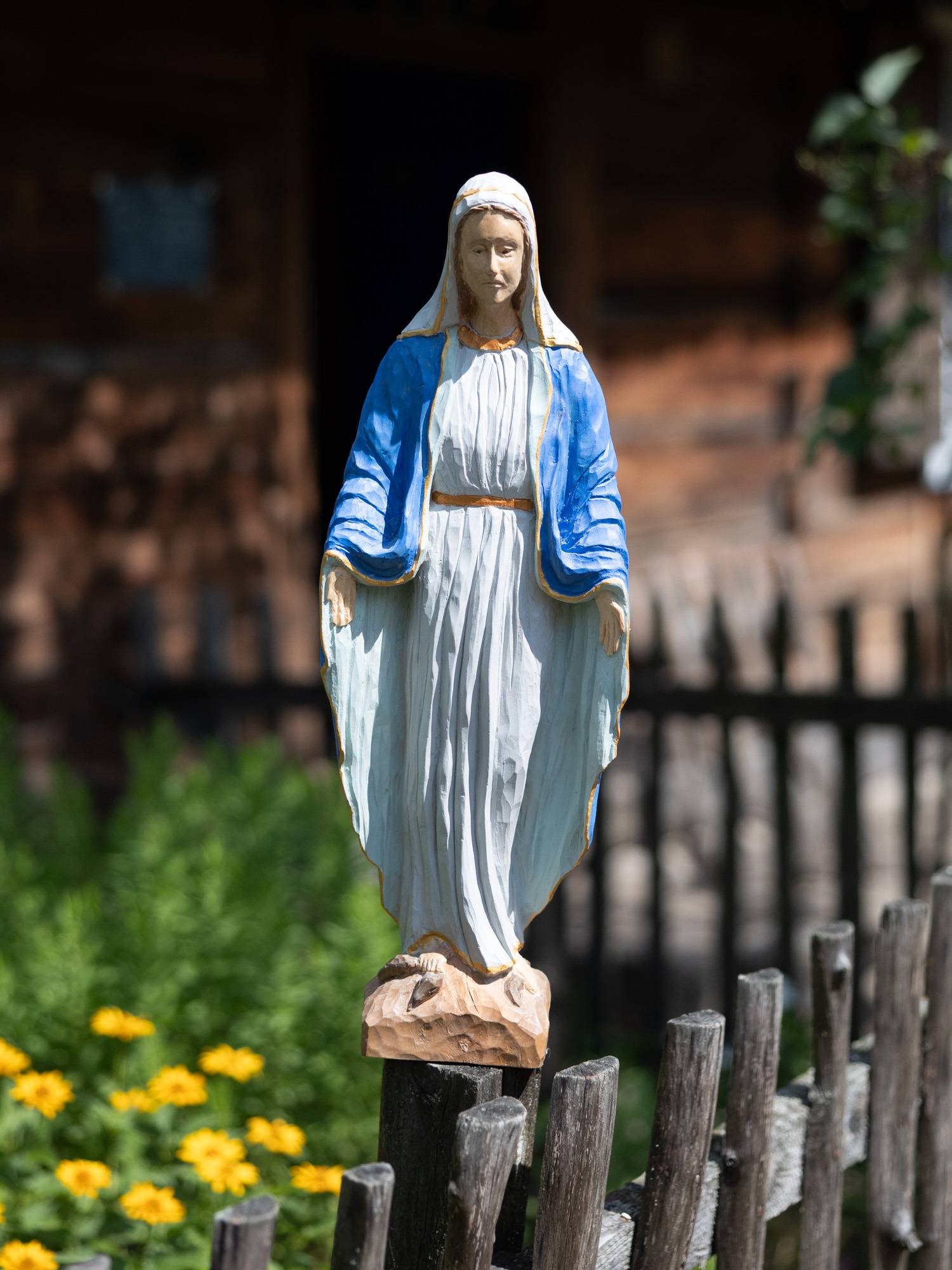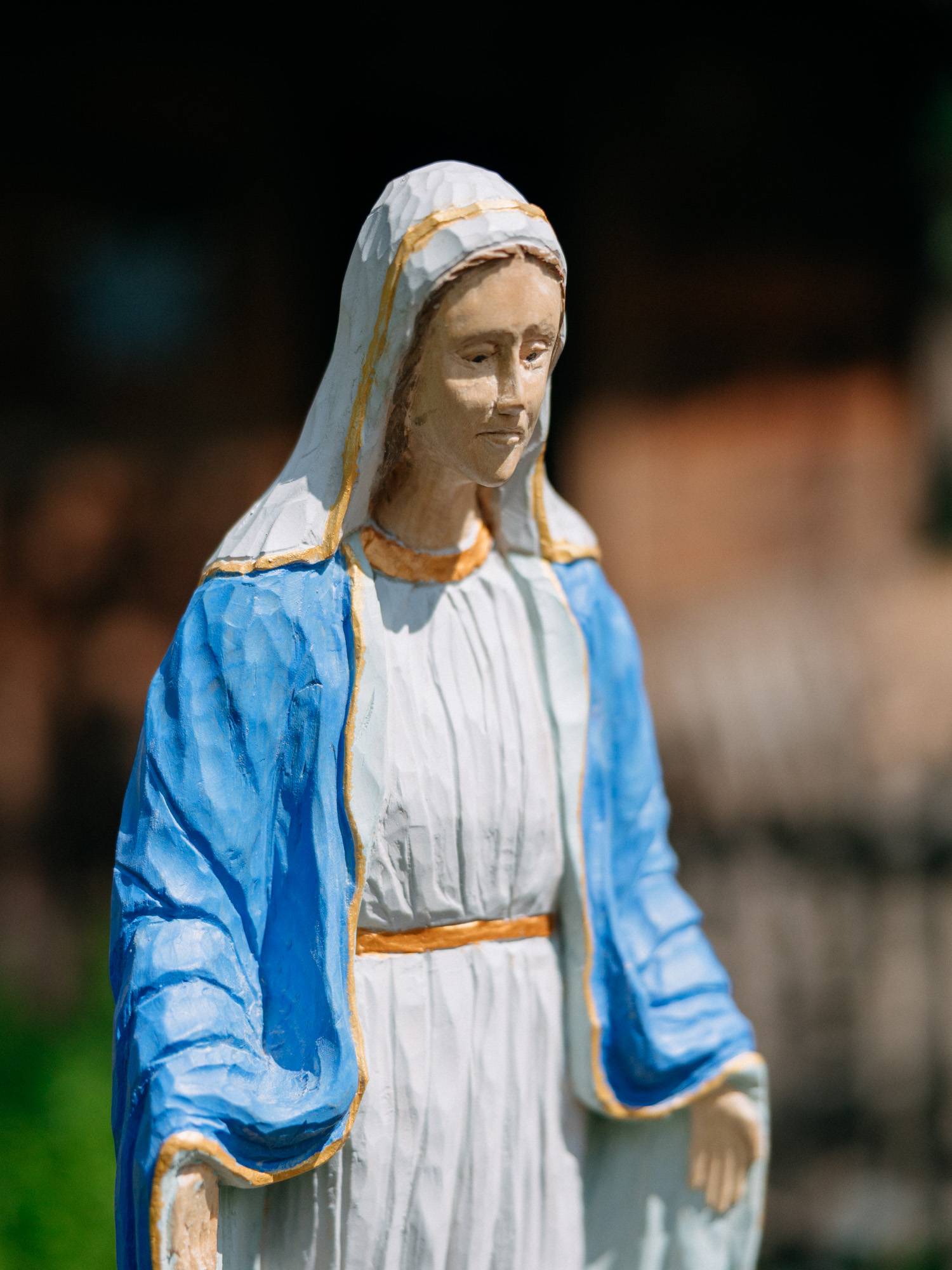 Rzeźbiona Maryja w ciemnoniebieskiej szacie