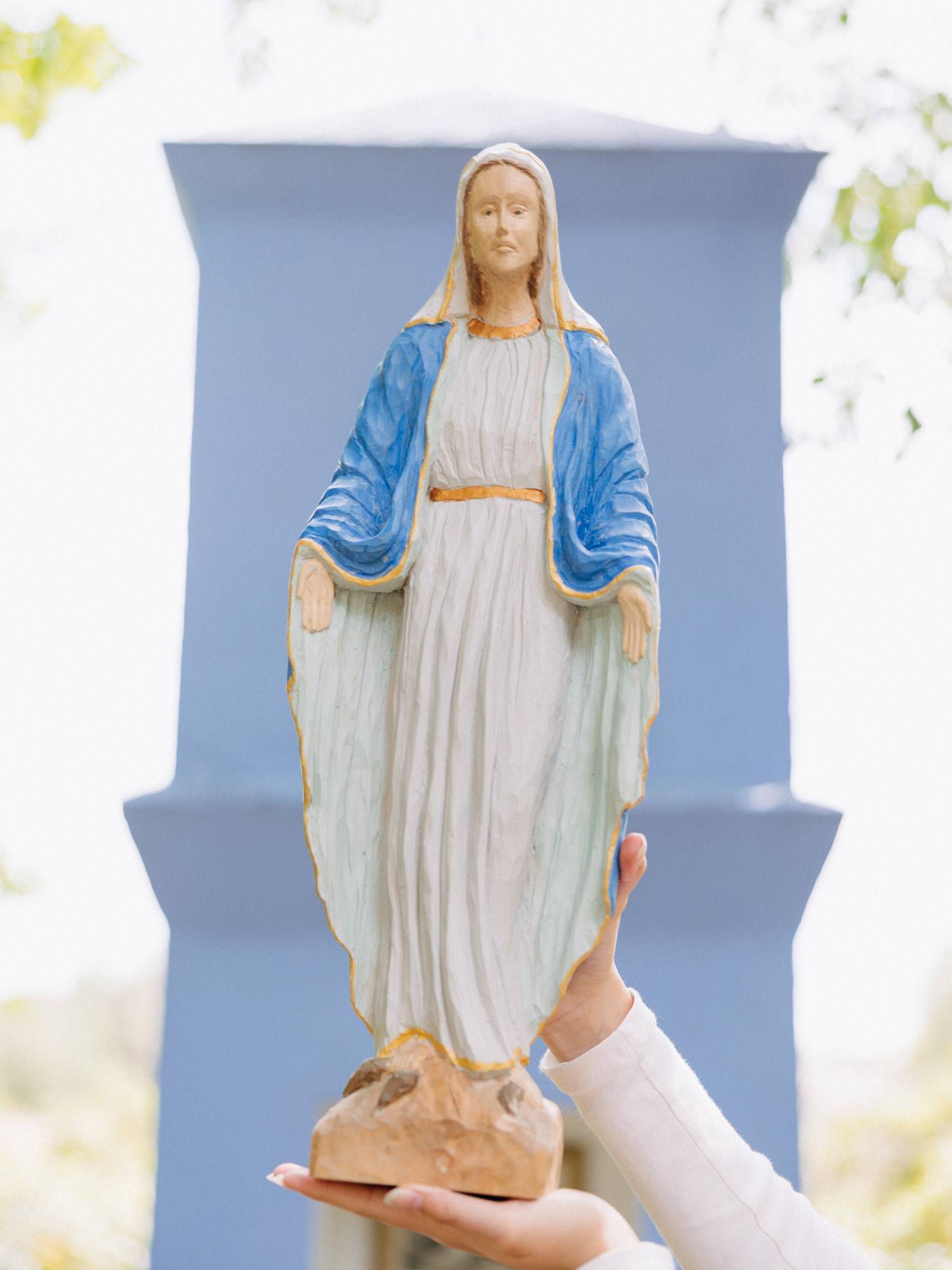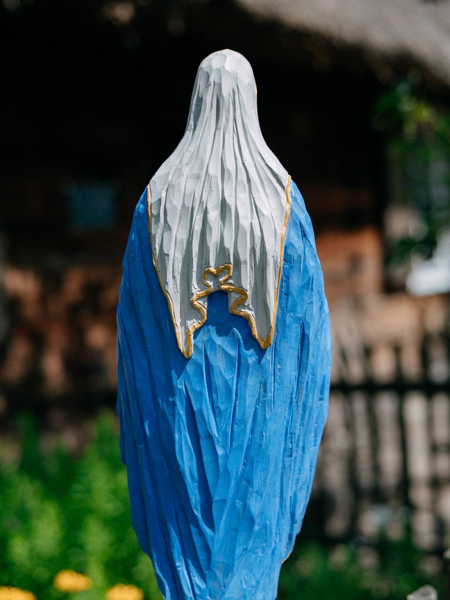 Ręcznie wykonana rzeźba sakralna przedstawiająca wizerunek Matki Bożej. Postać została uwieczniona w ciemnoniebieskiej szacie, ze złotymi detalami. Na głowie ma białą chustę.