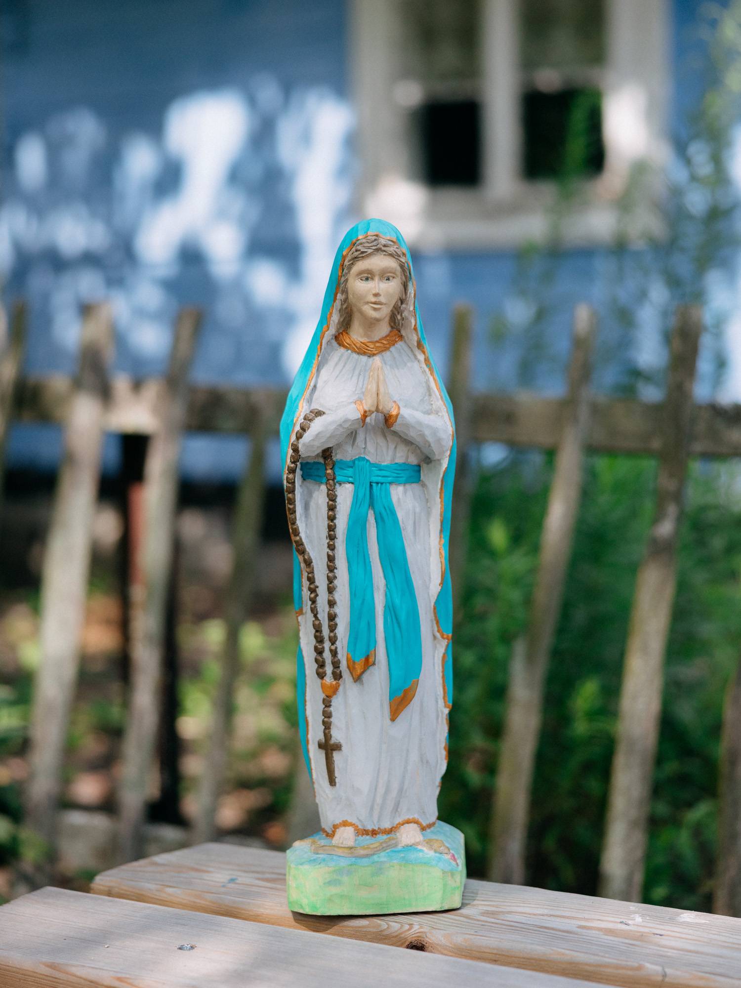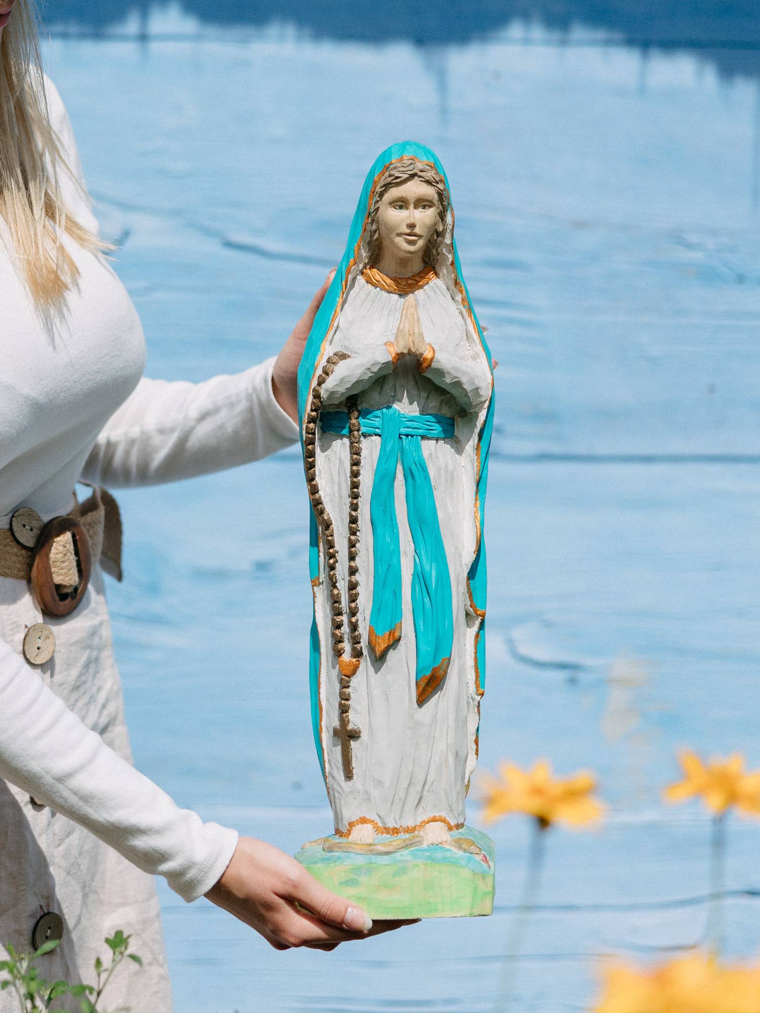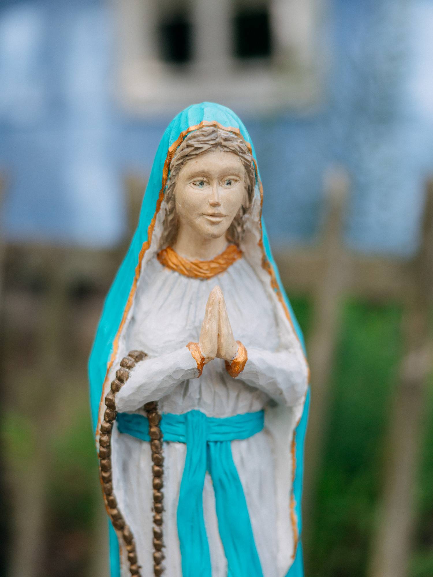 Rzeźbiona Maryja w turkusowej szacie z różańcem