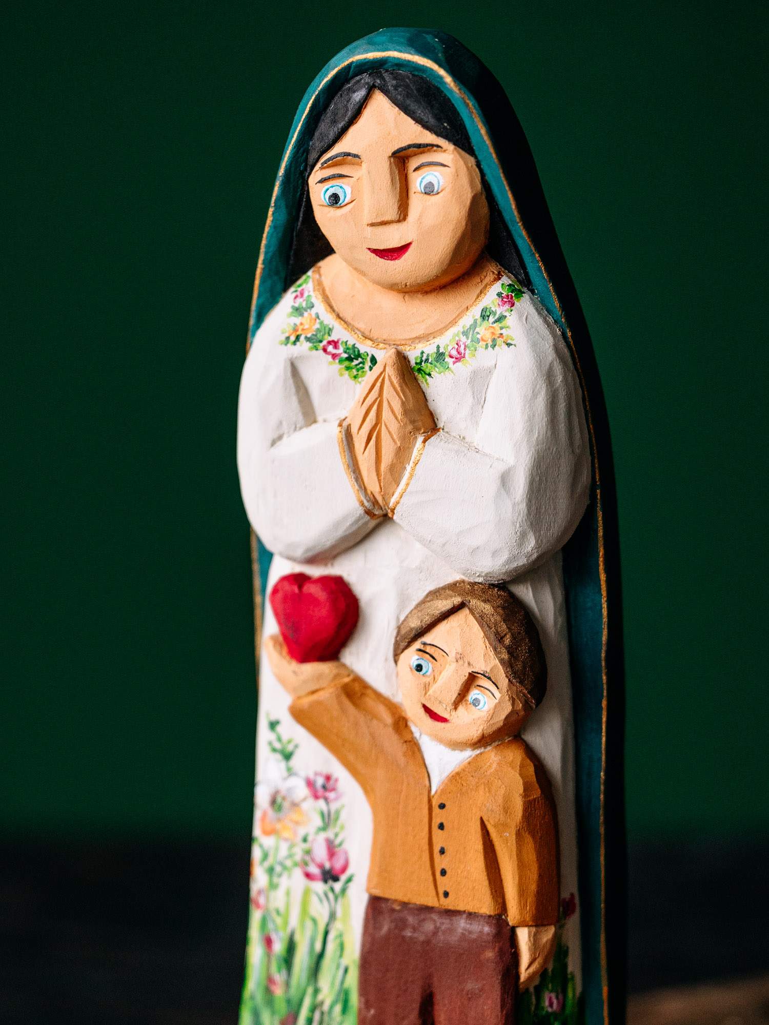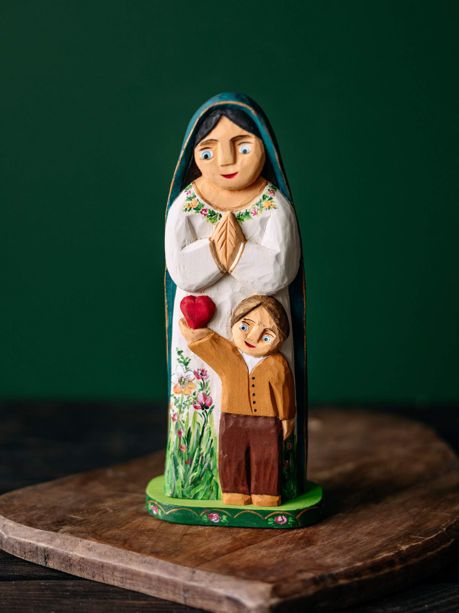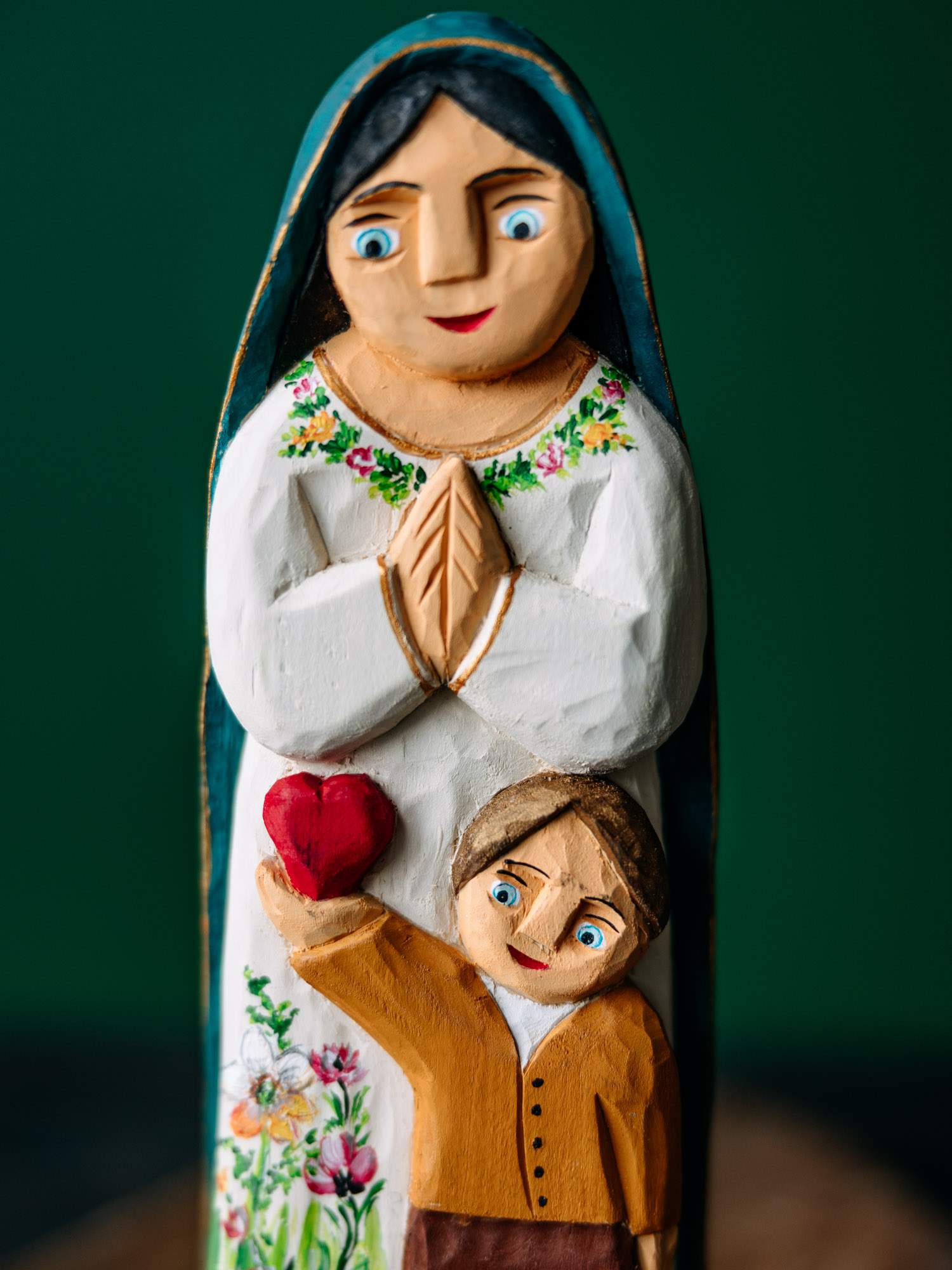 Ręcznie wykonana rzeźba przedstawiająca Matkę Boską i chłopca trzymającego na dłoni serce.