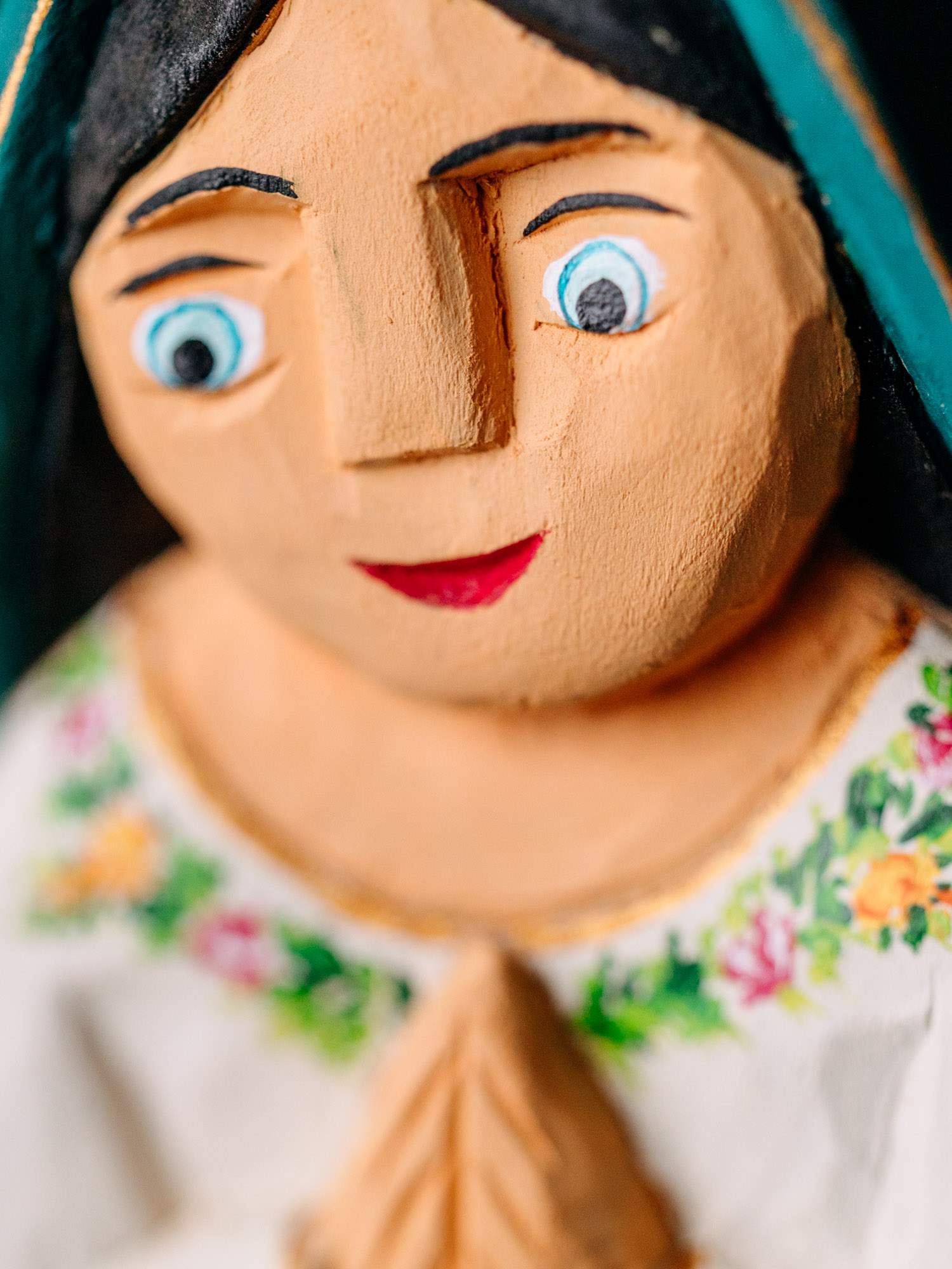 Rzeźba sakralna wykonana ręcznie przedstawiająca Matkę Boską w białej szacie, zdobioną delikatnaymi, kwiatowymi detalami. Na głowie ma chustę w kolorze trukusowym, zdobioną złotym wykończeniem. Przed postacią stoi mały chłopiec, który w dłoni trzyma czerwone serce. Całość została wykonana przez rzeźbiarkę z okolic Łowicza.