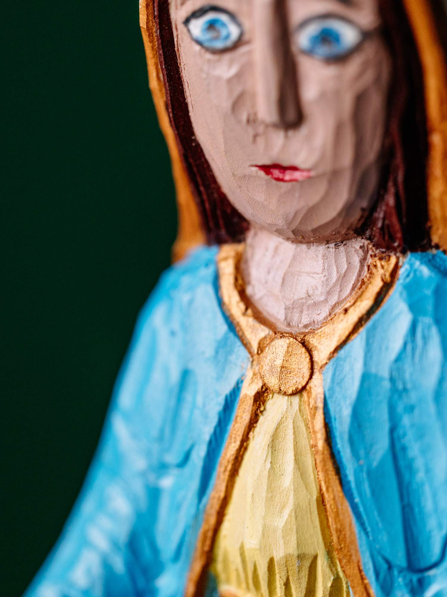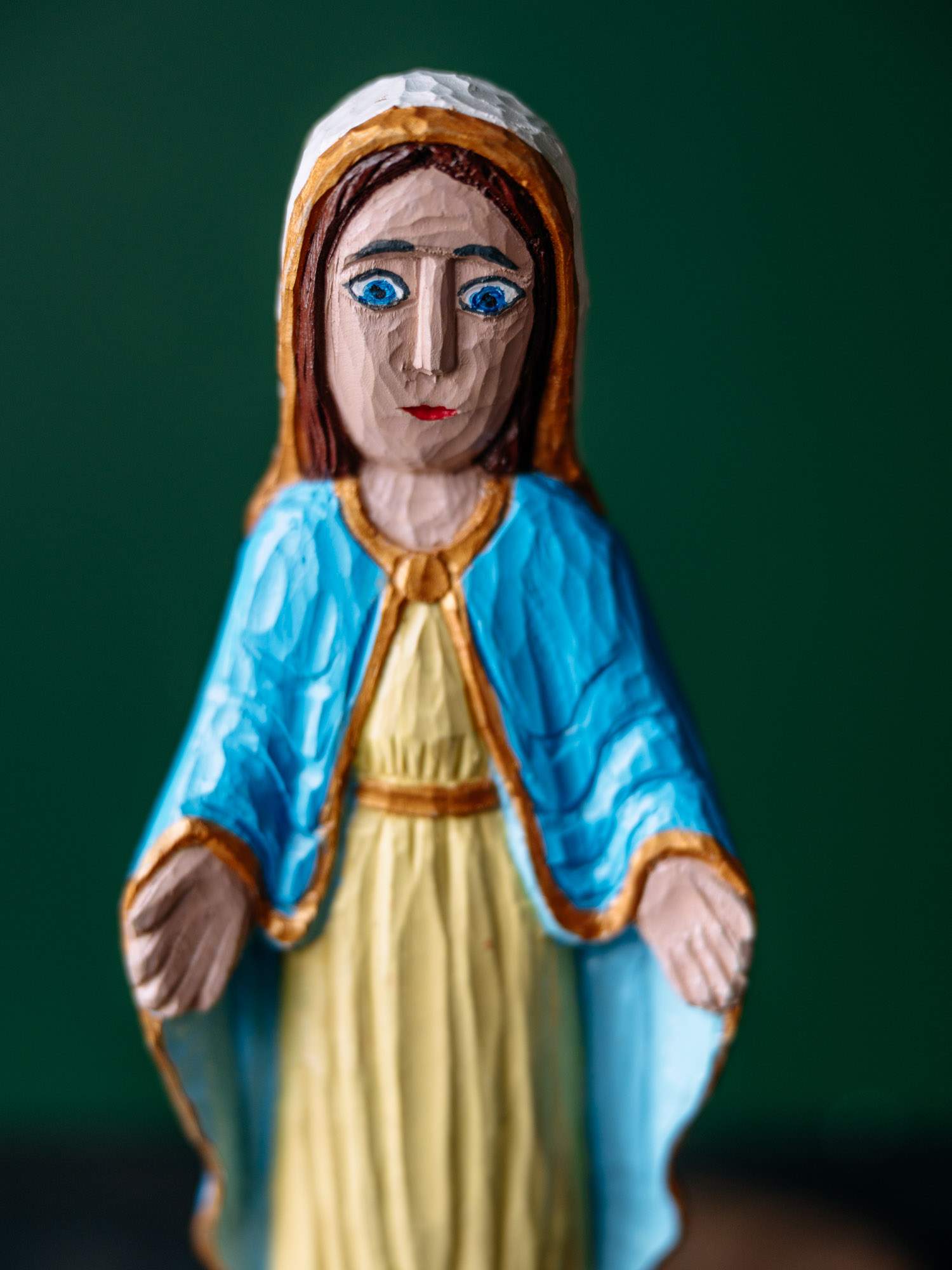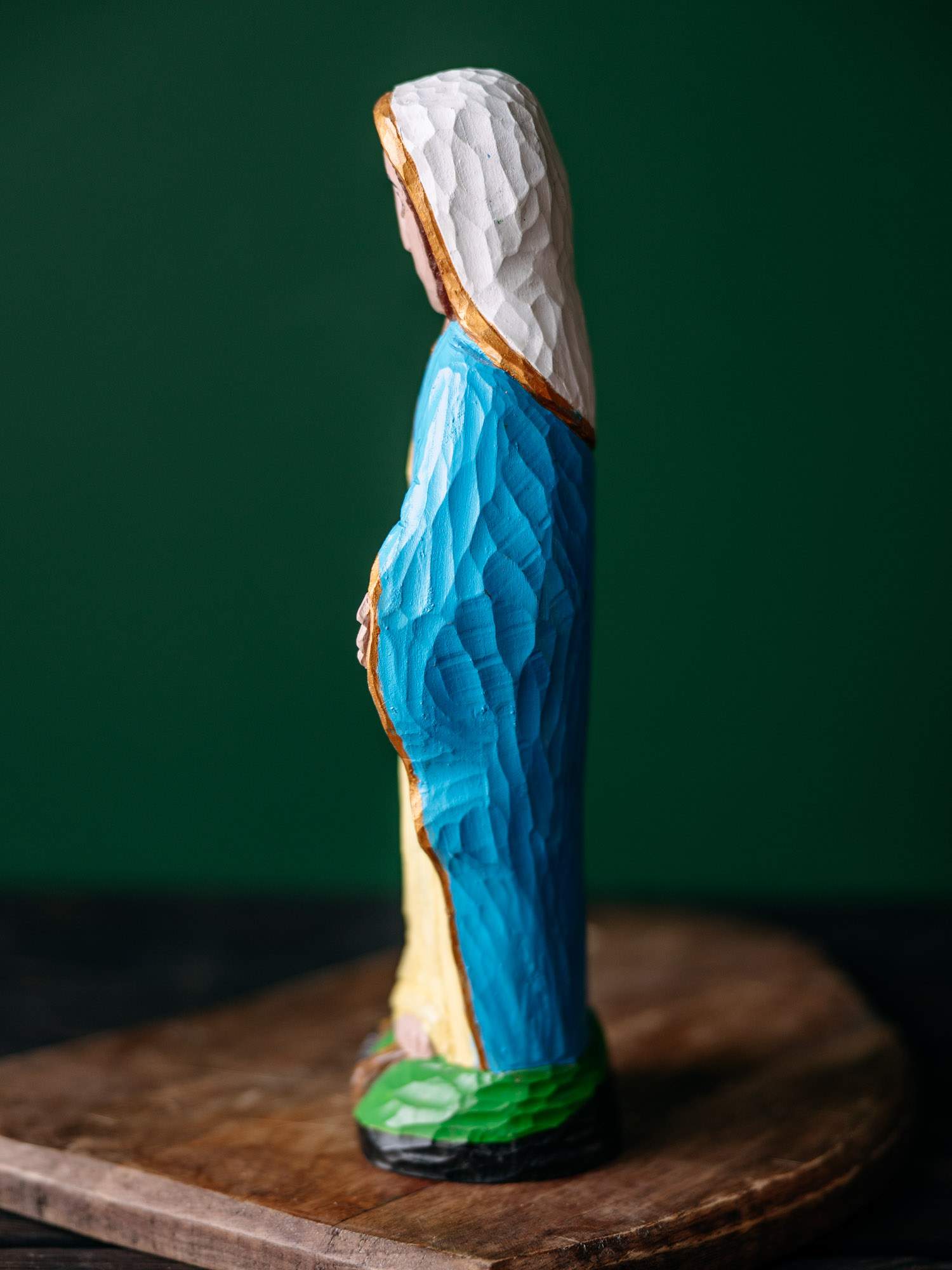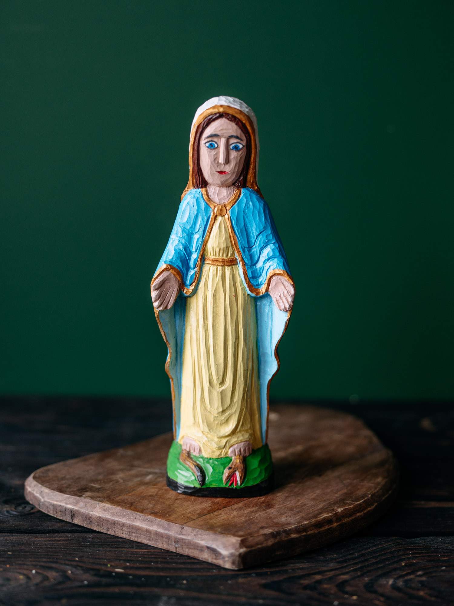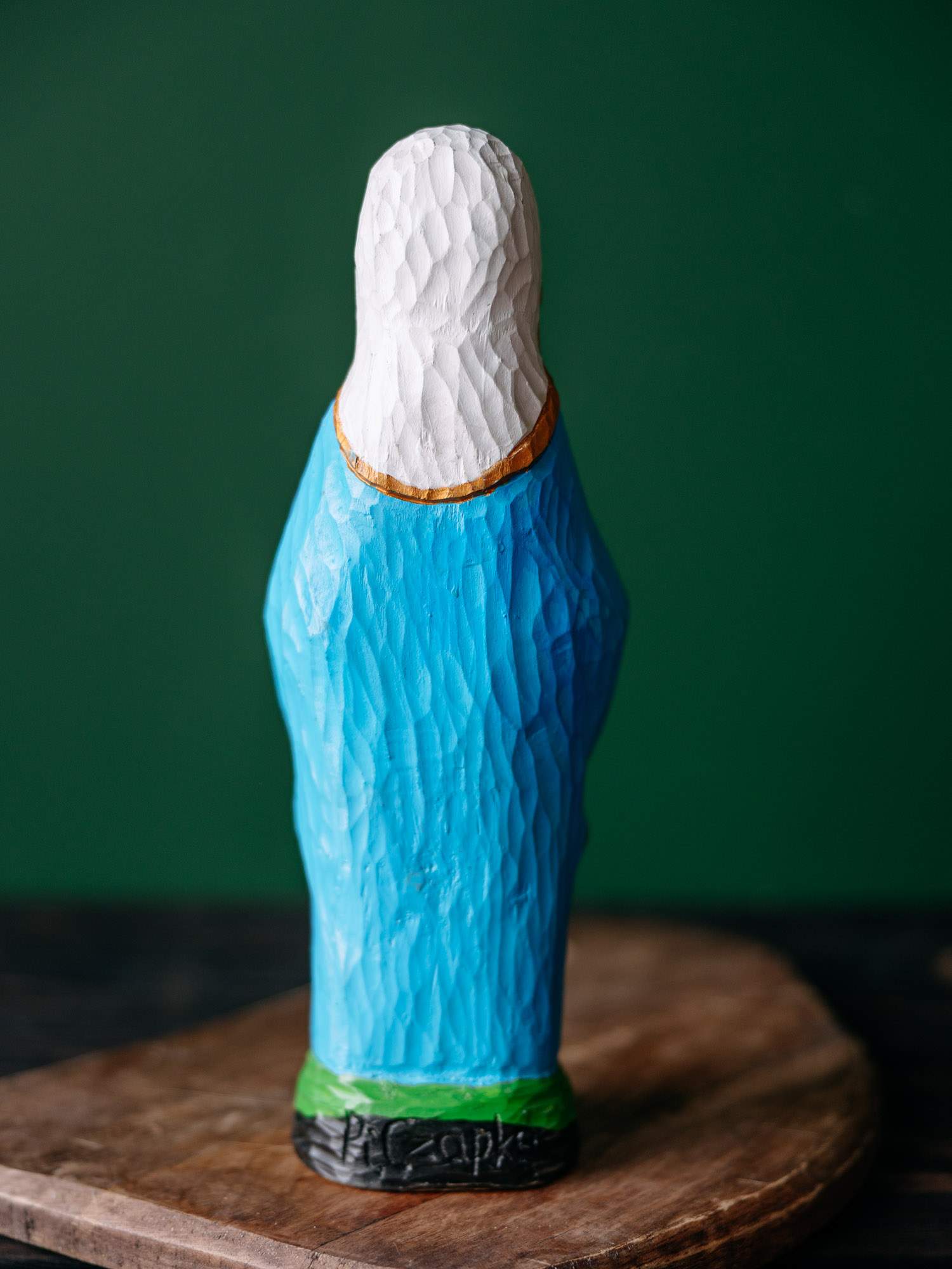 Rzeźbiona Matka Boska w niebieskiej szacie - wąż u stóp