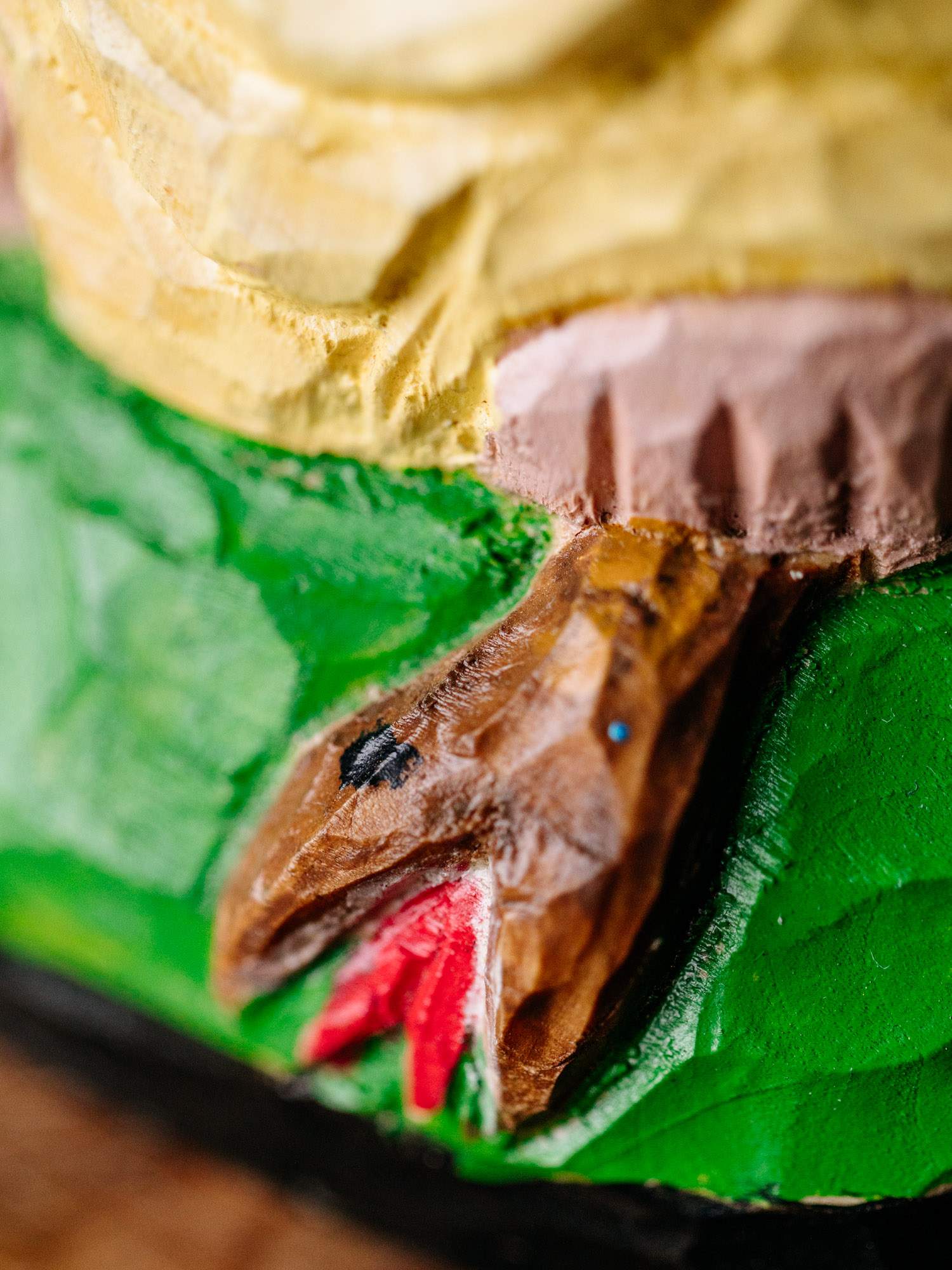 Figura Matki Boskiej z wężem u stóp, wykonana z drewna. Ręcznie rzeźbiona i malowana.
