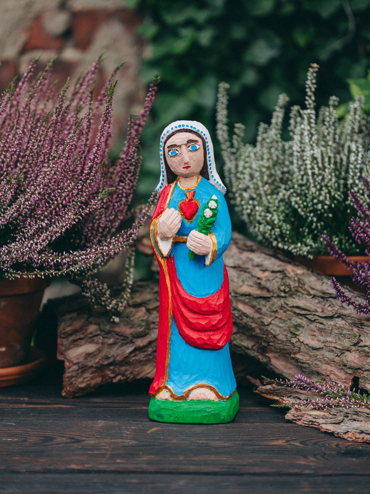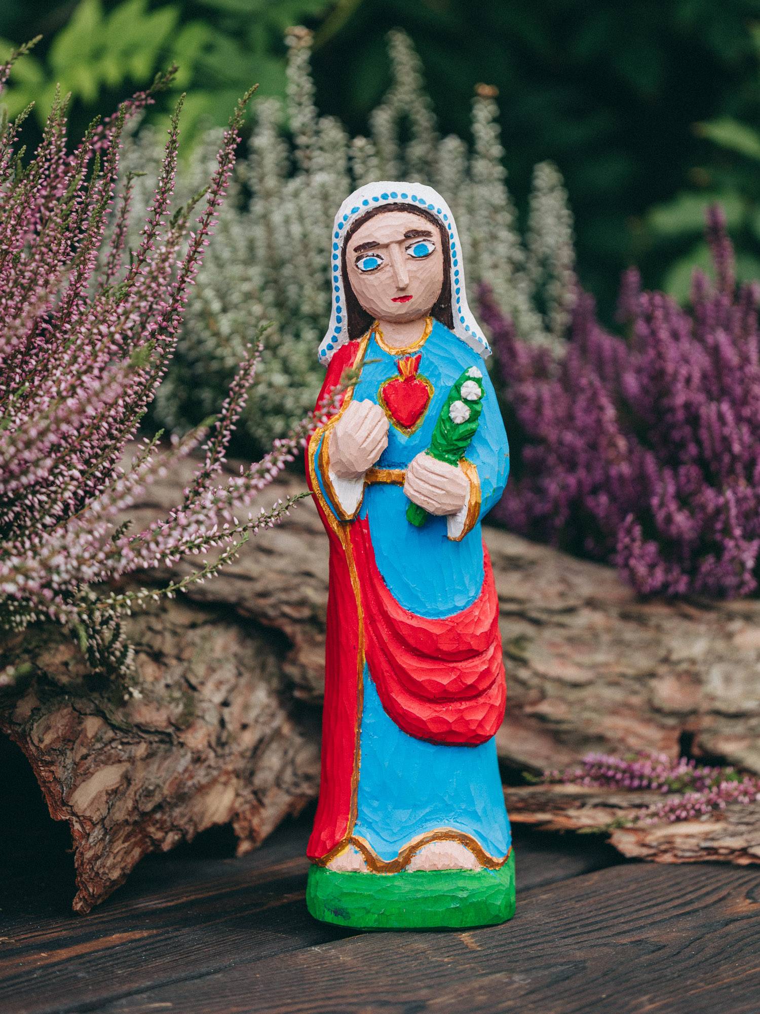 Ręcznie wykonana rzeźba przedstawiająca Matkę Boską z gorejącym sercem i gałązką lilii.