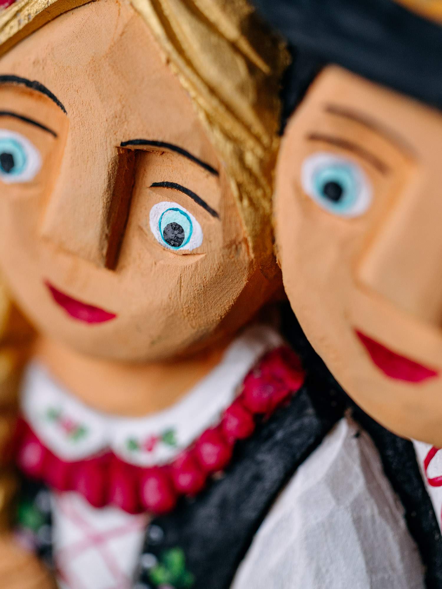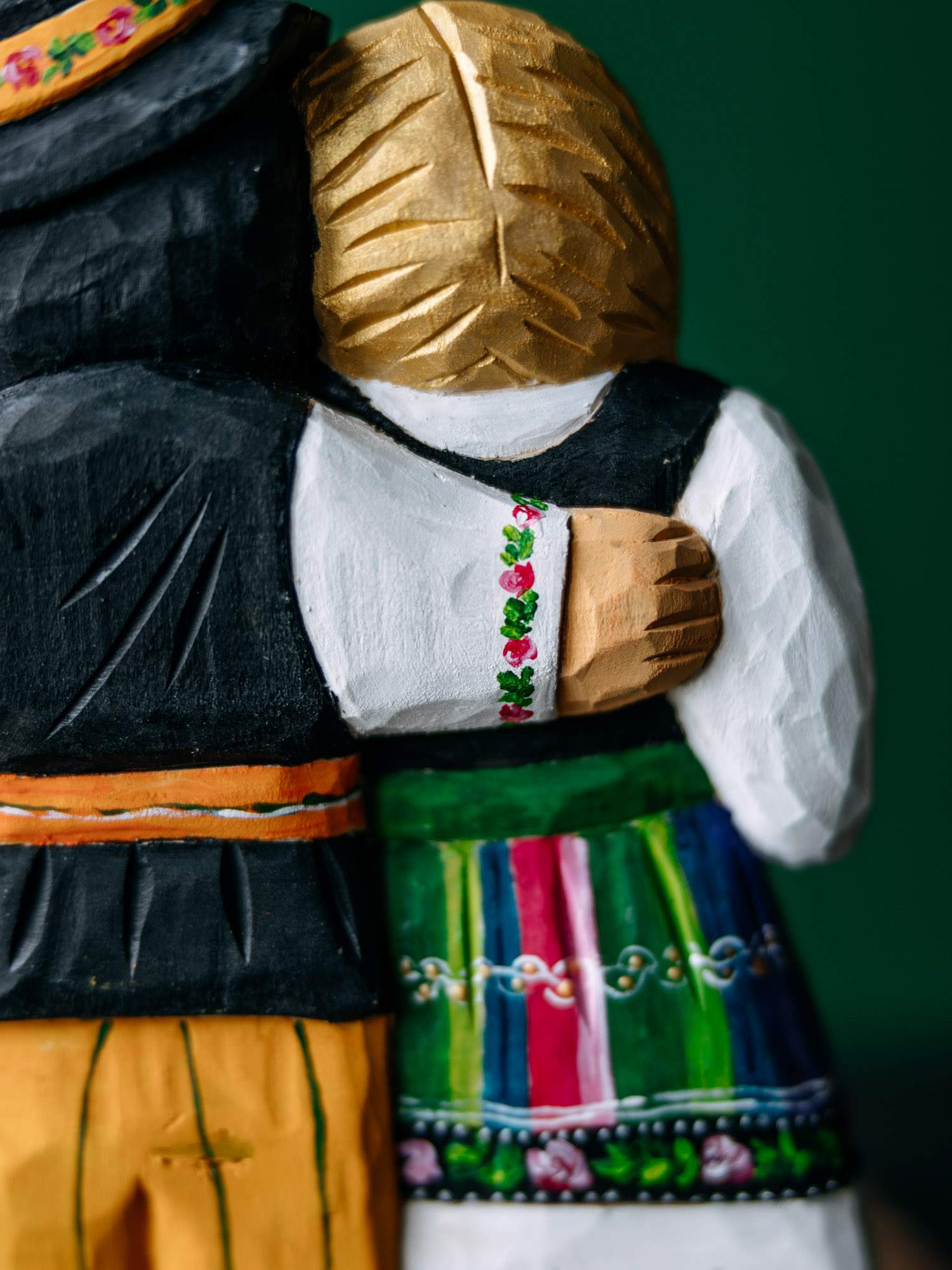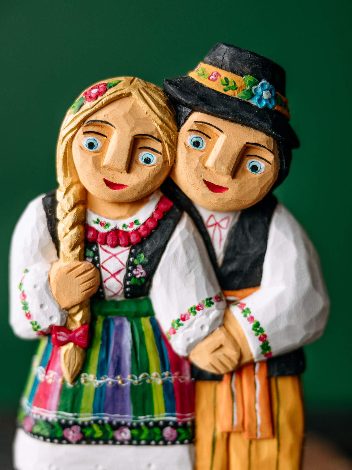 Drewniana rzeźba przedstawiająca parę w tradycyjnym stroju łowickim.